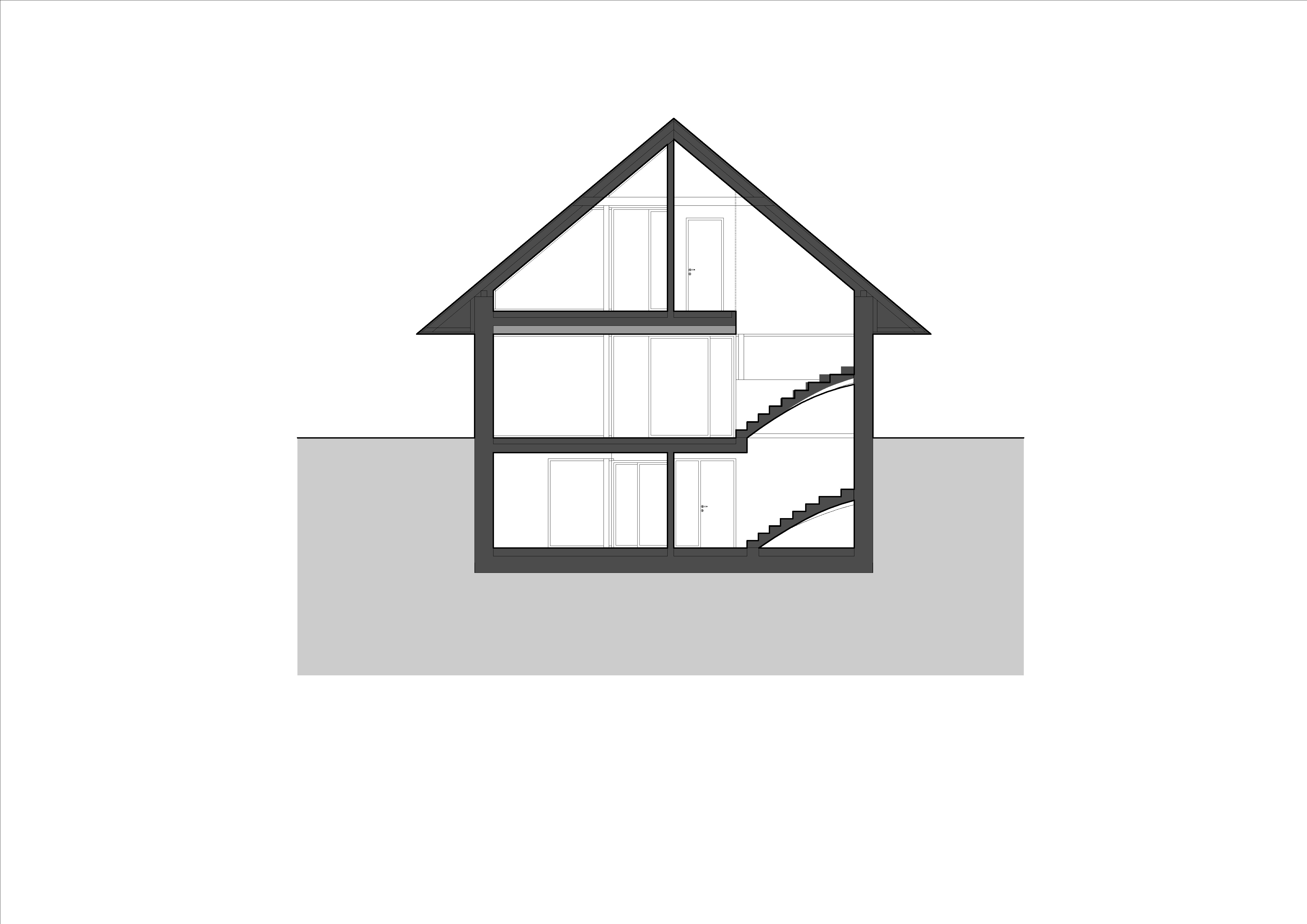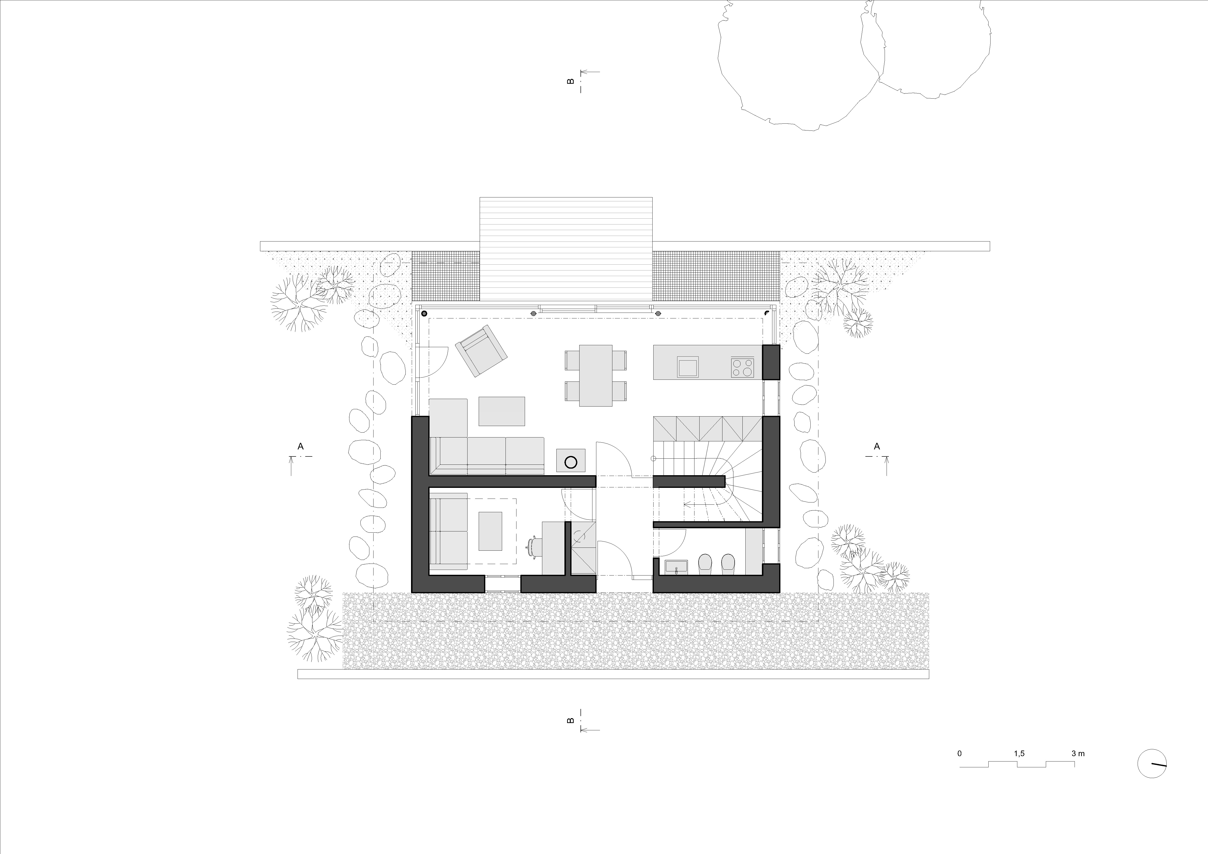 건물은 대지의 남동측에 배치되었고, 출입은 동쪽에서 이루어진다. 현관은 바람과 비로부터 보호되도록 계획되었으며, 진입 후 바로 거실 공간으로 연결된다. 거실은 파노라마 창과 서측 테라스로 이어지는 출입구를 갖춘 개방형 평면으로 구성되었다. 1층에는 이 외에도 서재, 욕실, 화장실이 배치되어 있다.