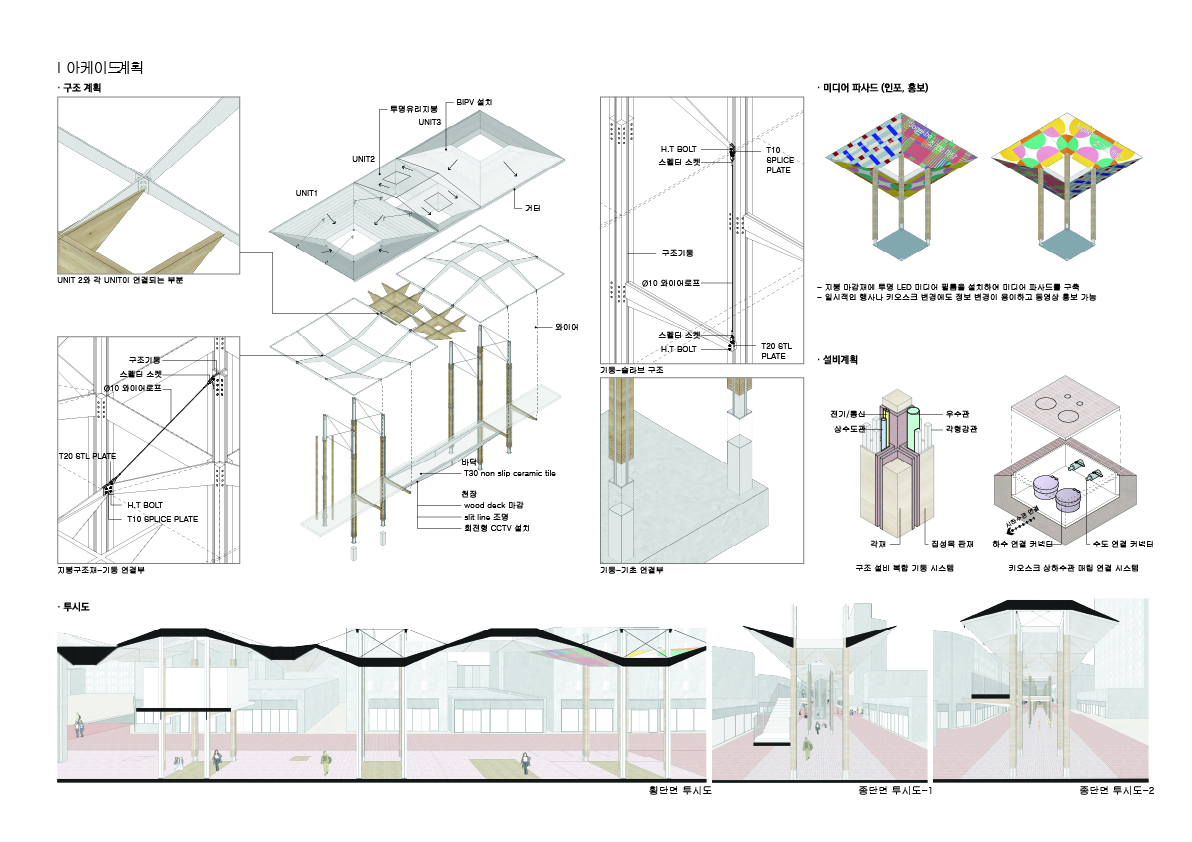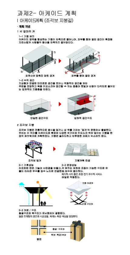 C구간은 파발교차로와 인접해 상대적으로 활기가 부족했던 지역으로, 이곳을 새롭게 활성화하기 위해 조각보 마당 + 아케이드 구조를 도입하였다. 전통의 ‘조각보’가 음식을 덮고 상 위를 가리는 덮개에서 출발하는 것처럼, 본 계획은 먹거리 중심의 도시적 프로그램을 품기 위해 이를 현대적으로 재해석한 입체적 지붕 구조를 제안한다. 지붕의 솔리드·반투명 패널은 빛과 그늘을 조절하며 독특한 공간감을 형성하고, 기둥을 안쪽으로 배치하여 열린 외부 경계?깊은 내부 공간이 자연스럽게 이어지도록 했다. 이 열린 공간 아래에는 1·2층 레벨을 활용한 다양한 유형의 키오스크(판매·조리·복층형)가 배치되어, 일상적인 식음 활동에서부터 축제·야간 먹거리 행사까지 확장 가능한 '먹거리 문화의 축(Food Culture Spine)'을 형성한다. 또한 조각보 마당은 A구간의 비움·B구간의 그린 테라스를 넘어 최종적으로 도시의 새로운 랜드마크적 경험을 제공하며, 선형 축의 종점을 강력한 목적 공간으로 만들어준다.