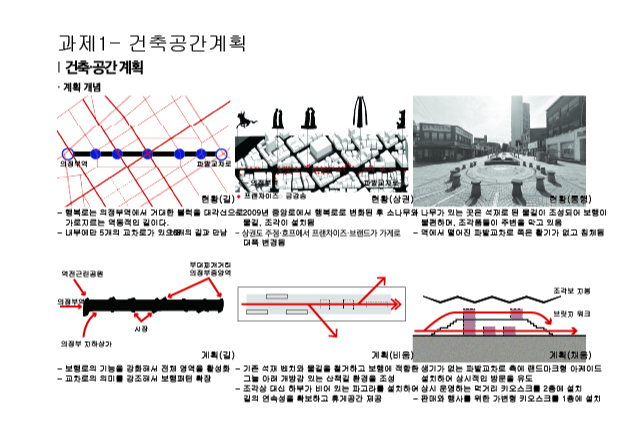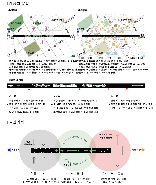 대지 분석 결과, 행복로는 내부에 5개의 교차로와 다수의 골목이 만나는 다층적 도시 네트워크를 이루고 있었다. 그러나 산책로로 활용되기보다는 통과형 동선에 머물고 있으며, 소나무 식재와 물길, 조각상 등으로 인해 시각적·물리적 장벽이 형성되어 있었다. 의정부역 방향은 프랜차이즈와 상업시설이 밀집해 활발하지만, 반대편 파발교차로는 상대적으로 유동인구가 적어 활성화가 시급한 지역이었다. 이와 같은 맥락 분석은 구간별로 필요한 기능과 개입 강도가 다르다는 점을 보여주었고, 이를 바탕으로 세분화된 공간 전략이 필요한 장소다.
