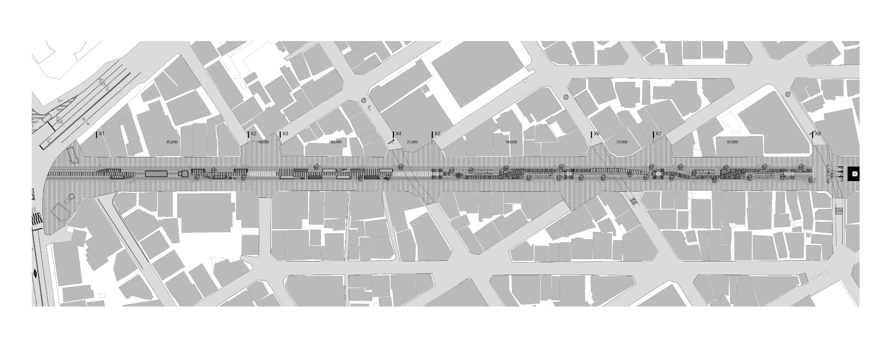 A구간은 의정부역과 직접 맞닿은 가장 개방적이고 유동인구가 많은 구간으로, 이곳의 중요한 기능은 ‘채우기 이전에 비우는 것’이다. 기존의 보행 장애 요소를 제거해 넓고 단순한 바닥면을 확보하고, 그 위에 이벤트·전시·플리마켓·푸드트럭·일시적 키오스크 등이 유연하게 결합될 수 있는 플러그인형 도시 플랫폼을 제안한다. 이 비움은 단순한 공백이 아니라, 다양한 활동과 시민의 일상이 서로 자연스럽게 ‘플러그인’되어 축적되는 '도시적 장치(device)'로 작동한다. 시간대·계절·행사 유형에 따라 풍경이 바뀌며, 행복로의 ‘첫 장면’을 형성하는 대표적 환대 공간이 된다.