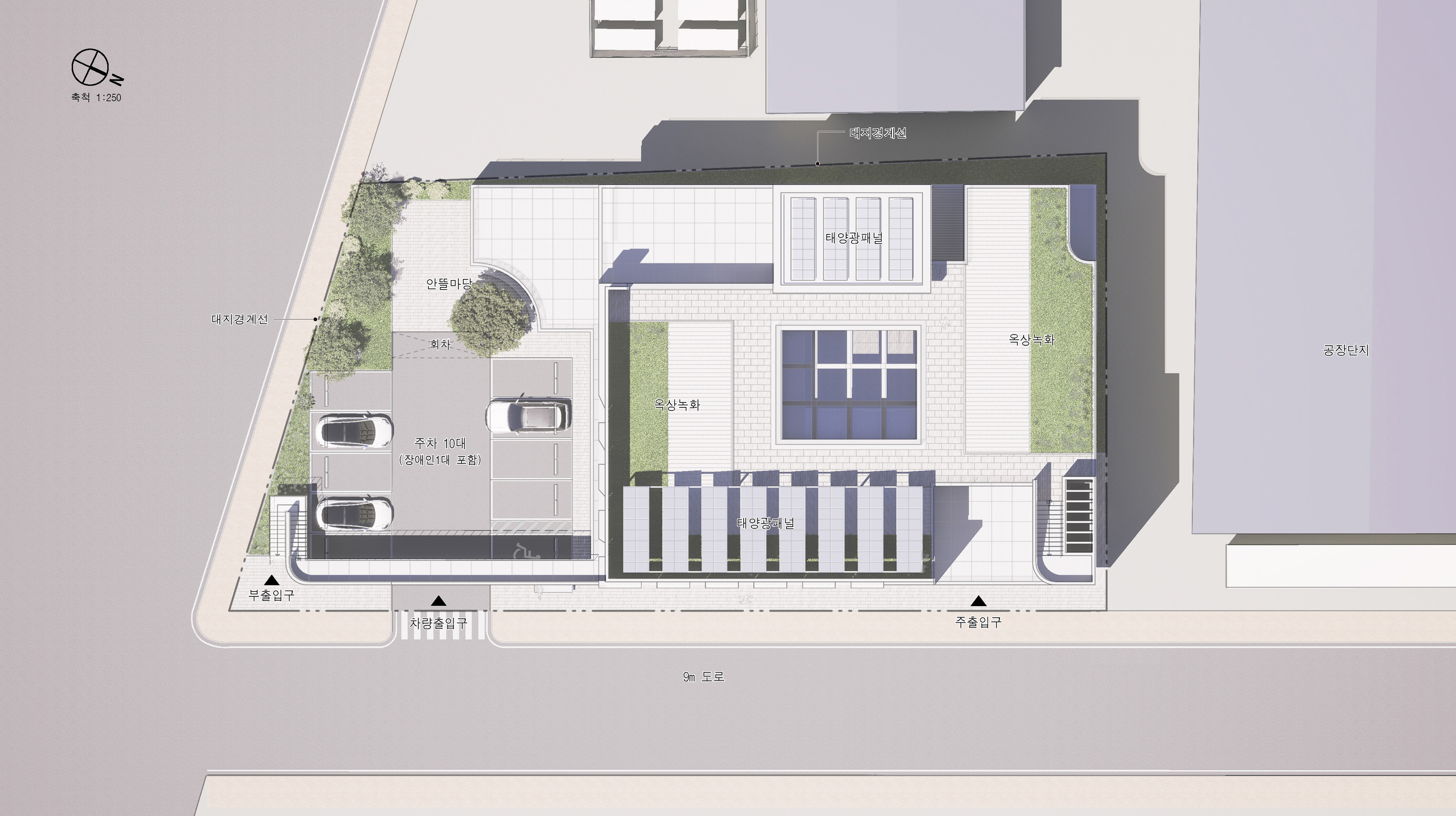 전면 약 9m 도로를 따라 진입하면, 차량과 보행자의 동선이 명확히 분리된 배치를 마주하게 된다. 차량은 대지의 장변을 따라 주차장으로 자연스럽게 유도되며, 좌측에서 진입하는 보행자는 외부 계단을 통해 곧바로 2층으로 연결되는 독립된 접근 동선을 가진다. 차장을 지나면 식당과 맞닿은 남향의 안뜰마당이 펼쳐지며, 중앙 식재와 그늘진 앉음터를 통해 식당 대기와 휴식이 공존하는 전환 공간을 형성한다. 부출입구 또한 가벽과 쉼터를 두어 자연스럽게 머무를 수 있는 그늘 공간을 제공한다. 건물은 대지 우측에 배치되며, 주출입구는 필로티를 통해 그늘과 여유를 확보한 진입 경험을 만든다. 전체 배치는 산업단지의 흐름 속에서 청년 근로자의 휴식과 문화 활동이 자연스럽게 이어지는 열린 장소성을 구현한다.
