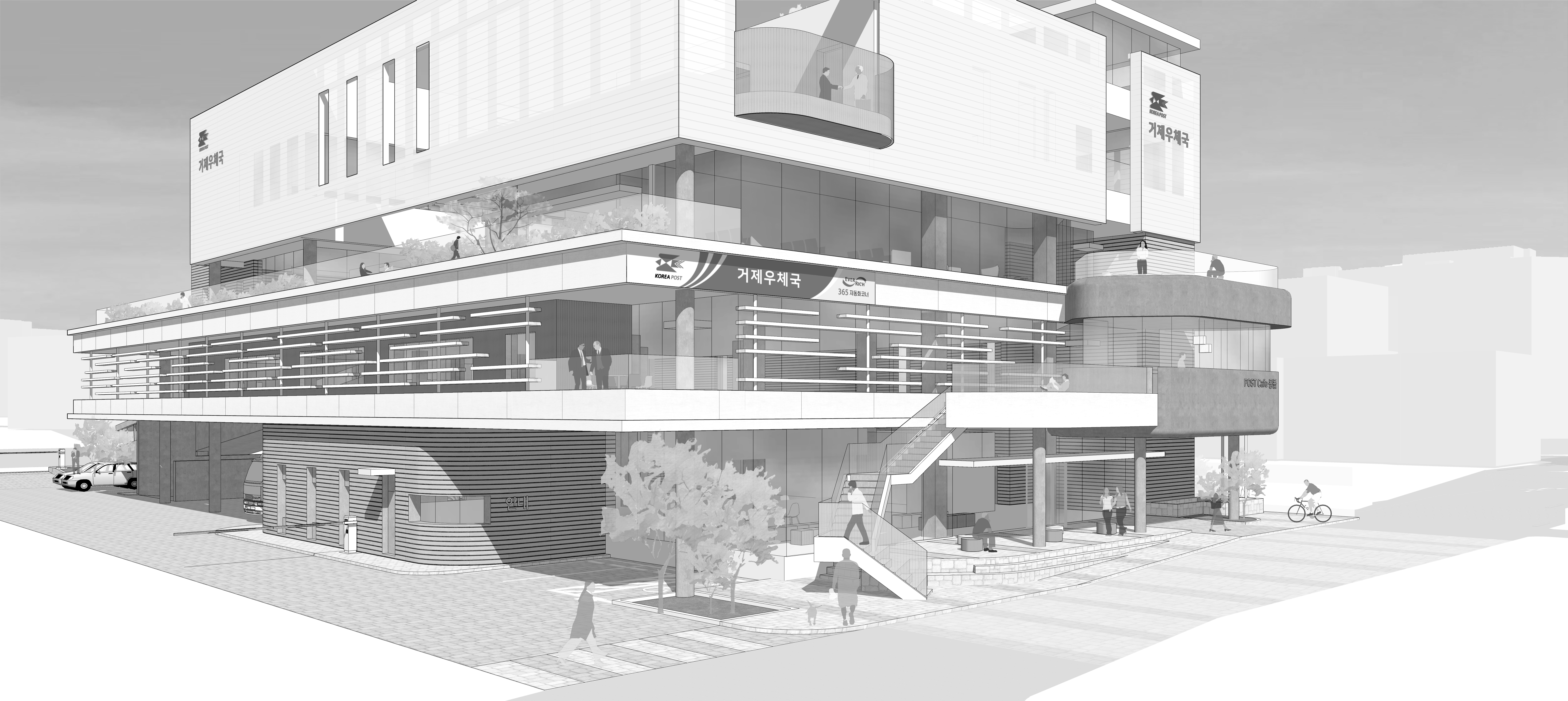 거제우체국의 디자인 콘셉트는 ‘거제의 이야기를 담는 우체국’입니다. 거제의 지형과 문화, 그리고 이 일대를 오가는 사람들의 일상적 움직임을 건축적으로 풀어내고자 했습니다.