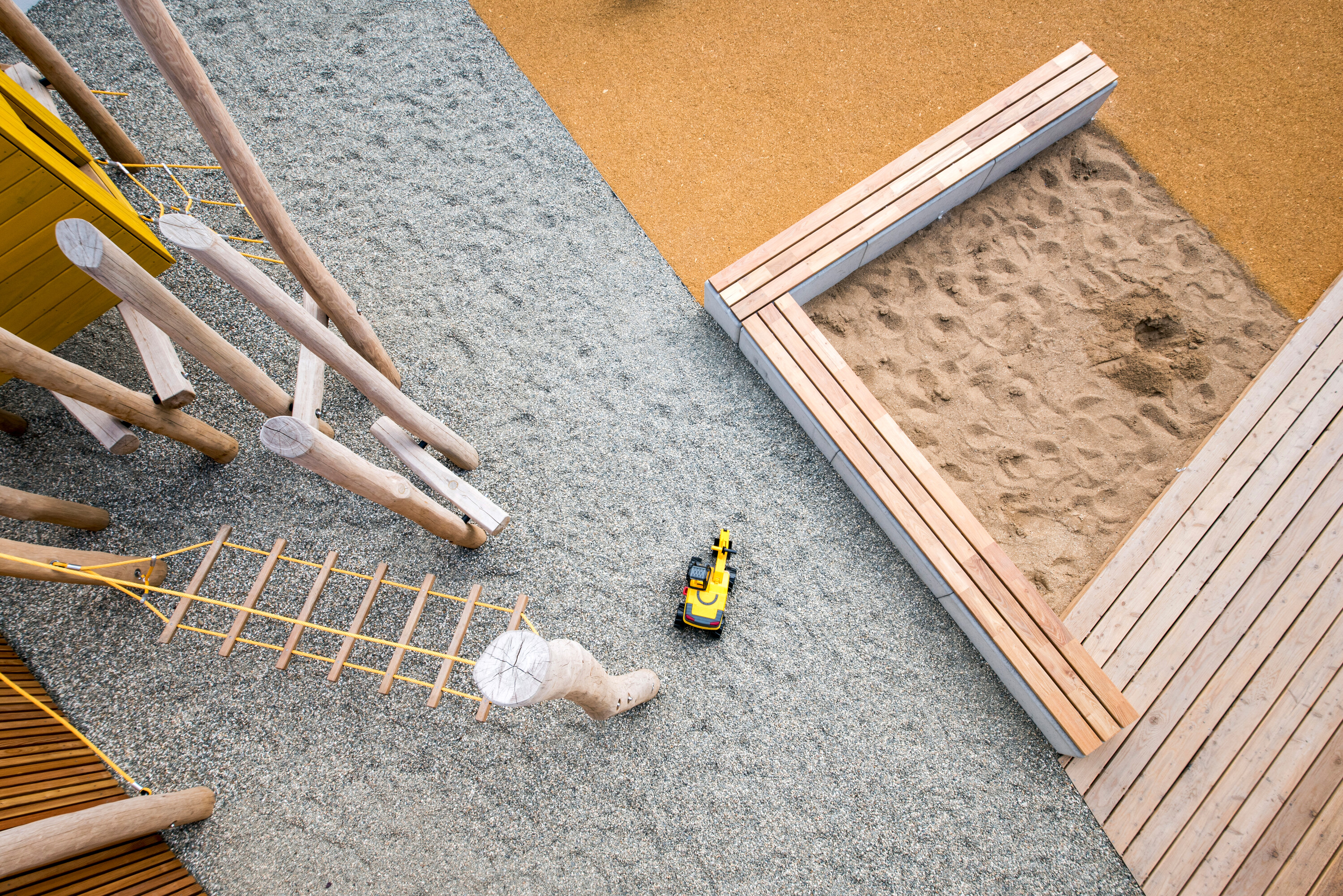 비록 정원의 규모는 크지 않지만, 동측의 아카시아 목재 놀이 구조물과 나선형 계단, 교실과 직접 연결된 테라스와 모래 놀이터, 남측의 작은 무대와 놀이집, 중앙의 벚나무까지 유치원에 필요한 모든 요소를 갖추고 있다. 서로 다른 재료와 경계로 구분된 정원의 영역들은 놀이와 활동을 풍부하게 만들면서도 관리가 용이한 환경을 제공한다.
