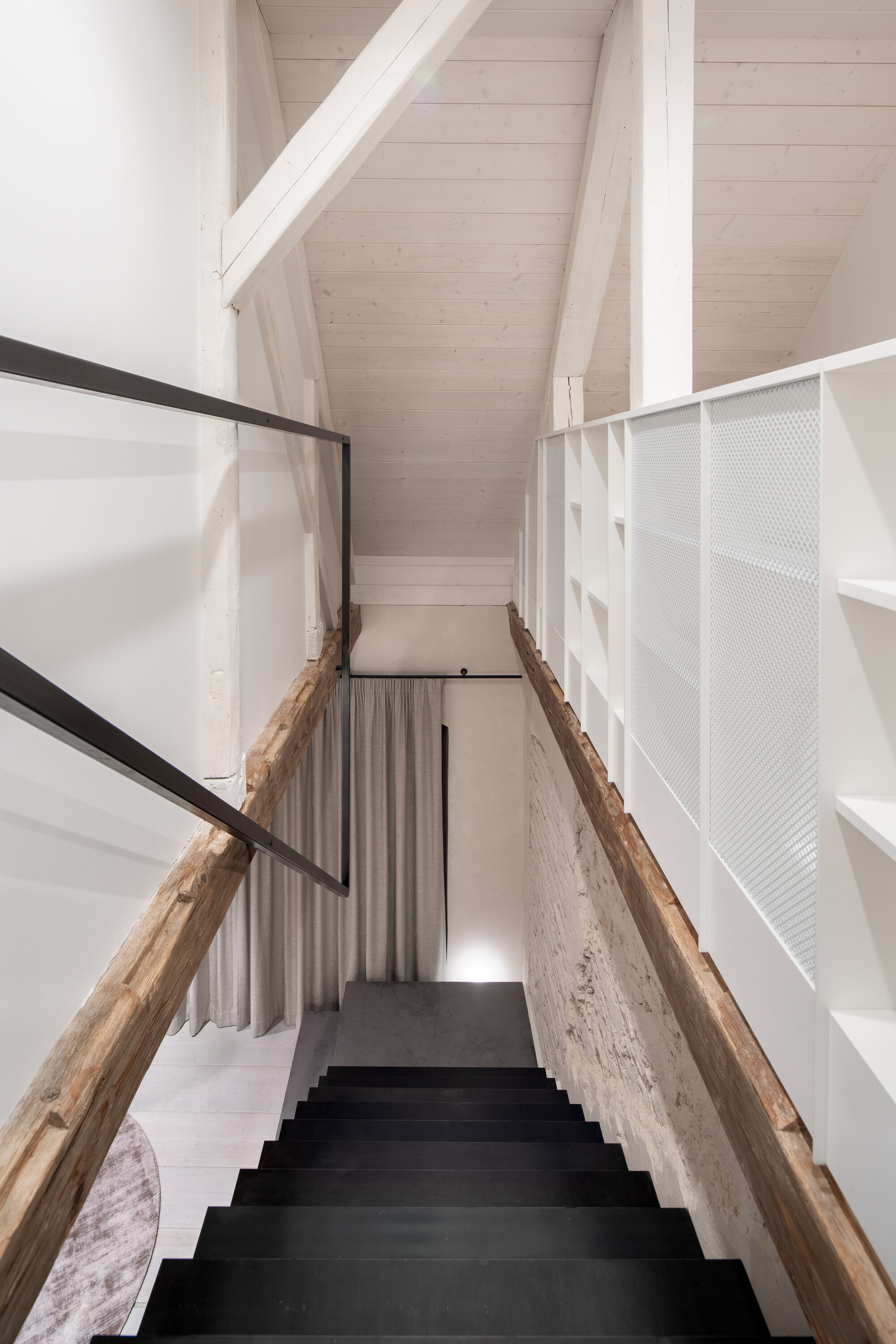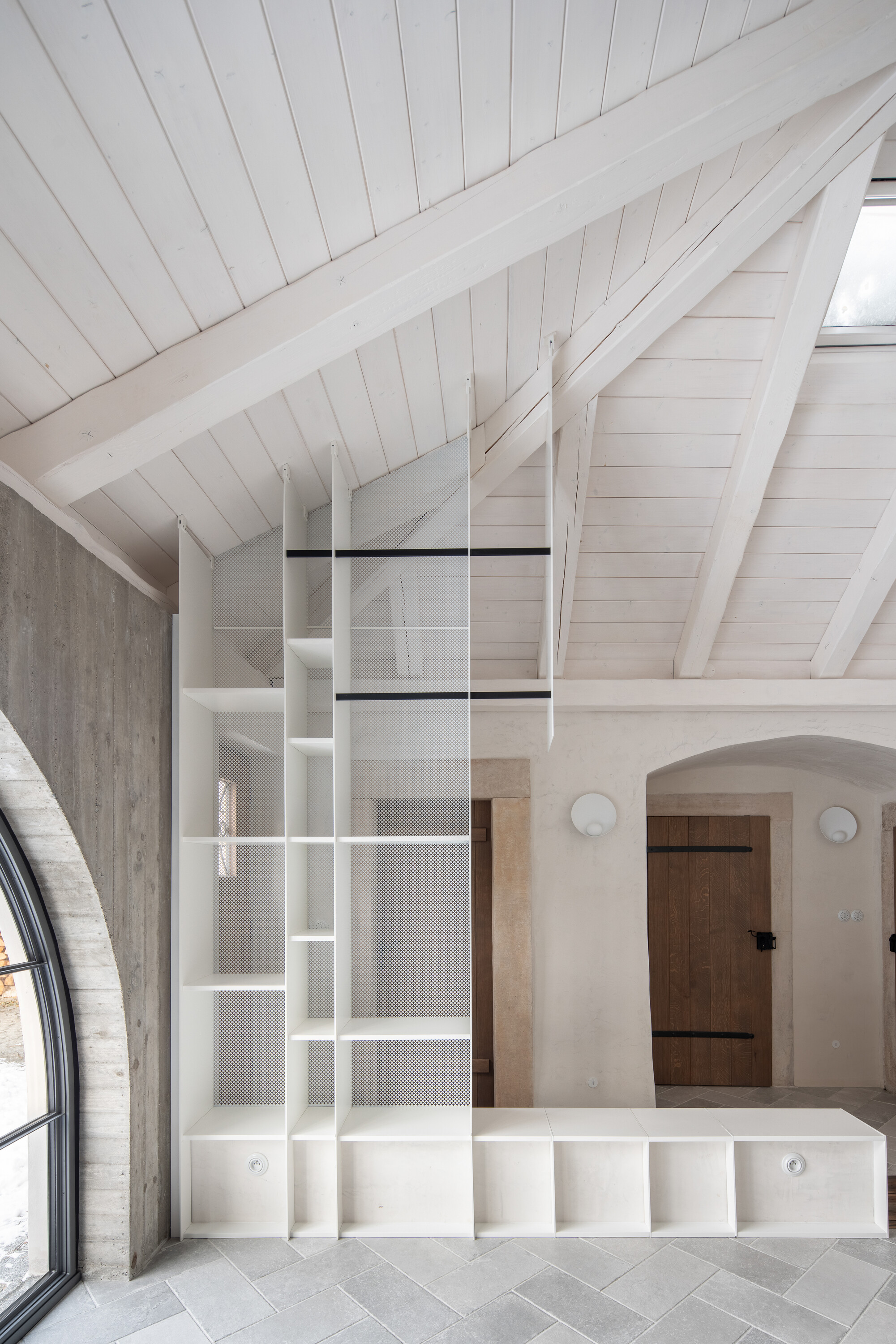 ‘흐라드비(Hradby)’ 프로젝트는 스튜디오의 대표적인 리노베이션 작업 가운데 하나다. 중세까지 거슬러 올라가는 역사를 지닌 성벽 수문장 주택으로, 1층에는 볼트 천장, 상층에는 채색된 목조 천장과 원형 타일 난로가 남아 있는 건물이었다. 무엇보다도 기존 요소를 존중하며 신중하게 접근한 건축주의 태도가 이 프로젝트를 가능하게 한 중요한 조건이었다. 목표는 가능한 한 많은 원형 요소를 복원하고, 현대적인 내부 공간을 절제된 방식으로 덧입히는 것이었다.