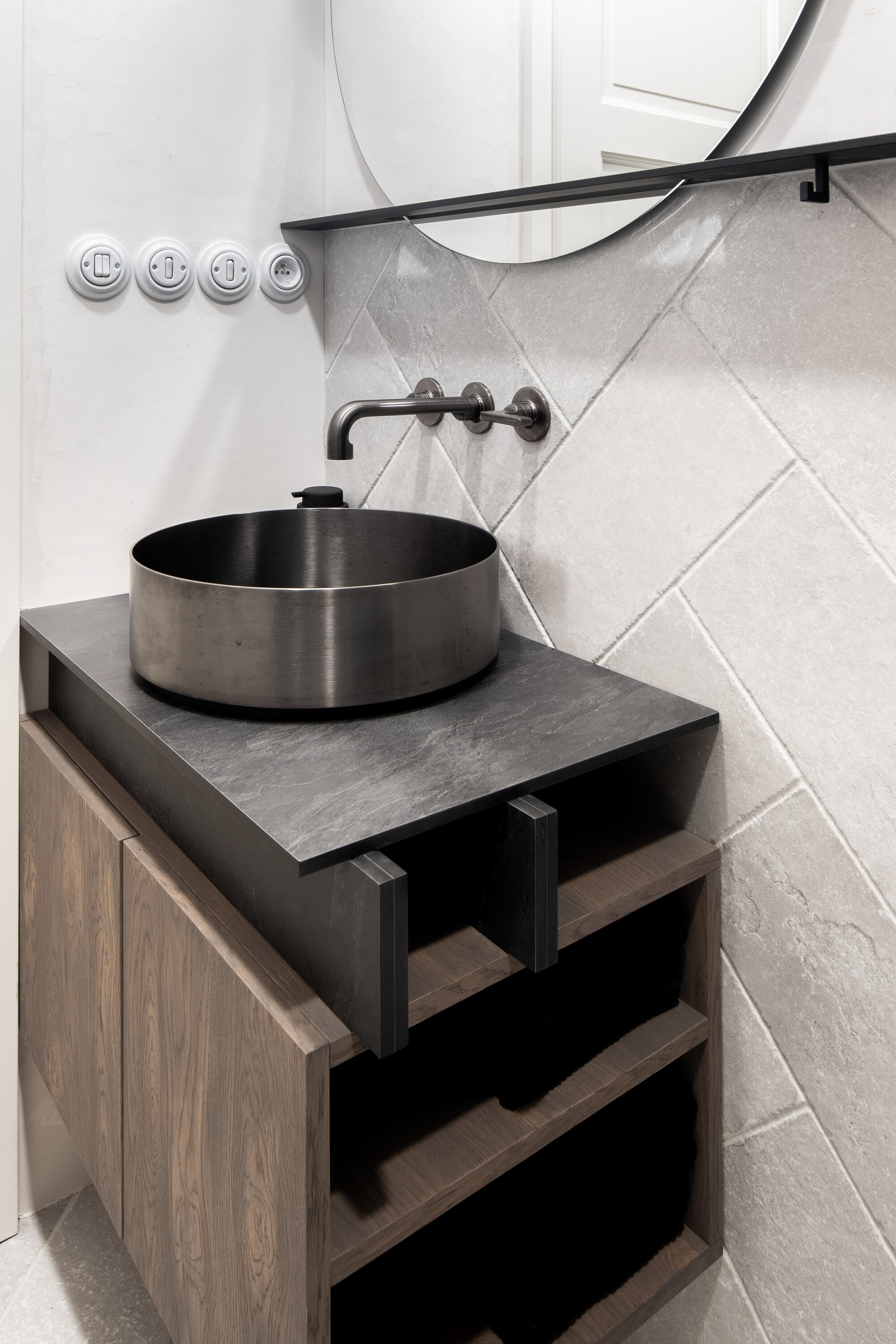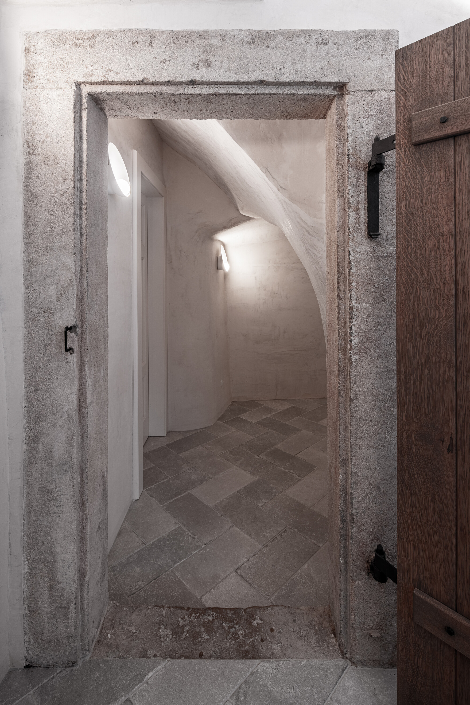 이와 같은 역사적 석조 건물에서 흔히 그렇듯, 1층은 심각한 습기 문제를 안고 있었다. 석조 외벽은 과도하게 젖어 있었고, 이에 따라 기존 미장을 제거해 석조와 볼트를 드러내 구조가 ‘숨 쉴 수 있도록’ 했다. 외벽 하부에만 재생 미장을 적용했고, 이는 벽체의 습기를 최대한 배출하기 위해 여러 차례 반복 시공되었다. 내부의 다른 미장 면은 글레이징 처리 후 정밀 연마해, 빛에 따라 반사와 질감이 살아나는 표면을 완성했다.