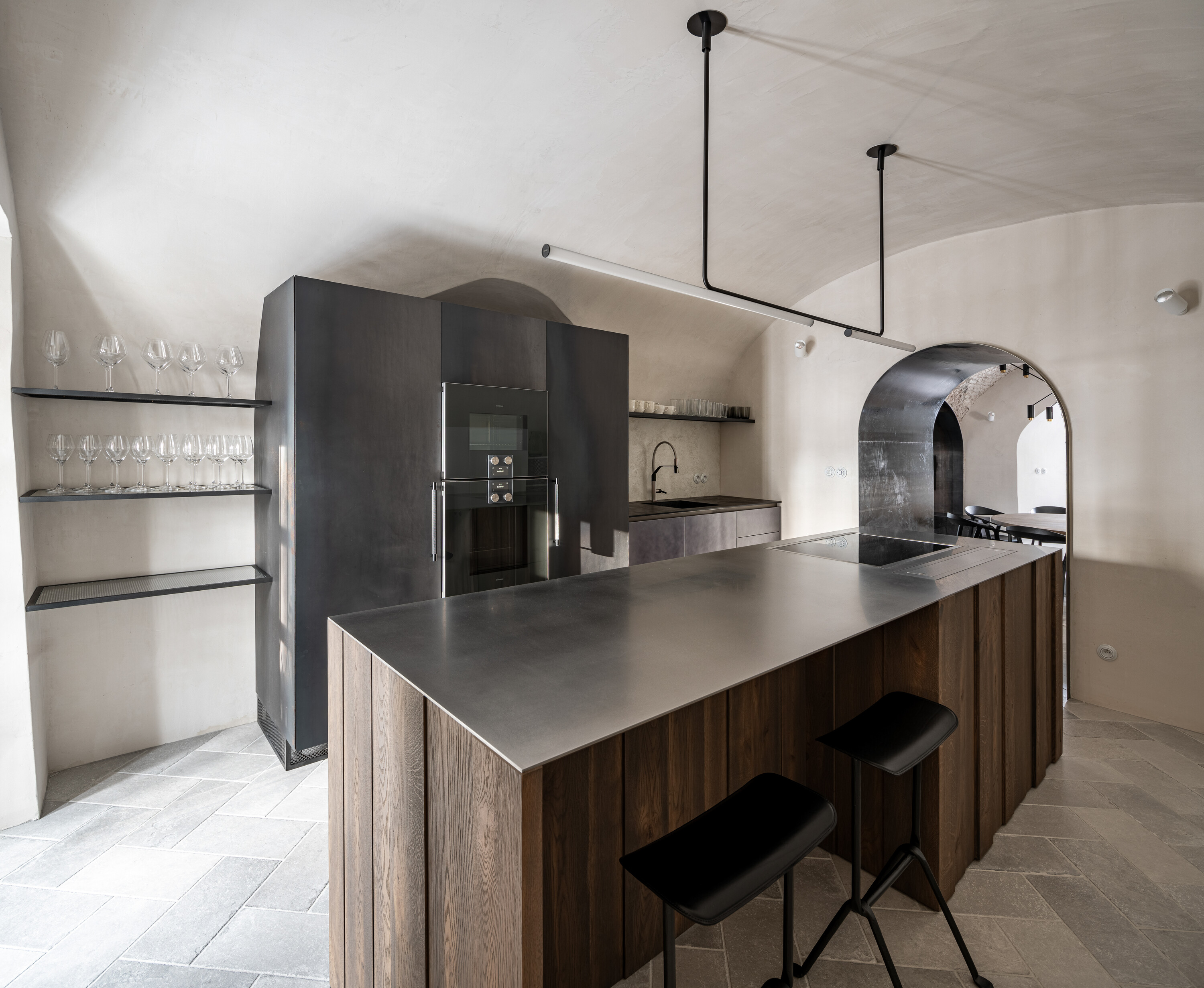 볼트 공간 속 주방은 아치 형태를 존중하는 맞춤형 가구로 구성되었으며, 모든 가구는 환기가 가능하도록 설계되었다. 중앙 아일랜드는 원목에 스테인리스 상판을 얹었고, 나머지 가구에는 스틸 도어가 적용되었다.
