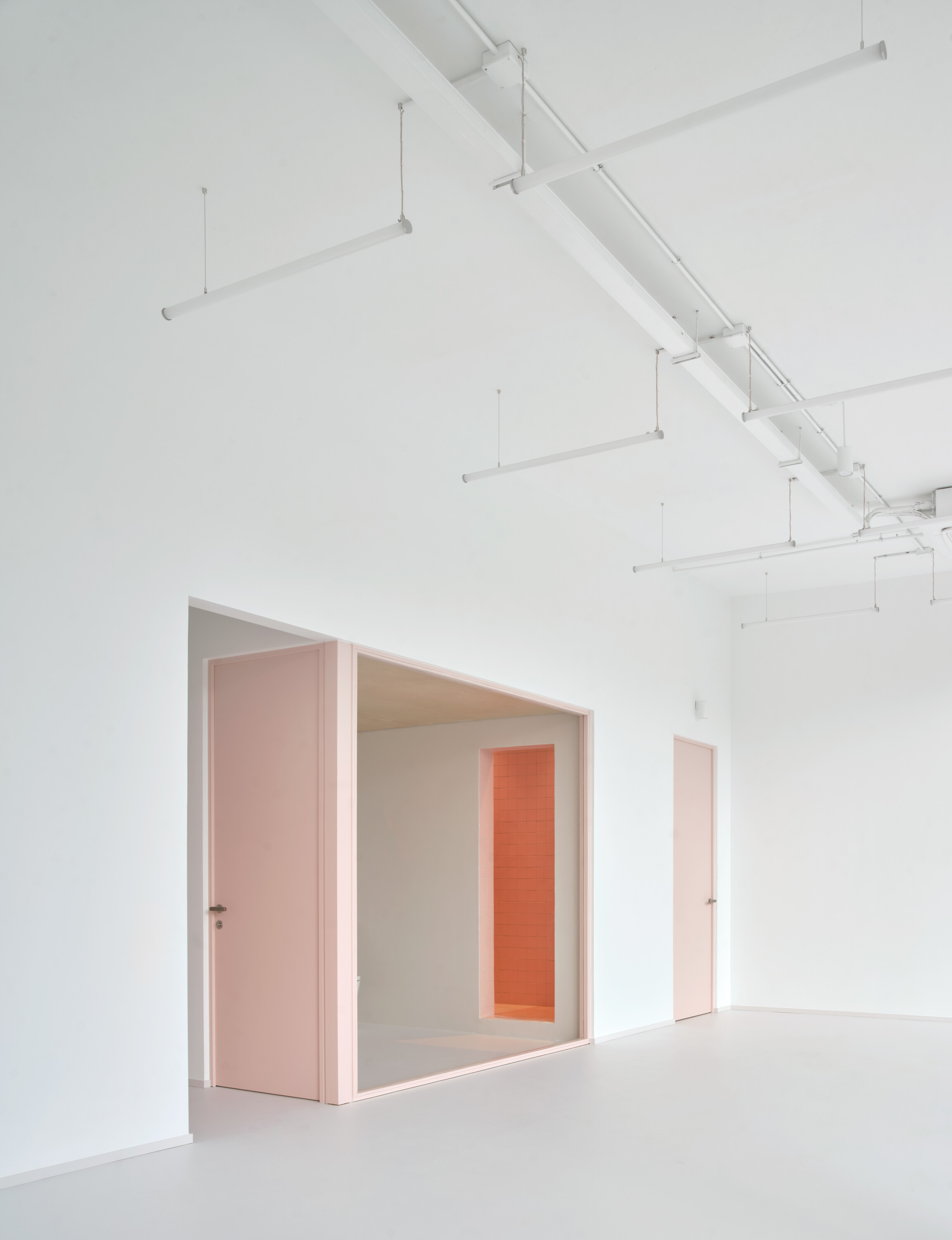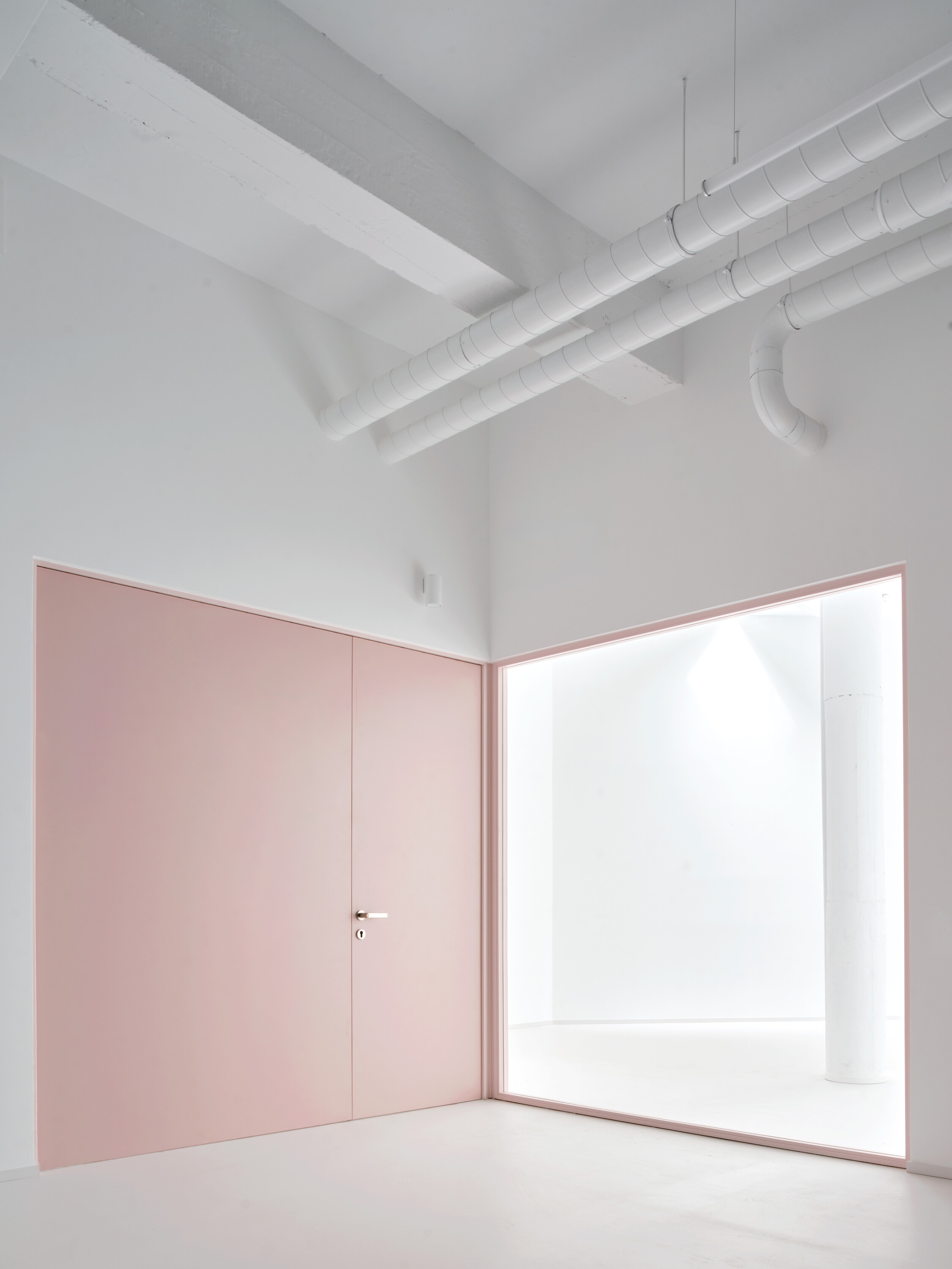 전체 공간은 백색을 기본으로 하되, 회색 바닥, 분홍 프레임의 파티션, 연한 하늘색 가구, 그리고 일부 소규모 공간에 적용된 자작나무 천장 등으로 부드럽게 변주된다. 이러한 색채와 재료의 선택은 건축가들이 어린 시절을 보낸 이 해안 도시와의 개인적인 정서적 연결, 그리고 동시대 작가들의 작업에 깊이 관여하는 수집가의 순수하고도 섬세한 시선을 함께 반영한다.