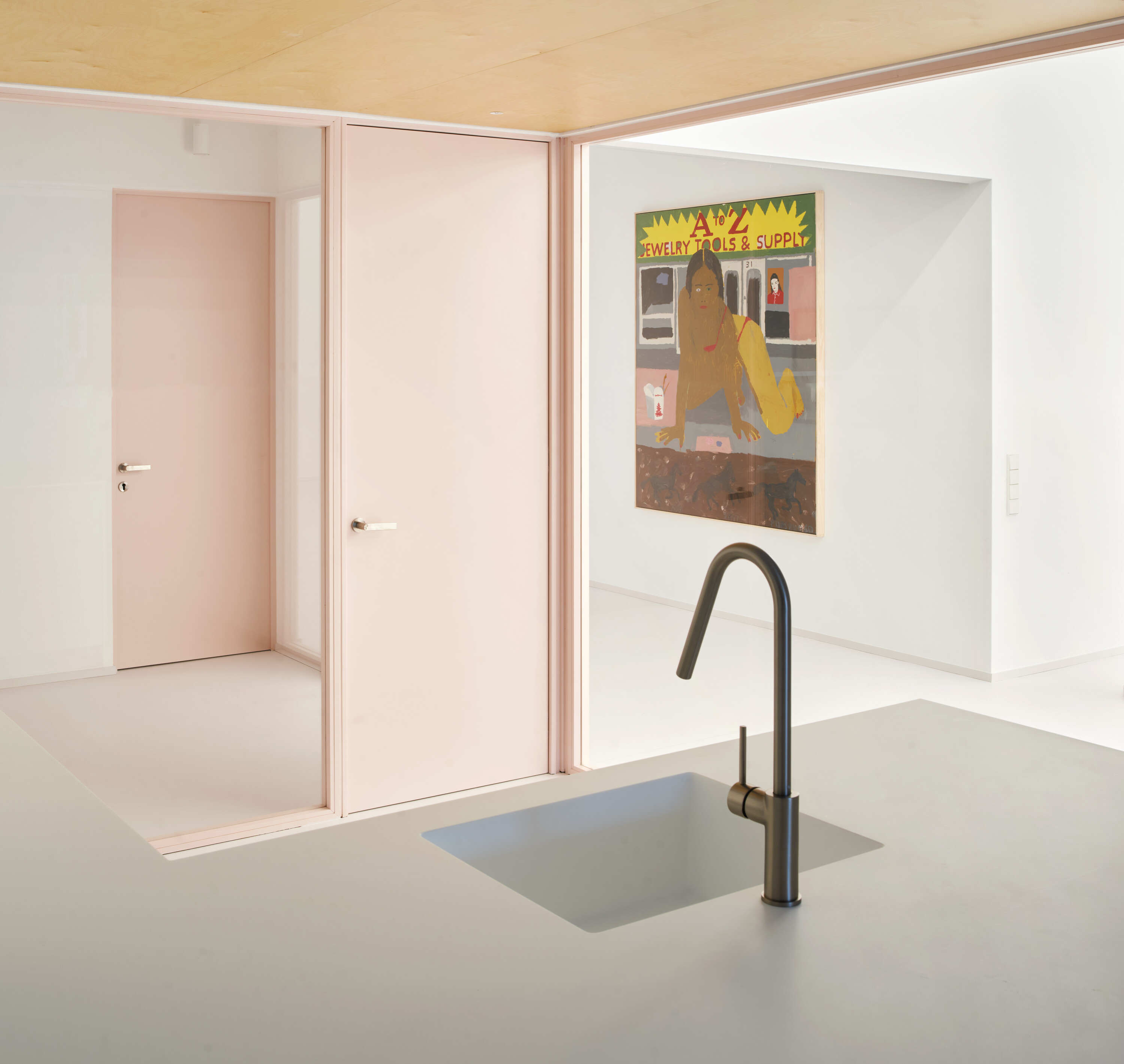주방, 욕실, 수장고와 같은 보다 실용적이고 사적인 공간들은 전시 공간과 분홍색 프레임을 두른 정사각형 유리 파티션을 통해 연결된다. 이 파티션은 공간 전반에 반복적으로 등장하며, 시선을 끊지 않고 이어줌으로써 어디에 있든 예술 작품이 항상 시야에 들어오도록 한다. 동시에 일상의 장면들—요리를 하거나 일하는 모습—은 마치 컬렉션 속 또 하나의 사진이나 회화처럼 프레임 안에 담긴다.