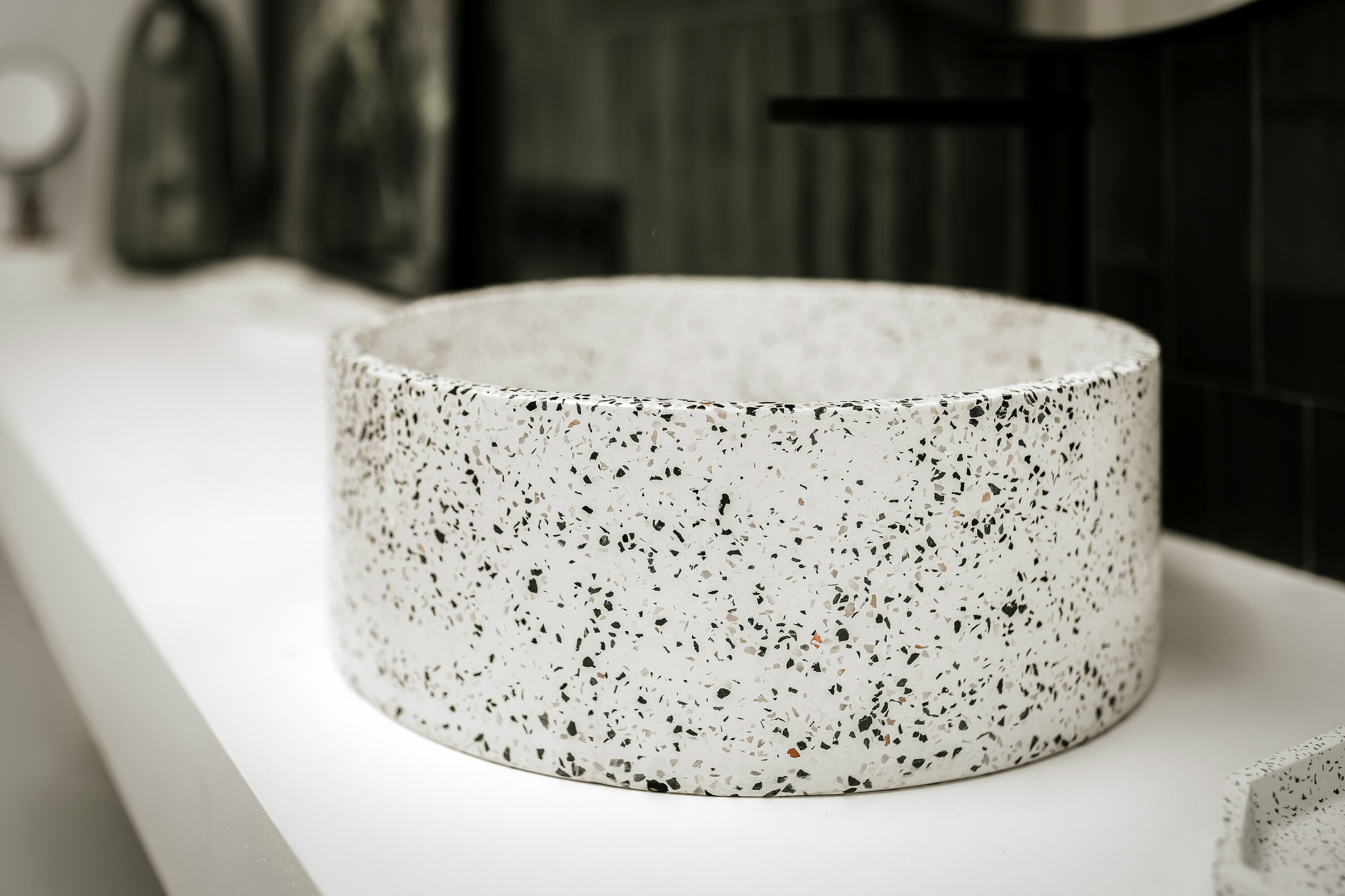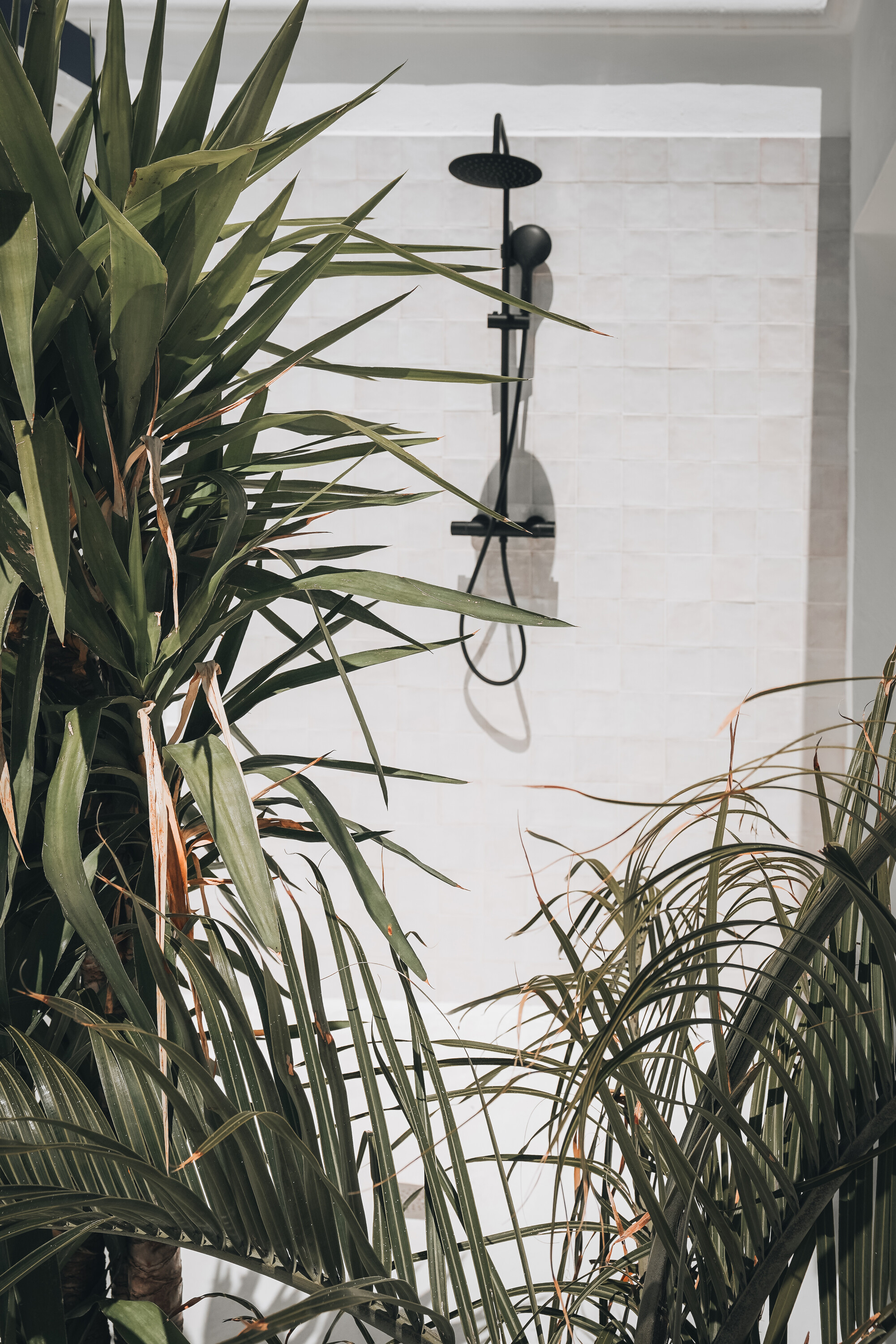 마감은 전면적으로 재정비되었다. 지역 환경에 적합하지 않았던 기존 목재 바닥은 모두 제거하고, 화이트 콘크리트 바닥과 백색 도장으로 통일했다. 욕실 벽에는 녹색 타일을 사용해 섬의 색채 규범을 실내로 끌어들였고, 현지에서 채취한 용암석은 욕실 세면대 하부 구조나 테라스의 시각적 포인트 벽으로 활용되었다. 두 개의 테라스에는 콘크리트 블록으로 바람을 막는 파티션을 새로 설치해, 동시에 시각적 차폐와 프라이버시를 확보했다.
