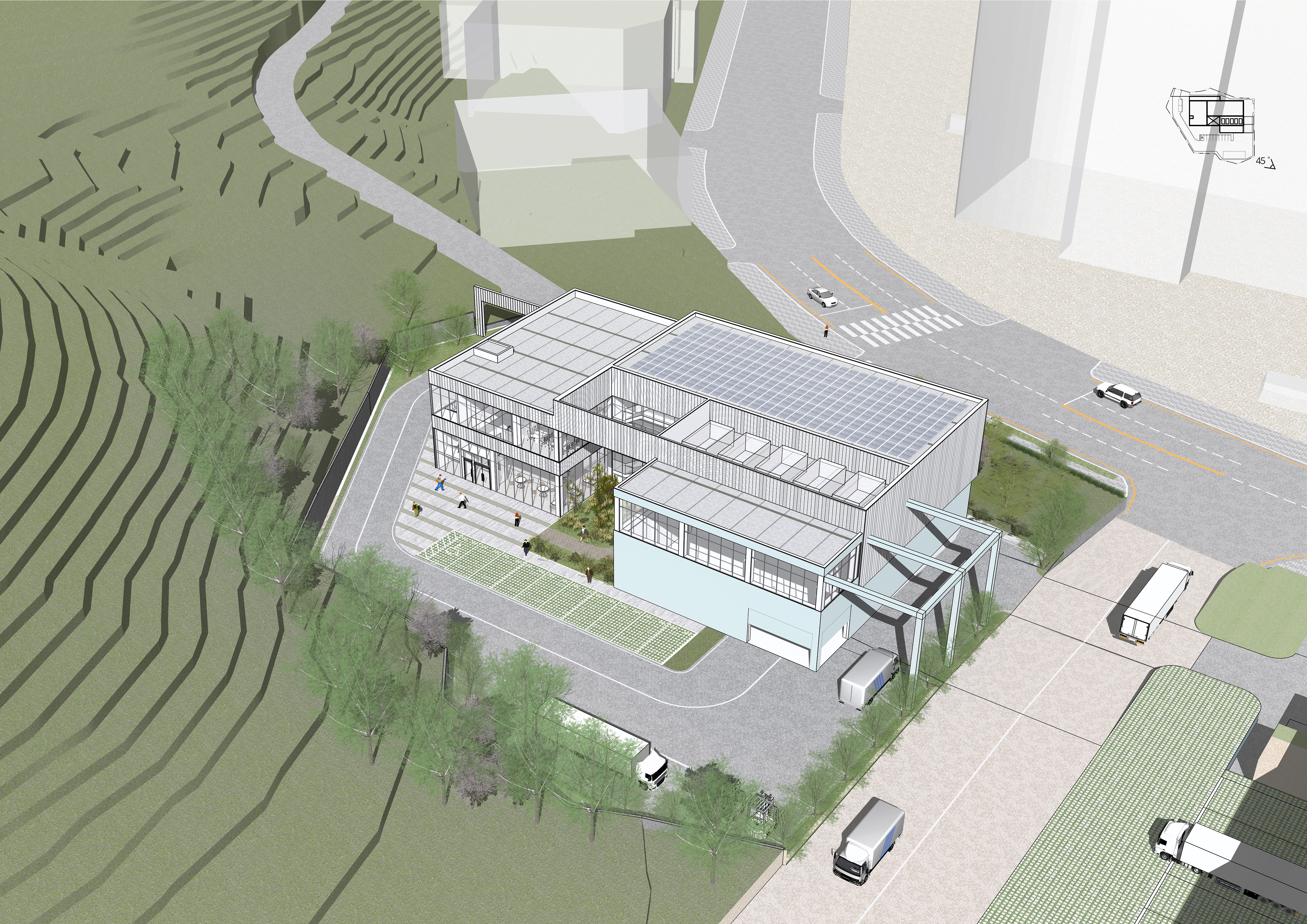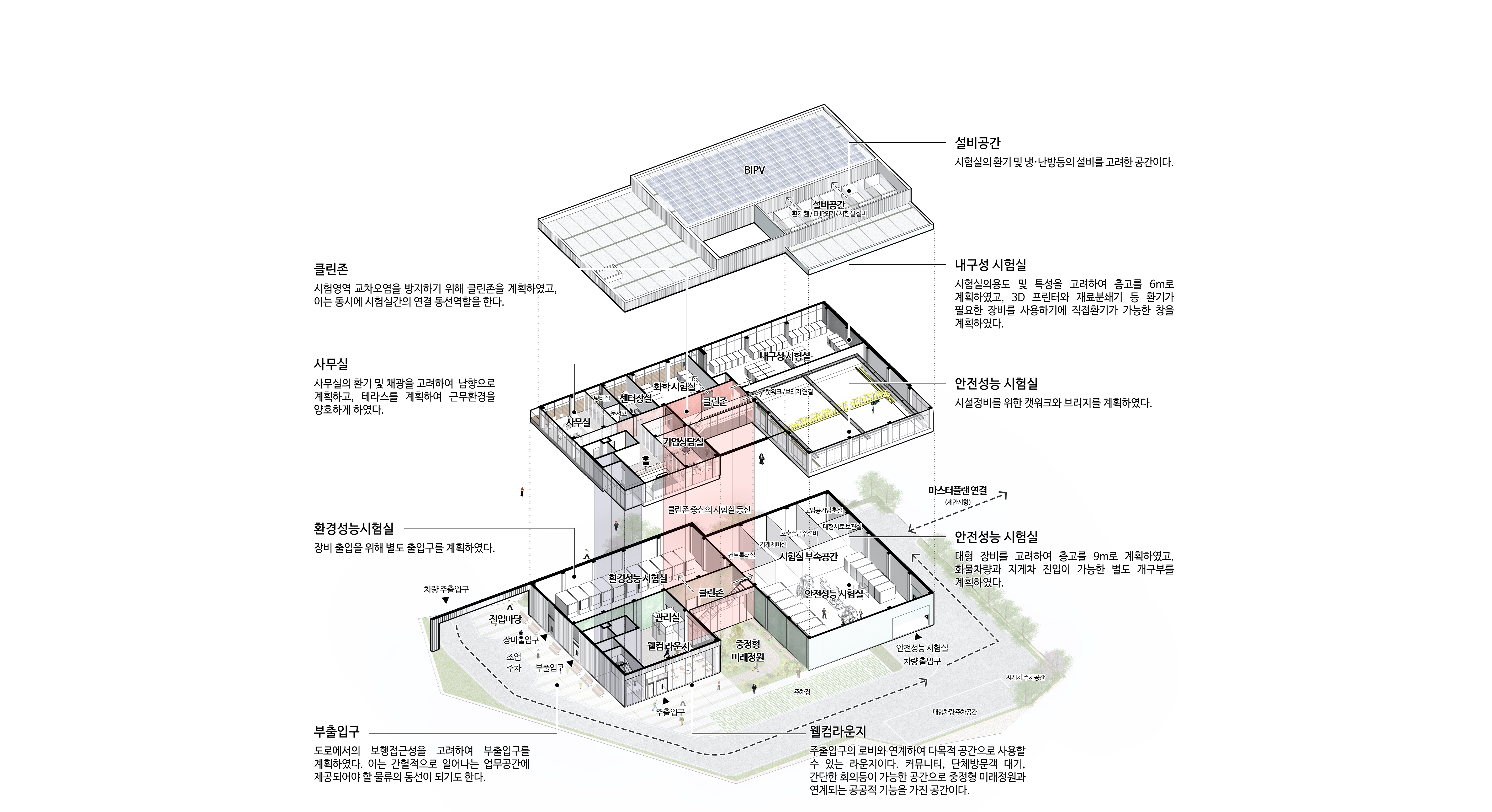 진입도로에서의 정면성을 위해 전면 공지를 계획하고, 진입마당과 차량진출입로를 분리하여 계획하였다. 전면마당의 주차장에서 접근이 가능한 어프로치 공간을 계획하고, 중정형 미래정원을 조성하여 휴게공간으로 사용할 뿐 아니라 내부의 공간에서 바라보는 중심경관을 제공하는 요소로 활용하였다. 로비와 상담실에서 조망이 가능하고, 시험실영역의 클린존에서 이동하면서 상시적으로 조망을 가능하게 계획하였다. 이는 근무환경을 양호하게 만드는 효과를 기대할 수 있다.