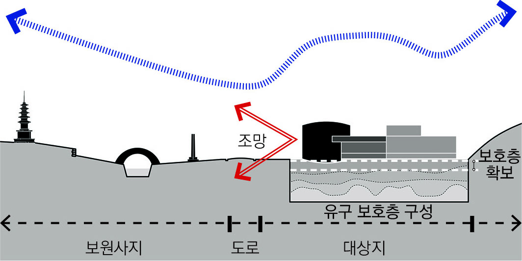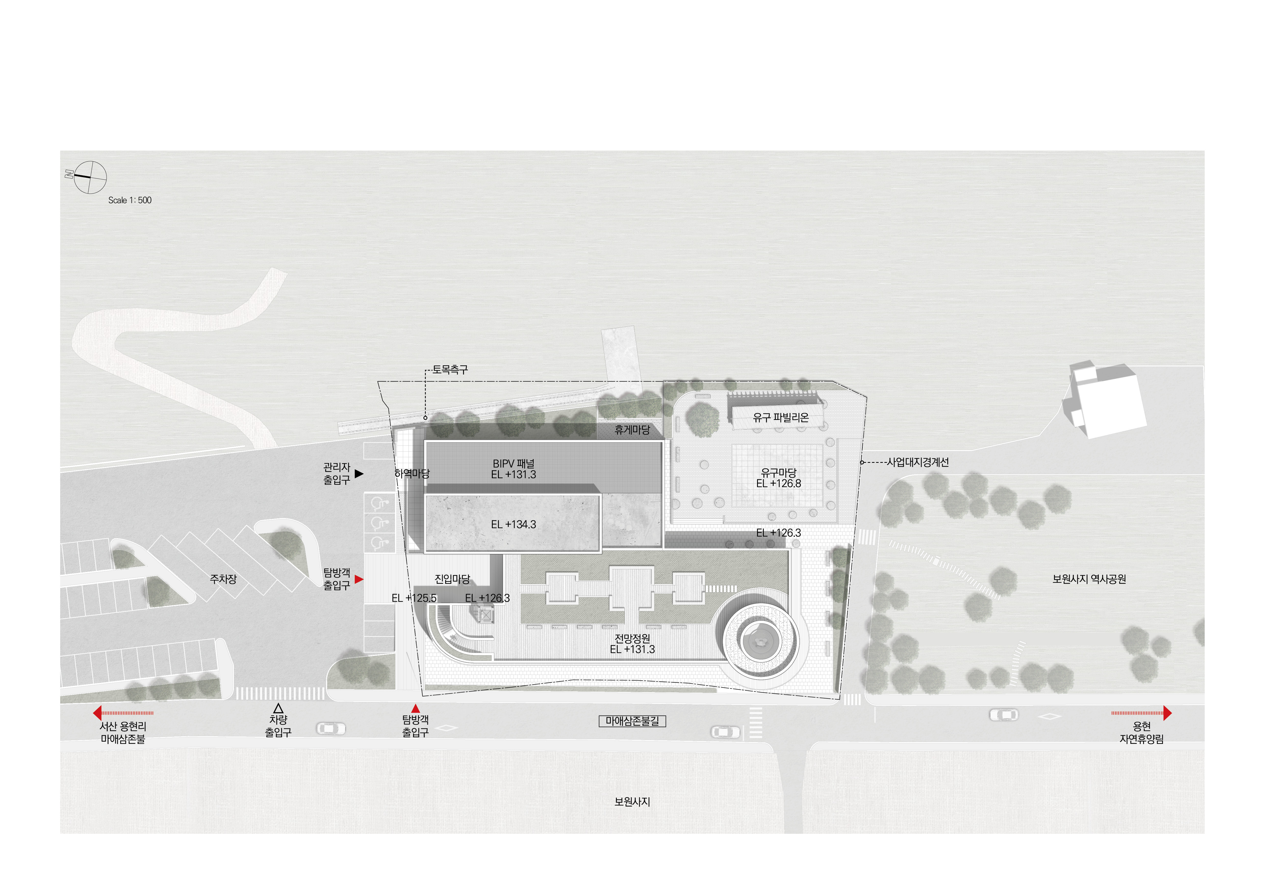 보원사지와 대상지 내 승방터로 추정되는 발굴유구를 존중하는 계획을 수립한다. 발굴유구와 방문자센터의 바닥레벨을 고려하여 유구깊이가 낮은 유구 전면부에 건물을 계획하되 유구를 고려한 기초, 보호층을 형성한다. 유구깊이가 높은 유구 배면부는 건축행위를 지양하며 외부공간으로 계획한다. 이 공간은 발굴 건물지, 석축을 표현하는 조경시설로 옛 땅의 쓰임을 상기하고 현재의 열린 공간으로 활용한다.