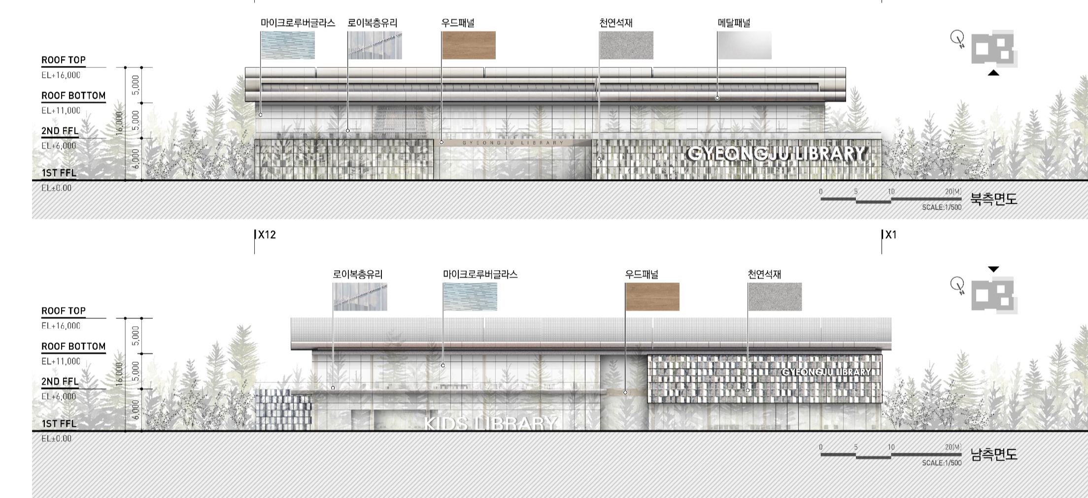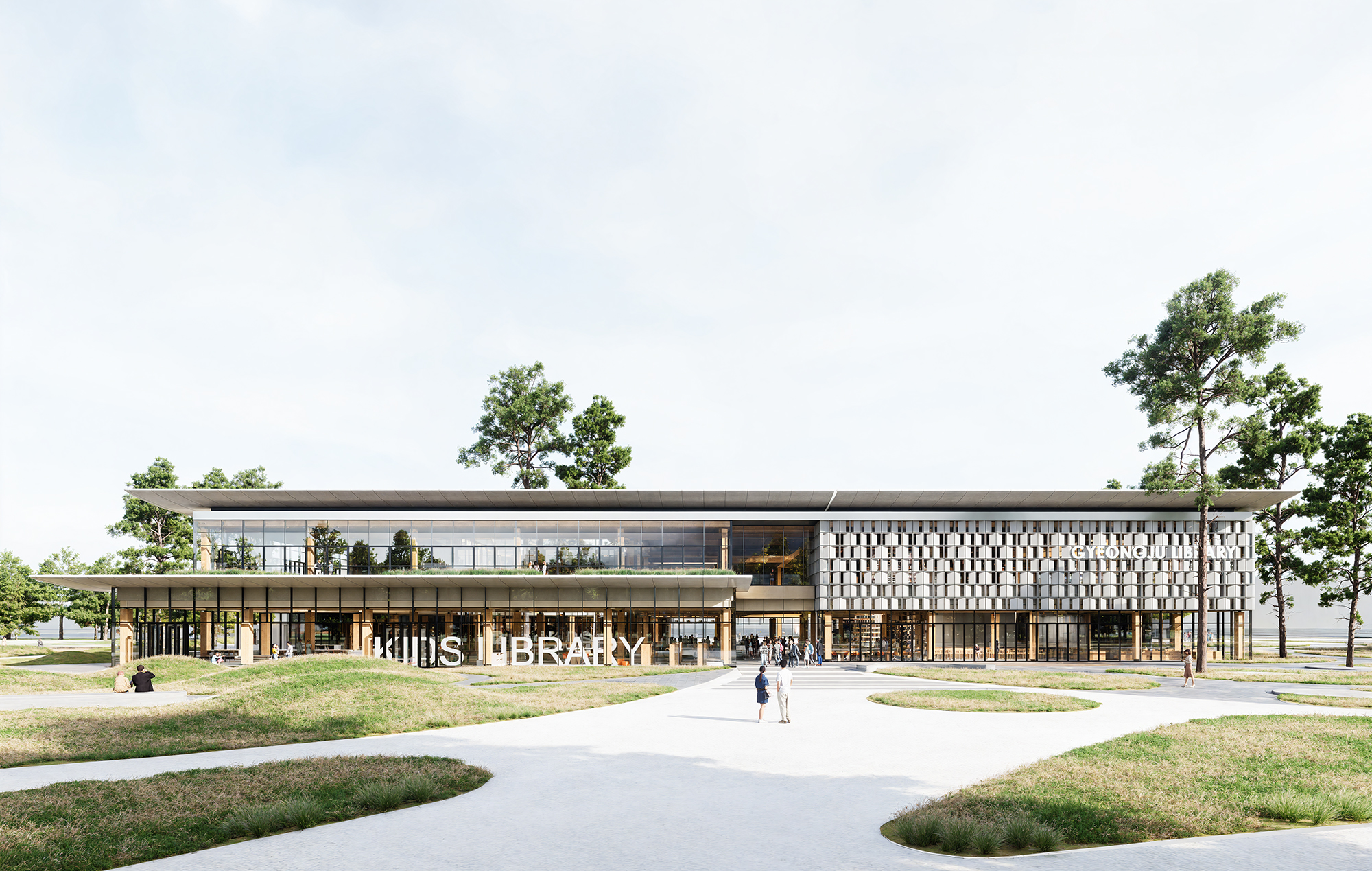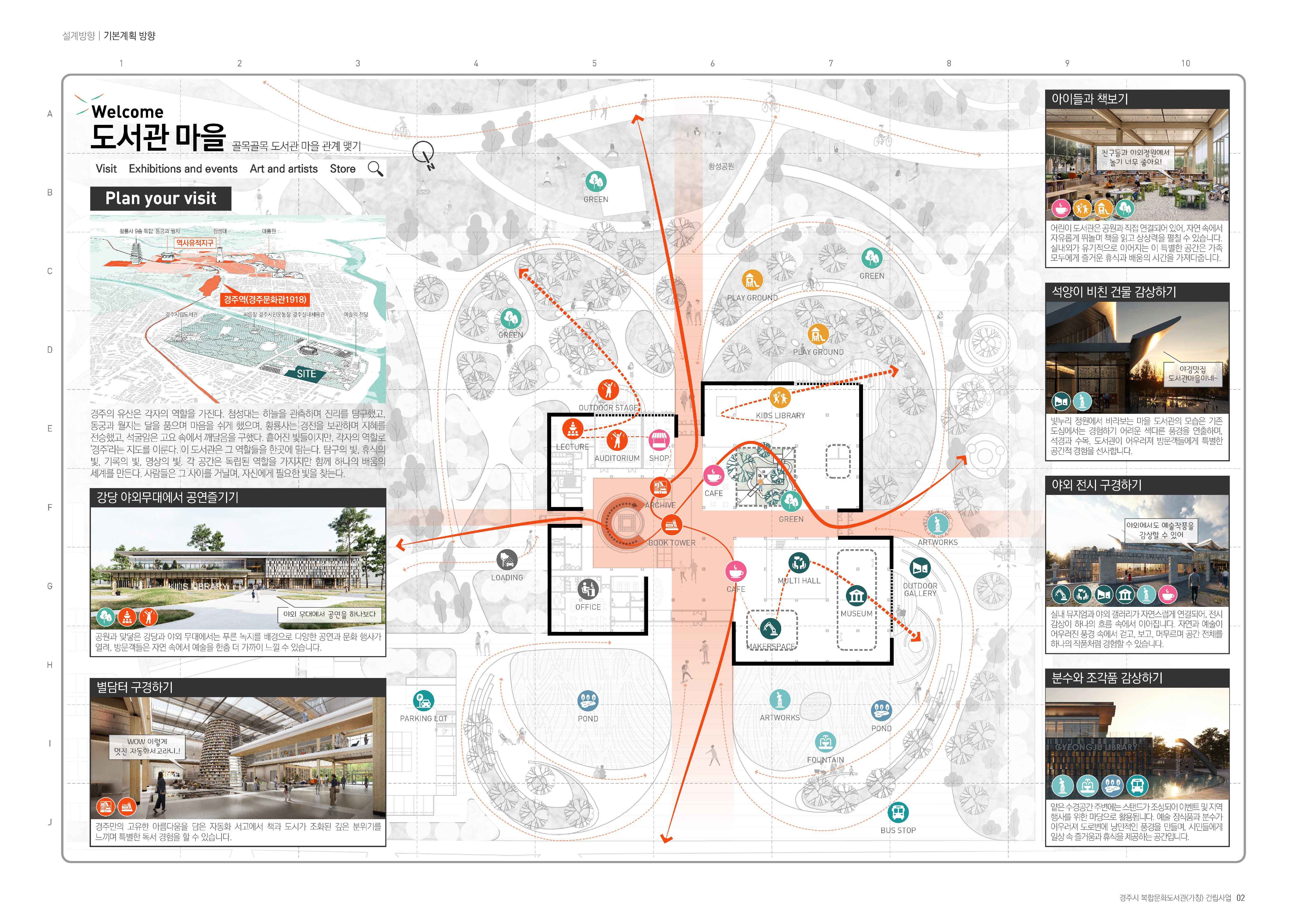 경주시 복합문화도서관은 도서관을 지역의 일상과 문화가 교차하는 커뮤니티 플랫폼으로 재정의하는 데 목적을 두었다. ‘마을’ 개념을 적극적으로 적용하여 시민들이 자연스럽게 드나들고 머무를 수 있는 열린 공간 구조를 구축하는 데 중점을 두었다. 1층에는 공원과 사방으로 연계되는 도서관 마을과 함께 도서관 내부의 중심이자 랜드마크 공간인 ‘별담터’를 배치해 문화·교육·전시 프로그램이 유기적으로 연결되도록 계획하였다. 상부에는 황성공원의 풍경을 조망하는 오픈플랜형 ‘서가의 누’를 구성하여 자연과 지식의 관계를 입체적으로 확장하였다. 단면 구성에서는 역사 기록 공간에서 현대적 열람 공간, 친환경 시스템으로 이어지는 층위적 구조를 통해 경주의 장소성과 복합 문화 도서관으로서의 역할을 함께 담아내고자 하였다.