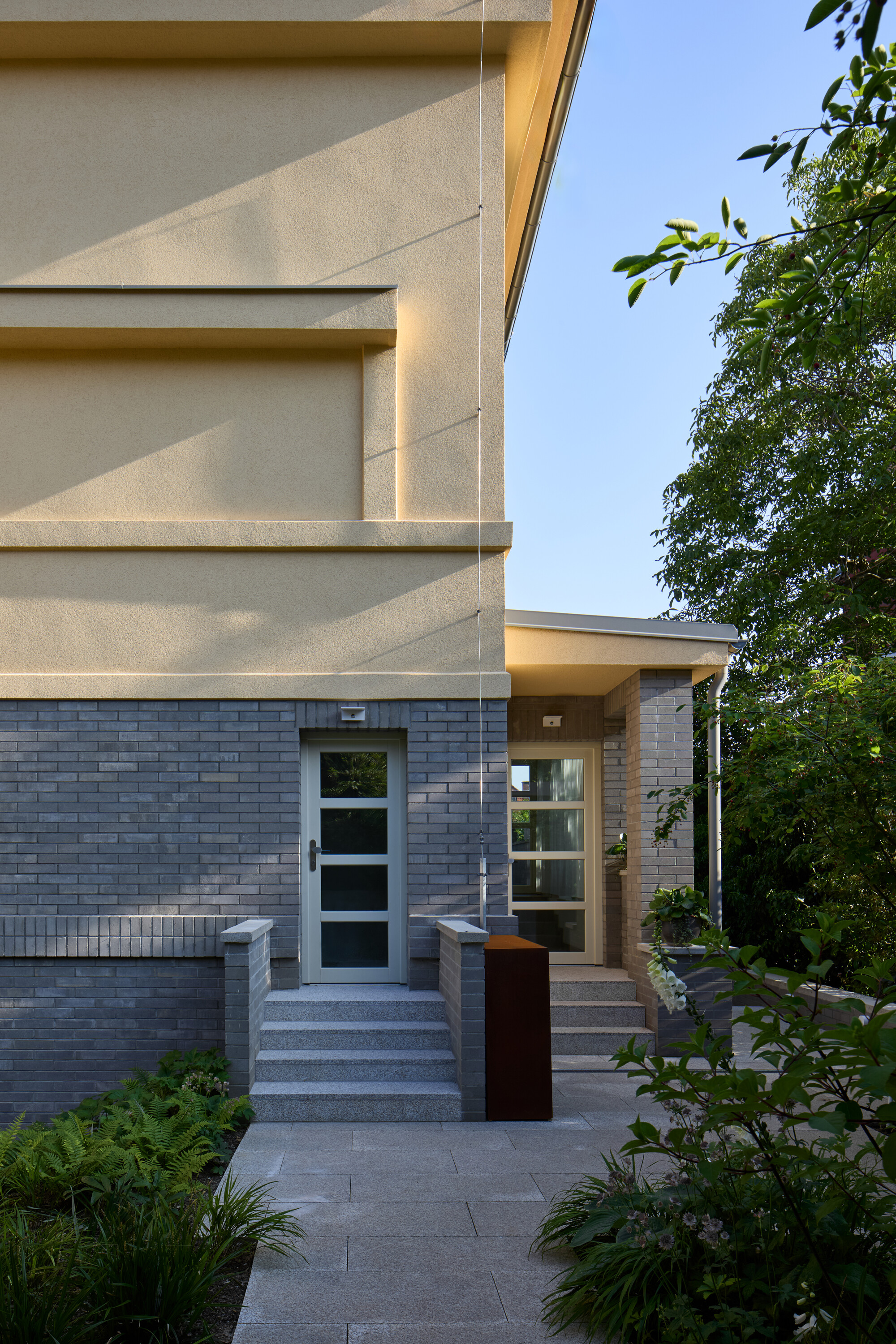 외부 마감은 기존 빌라의 성격을 최대한 존중하는 방향으로 계획되었다. 신설 차고는 노출 콘크리트 벽돌을 사용해 빌라 외관의 재료적 특성을 계승했다. 기존 빌라의 벽돌은 훼손이 심해 복원이 불가능했으며, 과거 도장 처리로 인해 재료 자체가 손상된 상태였다. 이에 따라 보존 당국과 협의 후, 현장에서 절단한 콘크리트 벽돌 슬립을 사용해 약 2cm 두께의 새로운 외피를 덧씌웠다. 거친 황토색 미장과 전통적인 비버테일 형태의 기와 역시 원형에 가까운 인상을 유지하도록 선택되었다. 창호는 기존 분할 방식을 따르되 단열 유리를 적용해 새로 제작되었으며, 남측 파사드에는 기존 목재 외부 블라인드를 복제해 설치했다.