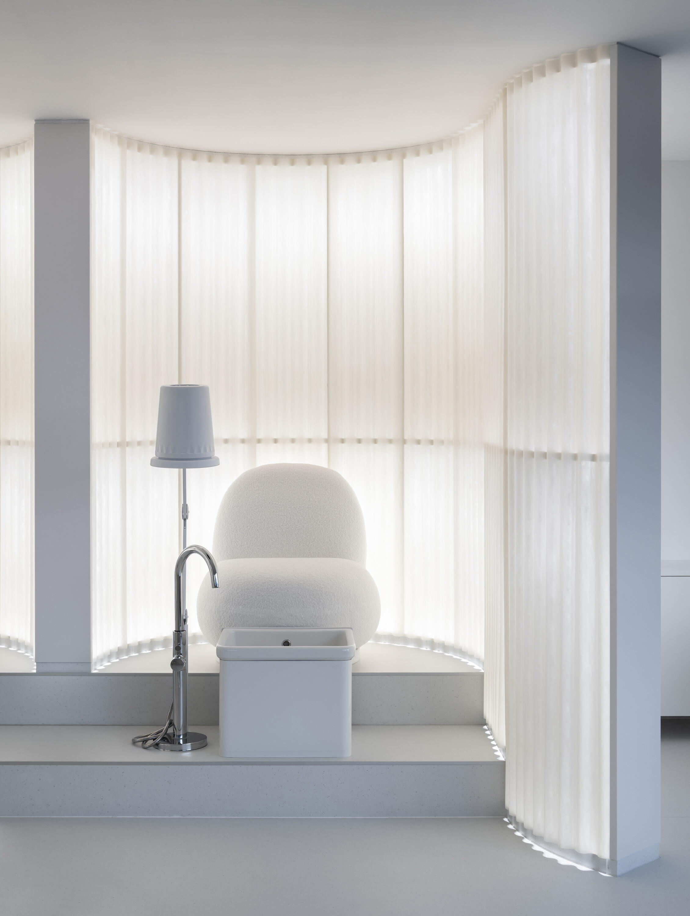 재료와 색채는 의도적으로 절제되었다. 전체 공간은 밝고 부드러운 톤을 중심으로 구성되었으며, 촉각적인 재료인 패브릭과 목재는 방문자와 직접적으로 관계 맺는 가구와 요소에만 사용되었다. 이러한 선택은 공간 전반에 차분한 인상을 부여하는 동시에, 클라이언트가 강조한 ‘돌봄’의 개념을 시각적·공간적으로 드러낸다. 이 살롱은 단순한 미용 공간을 넘어, 서비스와 웰빙이 만나는 장소로 인식되기를 지향한다.
