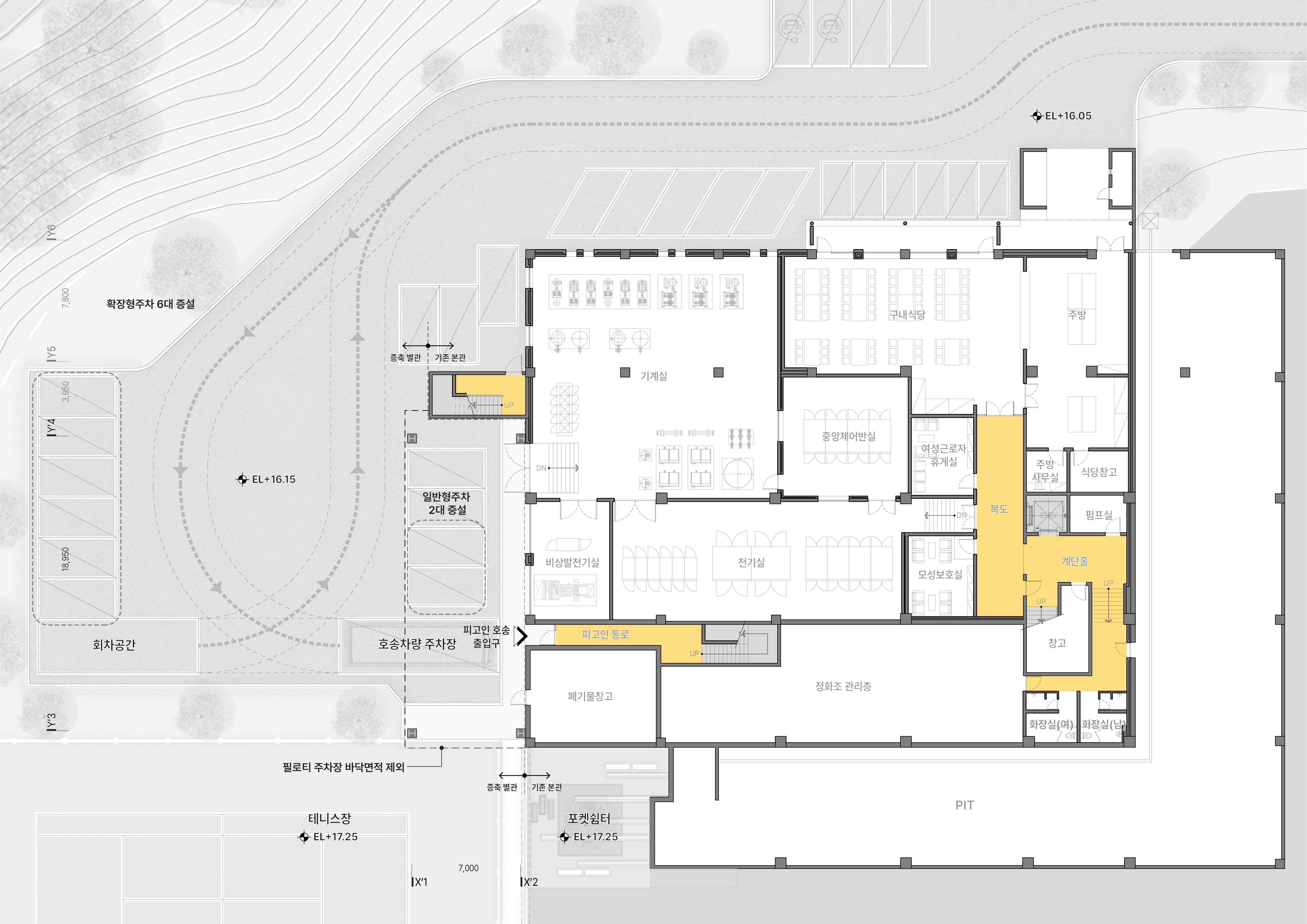 기존 본관은 법정과 법관 / 민원실과 민원인의 동선 분리가 명확했다. 이번 증축 계획의 핵심은 기존 법관 동선과 민원인 동선을 유지하여 별동 배치계획이 아닌 수평증축 계획을 하였다. 기존 동선을 유지하고 증축으로 인해 추가되는 동선을 최소화하여 계획하였다. 본관이 형성해온 축과 질서를 존중하여 이격 배치를 통해 본관의 입면 훼손과 기능적 간섭을 최소화하였다. 동시에 명확한 매스 정렬을 통해 독립적인 인지성을 확보하였다. 이용자(민원인·직원·사법) 동선은 체계적으로 분리하여 보안과 운영 효율을 높였으며, 특히 민원 동선은 단순하고 직관적으로 구성하여 이용자의 편의성을 극대화하였다.