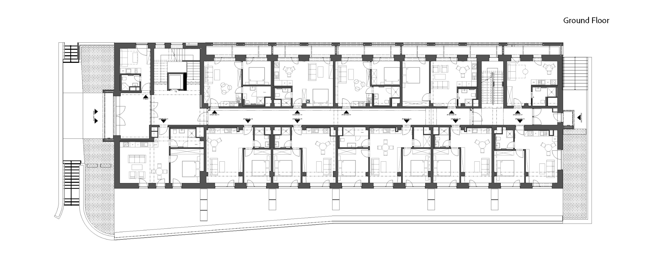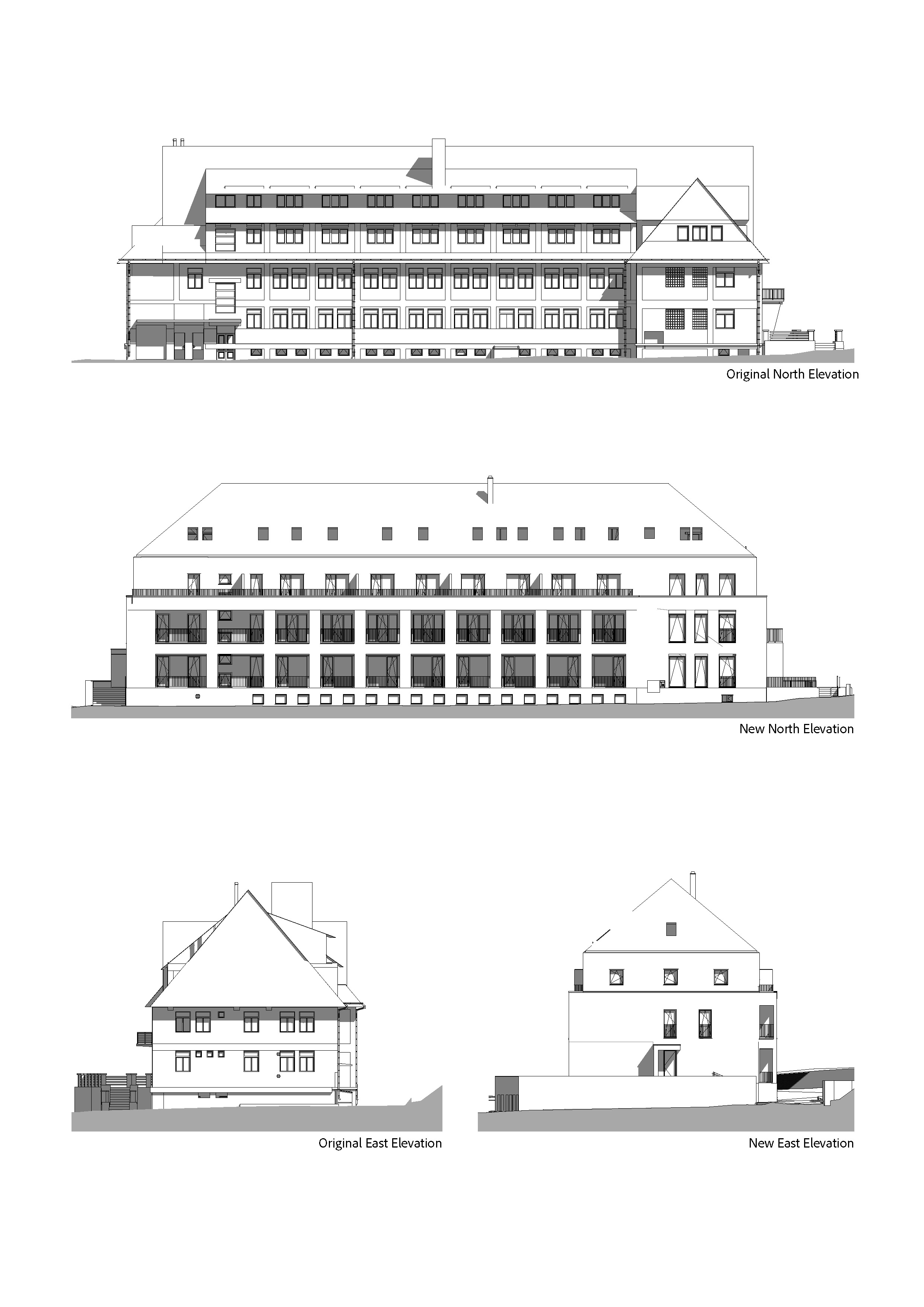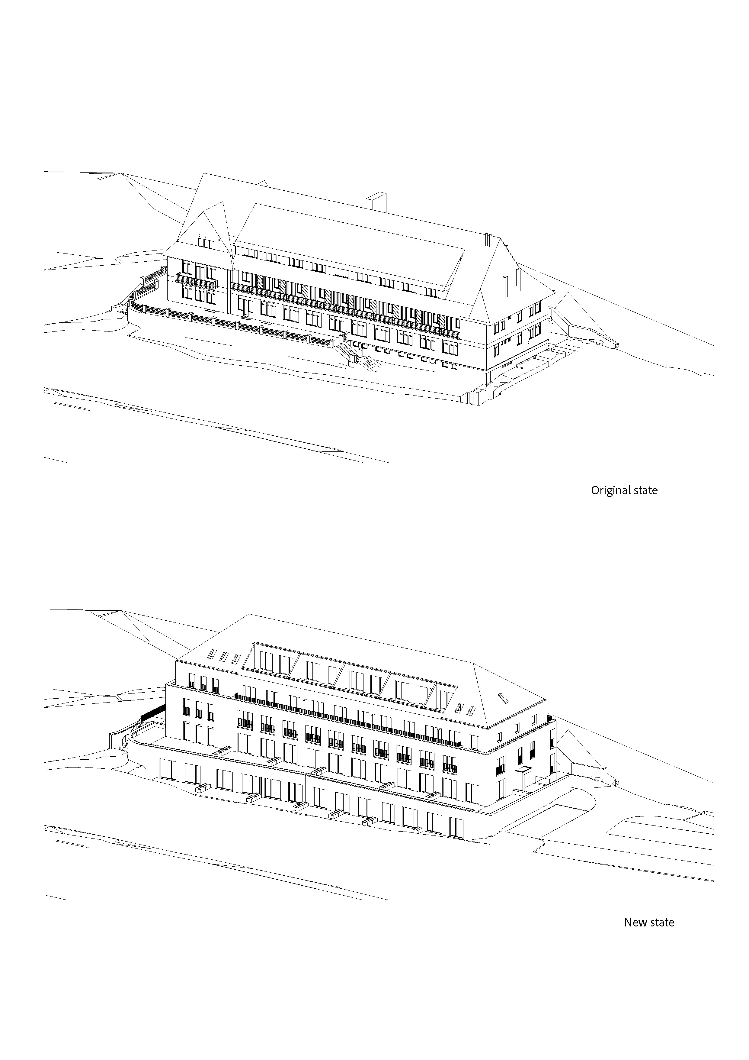 리노베이션의 전제는 명확했다. 타트라 국립공원(TANAP)과 비소케 타트리 시의 엄격한 규제, 그리고 모든 공간을 최대한 활용하고자 한 발주자의 요구가 동시에 작용했다. 설계는 기존 건물의 높이와 윤곽, 건축 면적을 유지한 채, 다락과 지하를 주거 공간으로 전환해 수용 규모를 확장하는 방식으로 진행되었다. 이는 산악 호텔 건축에서 영감을 받은 절제된 우아함을 회복하려는 시도이기도 했다.