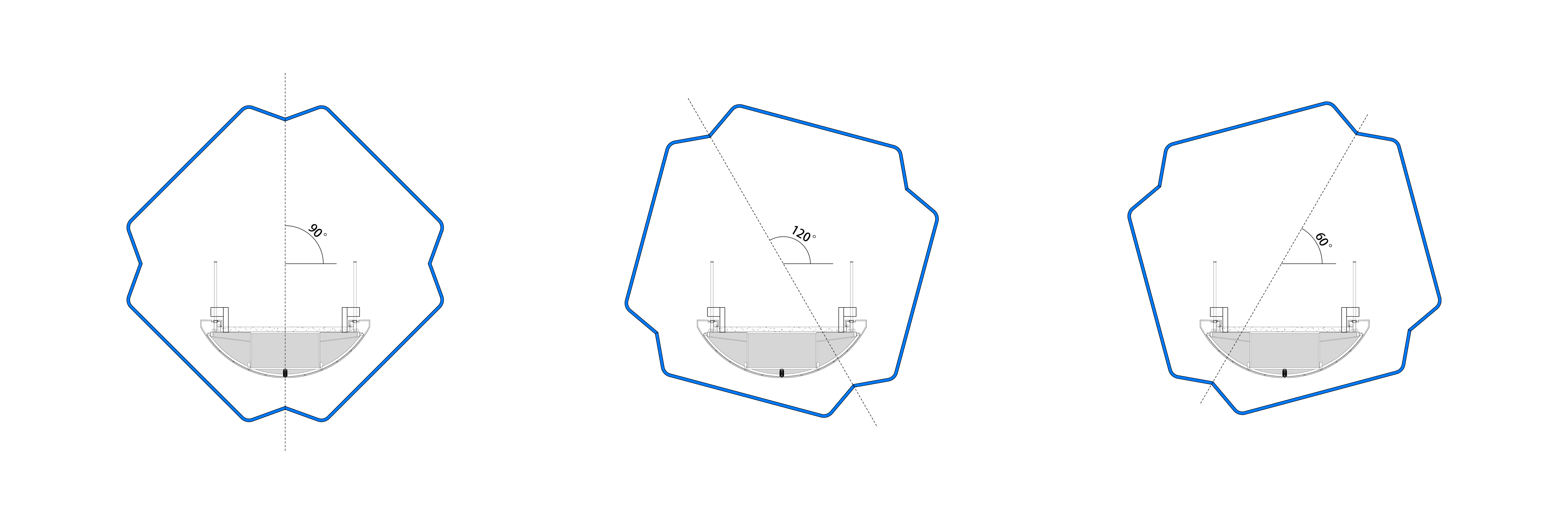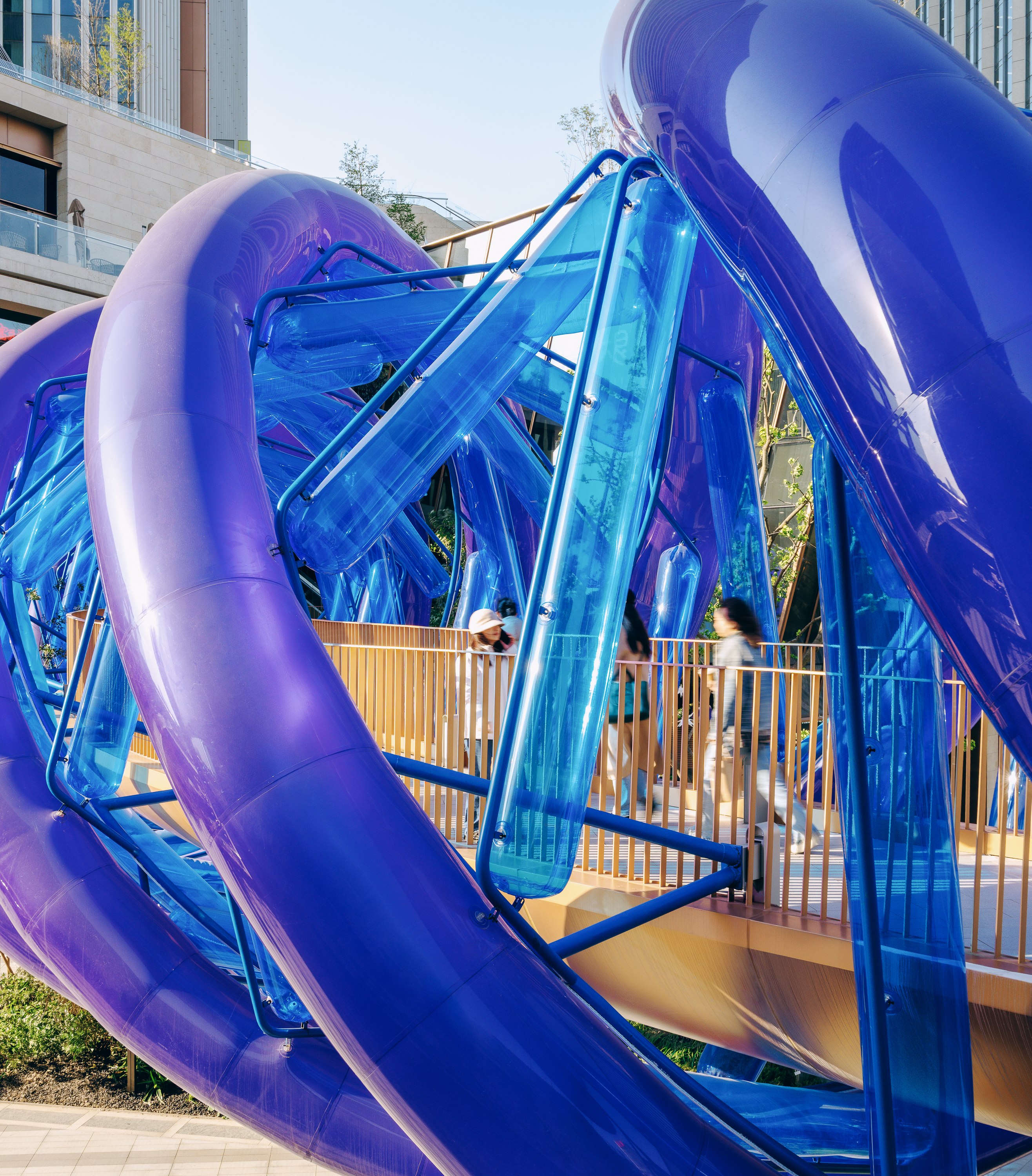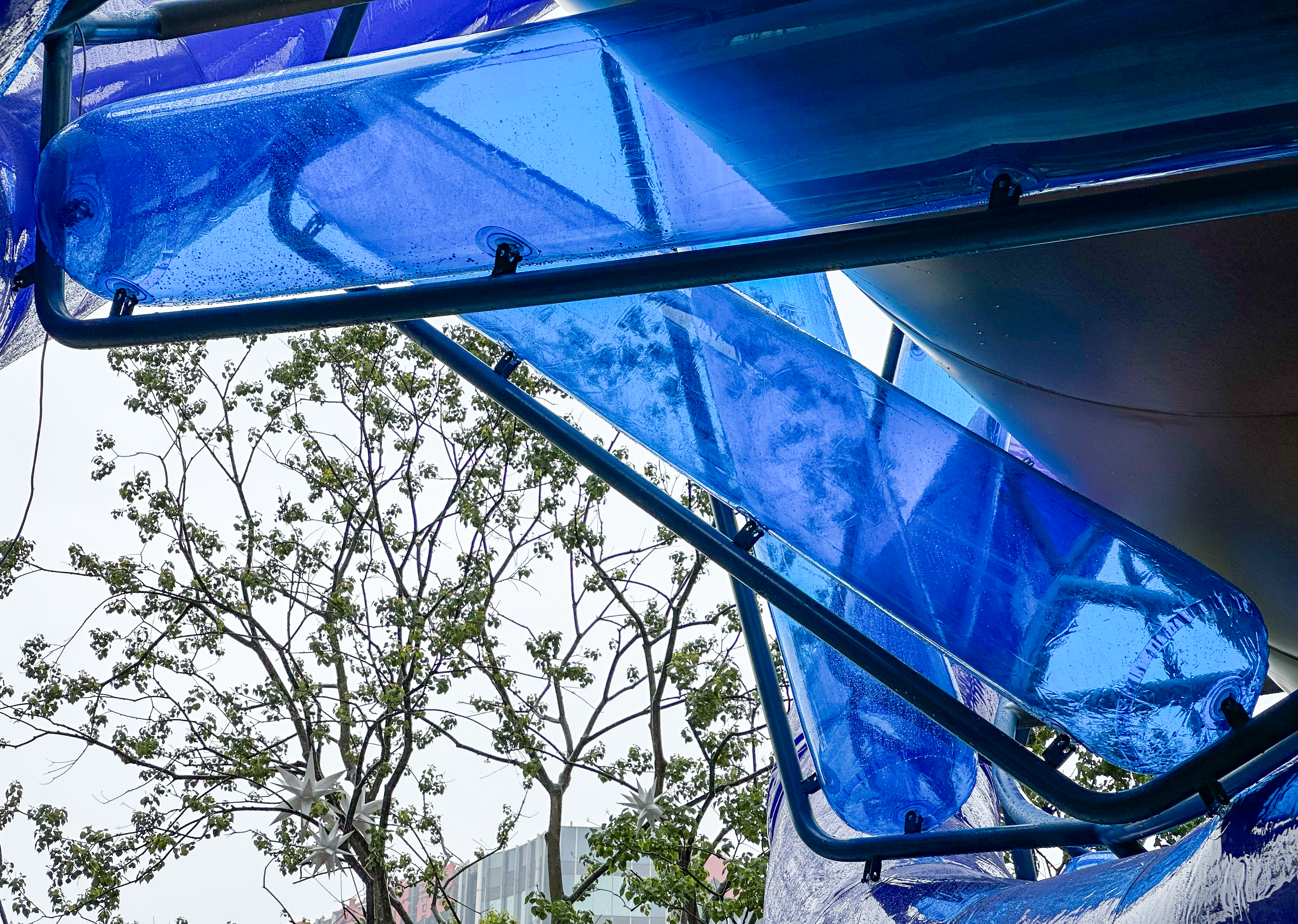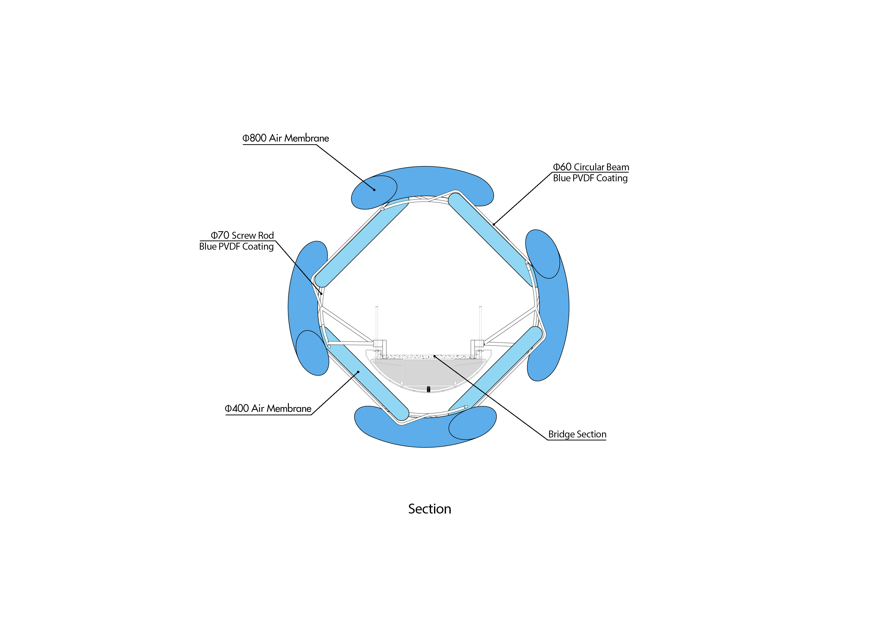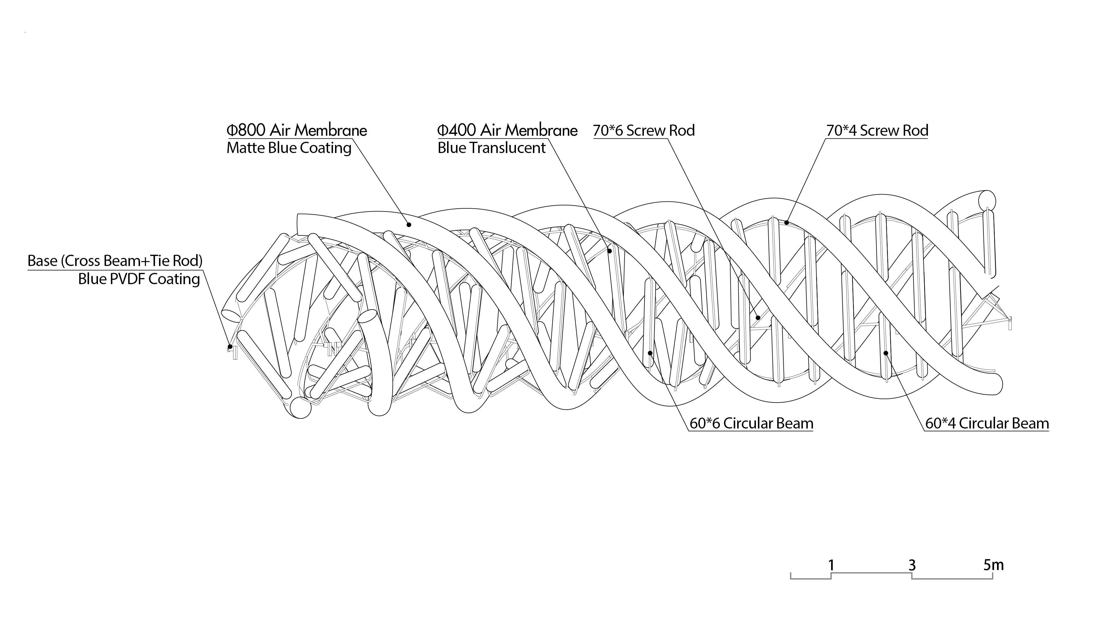 Light Vortex Bridge는 두 가지 유형의 공기막 요소로 구성된다. 지름 600mm의 나선형 공기막과 지름 400mm의 선형 공기막이 서로 다른 나선 패턴을 이루며 결합된다. 나선형 공기막은 무광의 짙은 파란색 재질로, 선형 공기막은 투명한 연한 파란색 재질로 제작되어, 자연광 아래에서 서로 다른 질감과 깊이를 드러낸다.