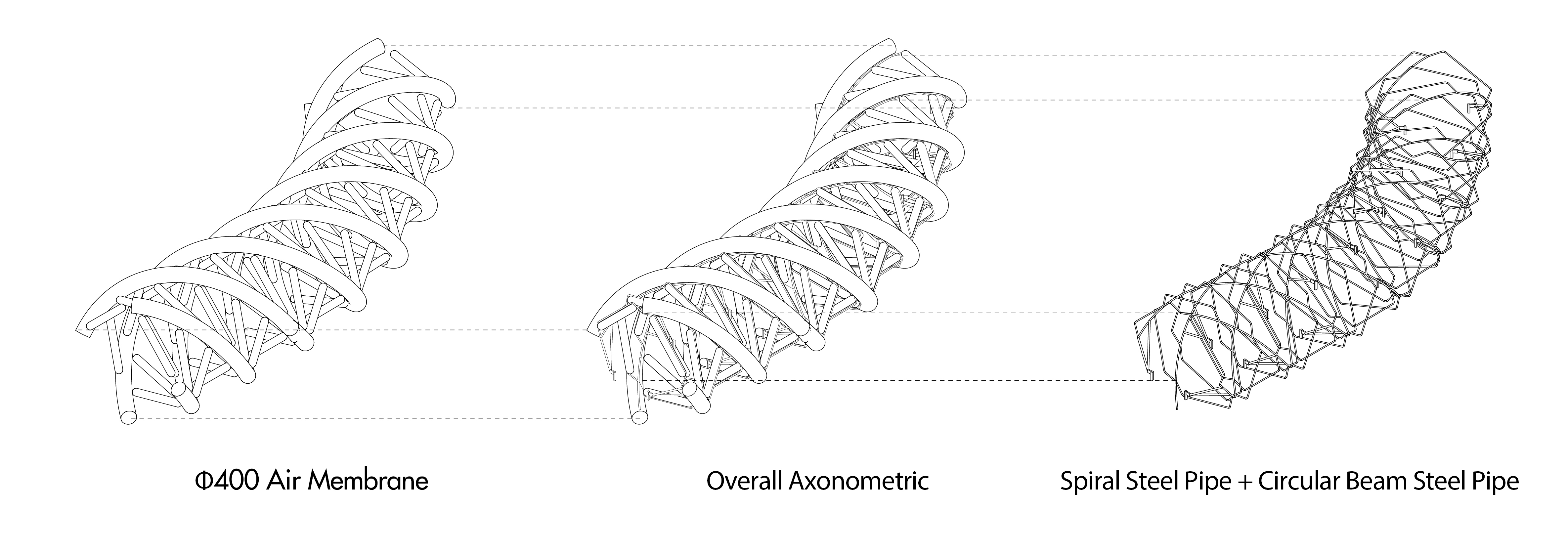 구조는 가는 원형 강관으로 이루어졌다. 지름 60mm의 나선형 강관이 주 구조를 이루고, 브리지 양측의 주 보에 V자 형태의 사선 지지대로 연결된다. 지름 40mm의 선형 강관은 보조 구조로서 나선형 강관을 회전하며 연결하고, 공기막을 고정하는 가벼운 프레임을 형성한다. 나선형 공기막은 구조 프레임의 외측에 설치되어 외부에서의 조형성을 강조하고, 선형 공기막은 내부에 배치되어 보행자의 공간 경험에 집중한다.