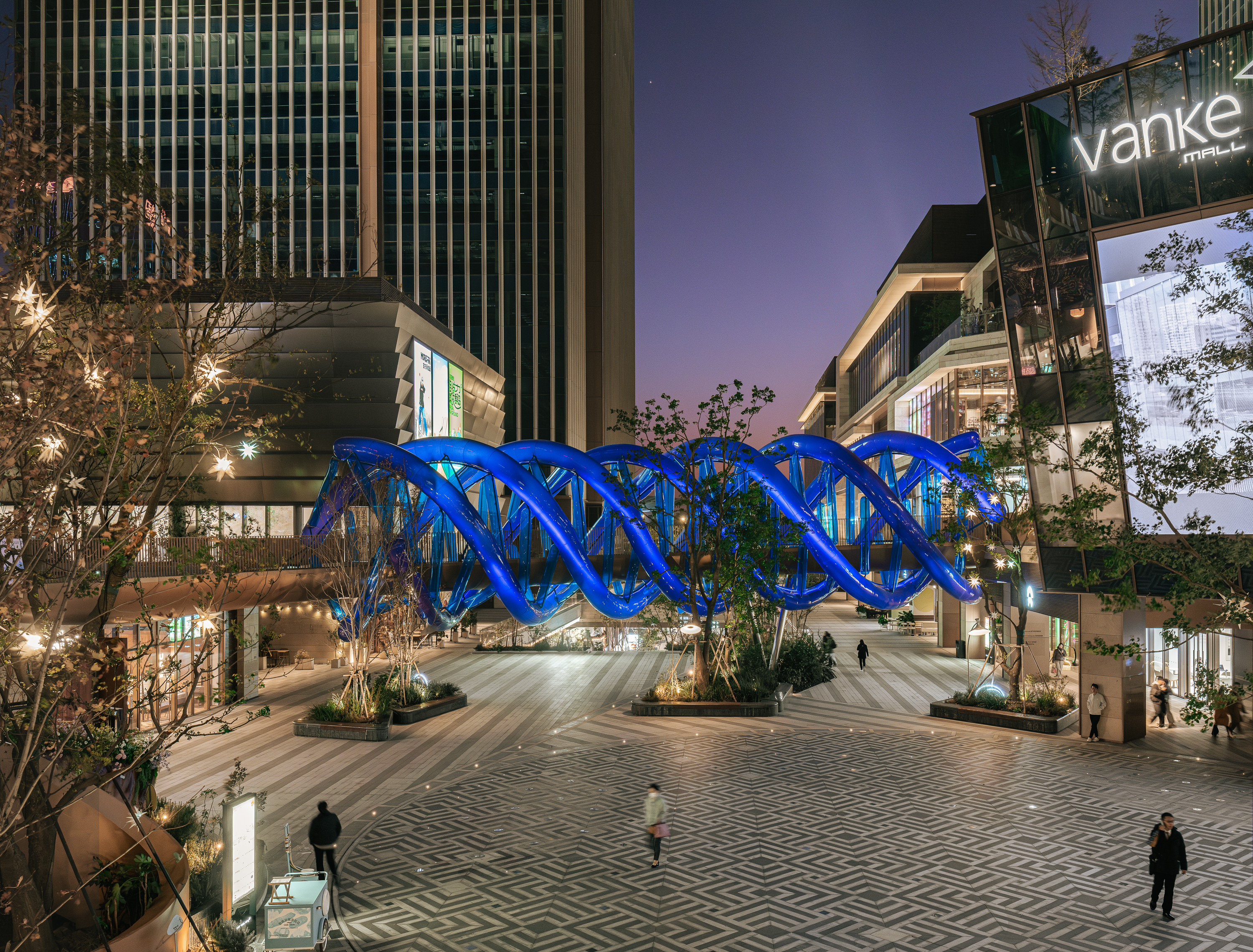 이 설치물은 환경과 사람의 움직임에 반응하며 공공성을 확장한다. 브리지에 진입하는 순간, 보행자는 반투명한 푸른빛에 둘러싸이게 된다. 투과된 빛은 주변을 파랗게 물들이고, 위로 올려다본 하늘 역시 층위가 다른 색조로 인식된다. 이동에 따라 나선형 구조가 만들어내는 공간의 변화가 더욱 또렷하게 체감된다.