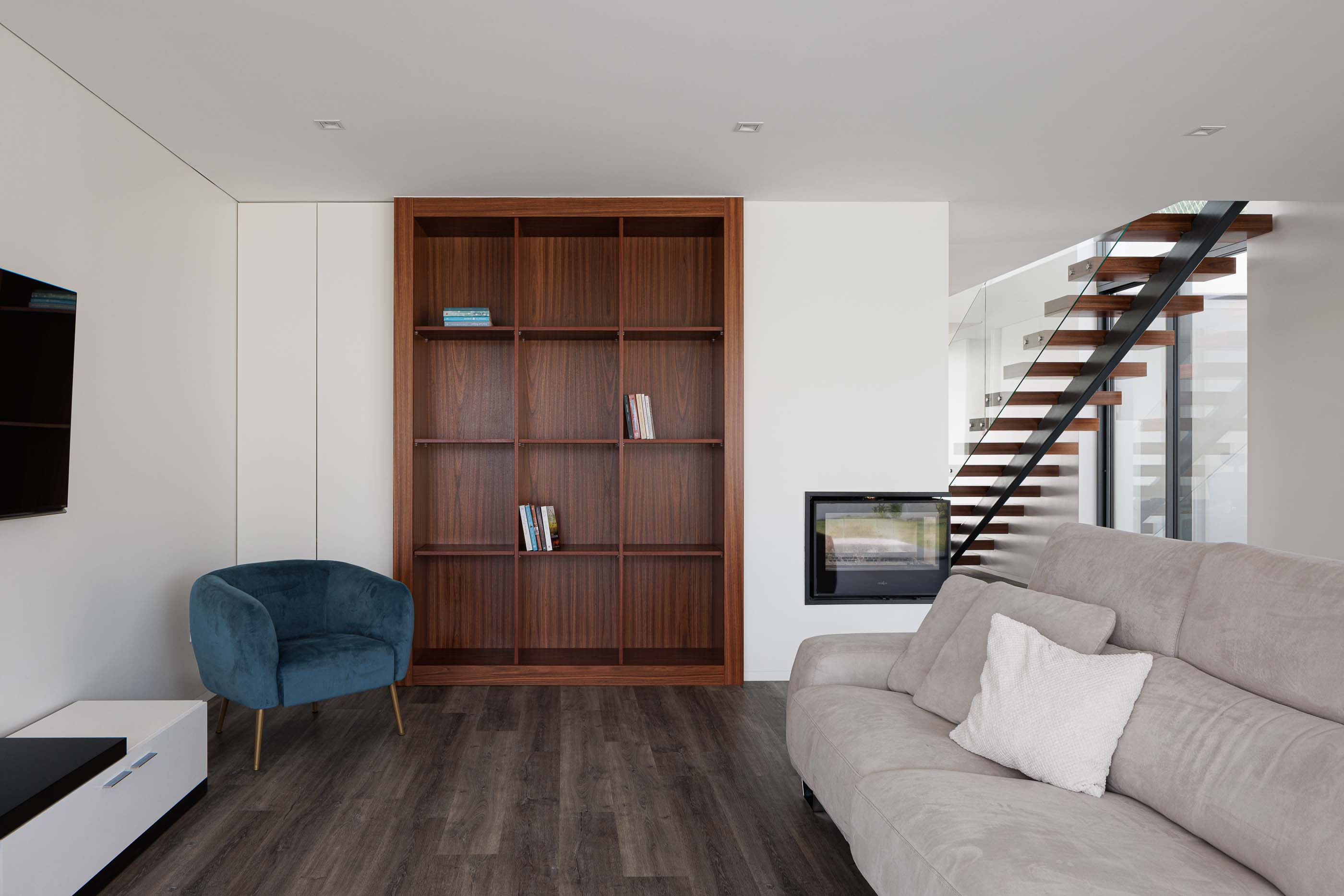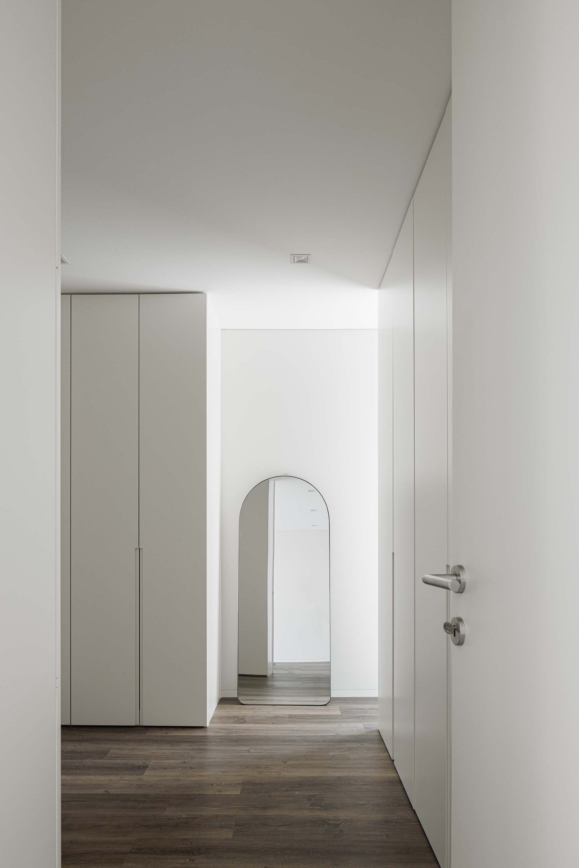 재료와 디테일은 절제된 정확성을 바탕으로 선택되었다. 연속된 백색 표면, 최소 단면의 창호, 넓은 유리 면과 균질한 바닥 마감은 공간을 정제된 하나의 장면으로 만든다. 매입형 수납 시스템은 시각적 잡음을 줄이며, 조명 역시 기하학적 축에 맞춰 은은하게 배치되어 밤에는 건물을 하나의 입체적 오브제로 드러낸다. 빛과 그림자, 깊이와 비례가 조용히 강조된다.
