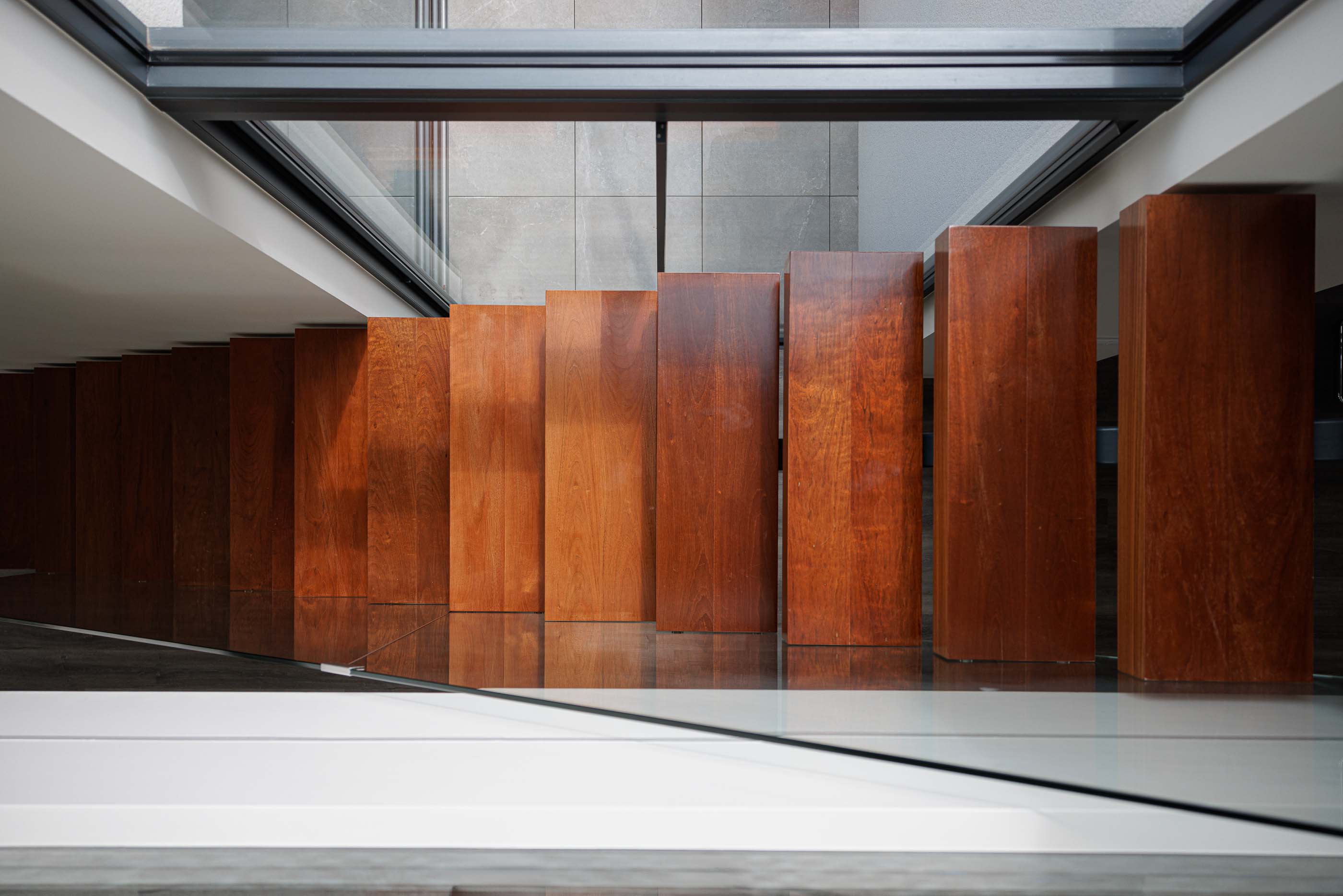 건물의 공간 구조는 두 개의 주요 축을 중심으로 조직된다. 진입을 담당하는 횡축에는 내부 중정이 배치되어, 자연광을 주택의 중심부로 끌어들이며 동선 공간의 질을 끌어올린다. 한편 남측 정원을 향해 열린 종축은 외부와의 지속적인 시각적 관계를 형성하며, 상부층 침실로 이어지는 공간의 흐름을 만든다. 이 두 축은 채움과 비움, 투명성과 불투명성이 명확히 대비되는 질서를 형성하며, 공적 영역과 사적 영역의 관계를 정리한다.