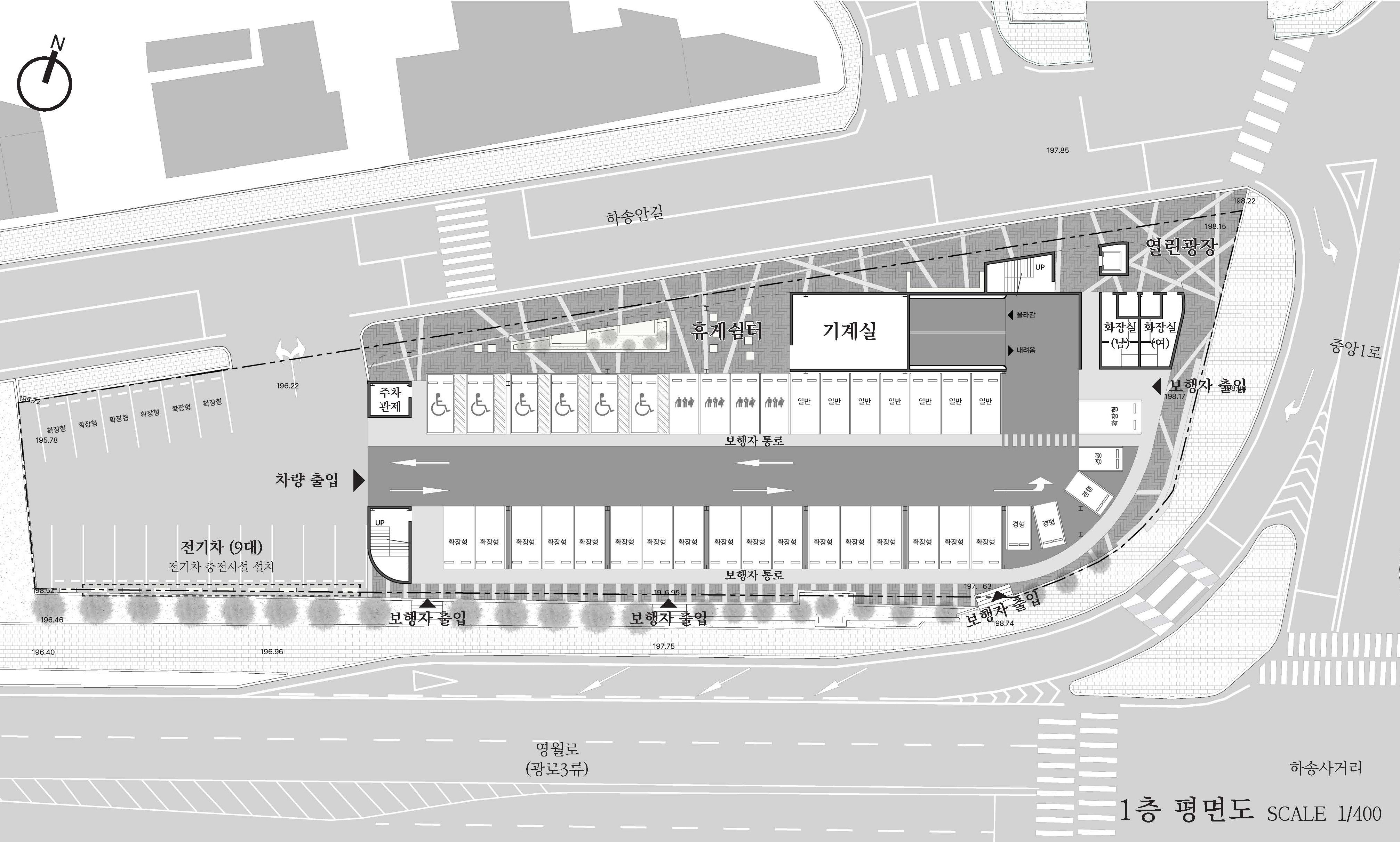 대상지는 서부전통시장, 시외버스터미널, 영월군청 등 다양한 공공·상업 시설이 밀집한 지역으로, 항상 주차 수요는 높지만 체계적인 주차 인프라는 부족한 환경이다. 특히 주말에는 시장의 맛집을 방문하는 외지인들이 많아 충분한 주차 수요를 확보할 필요성이 있다. 대지의 위치는 동측의 중앙로와 북측 하송안길을 통해 차량과 보행이 동시에 집중되는 장소로, 동선의 혼재와 보행 안전 문제를 해소하기 위하여 주차장 이용객뿐 아니라 도보를 이용하는 이용객들의 접근성과 안전성도 고려하여야 한다. 따라서 본 설계안에서는 지역 주차난을 해소하며, 전통시장의 수요를 보조하고, 안전하고 관리가 편리한 공공 주차장에 추가적으로 영월을 관통하는 메인도로인 영월로에서의 랜드마크를 조성하는 것을 주안점으로 삼았다.