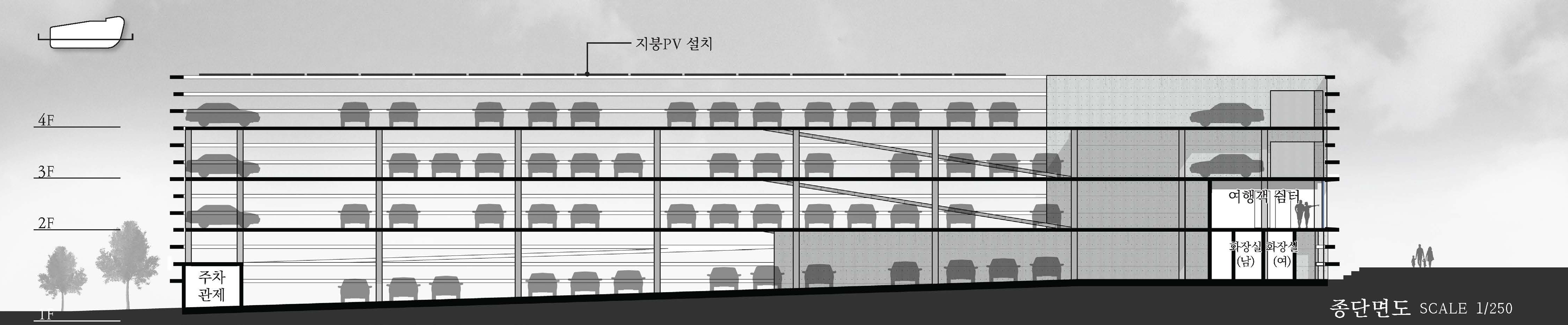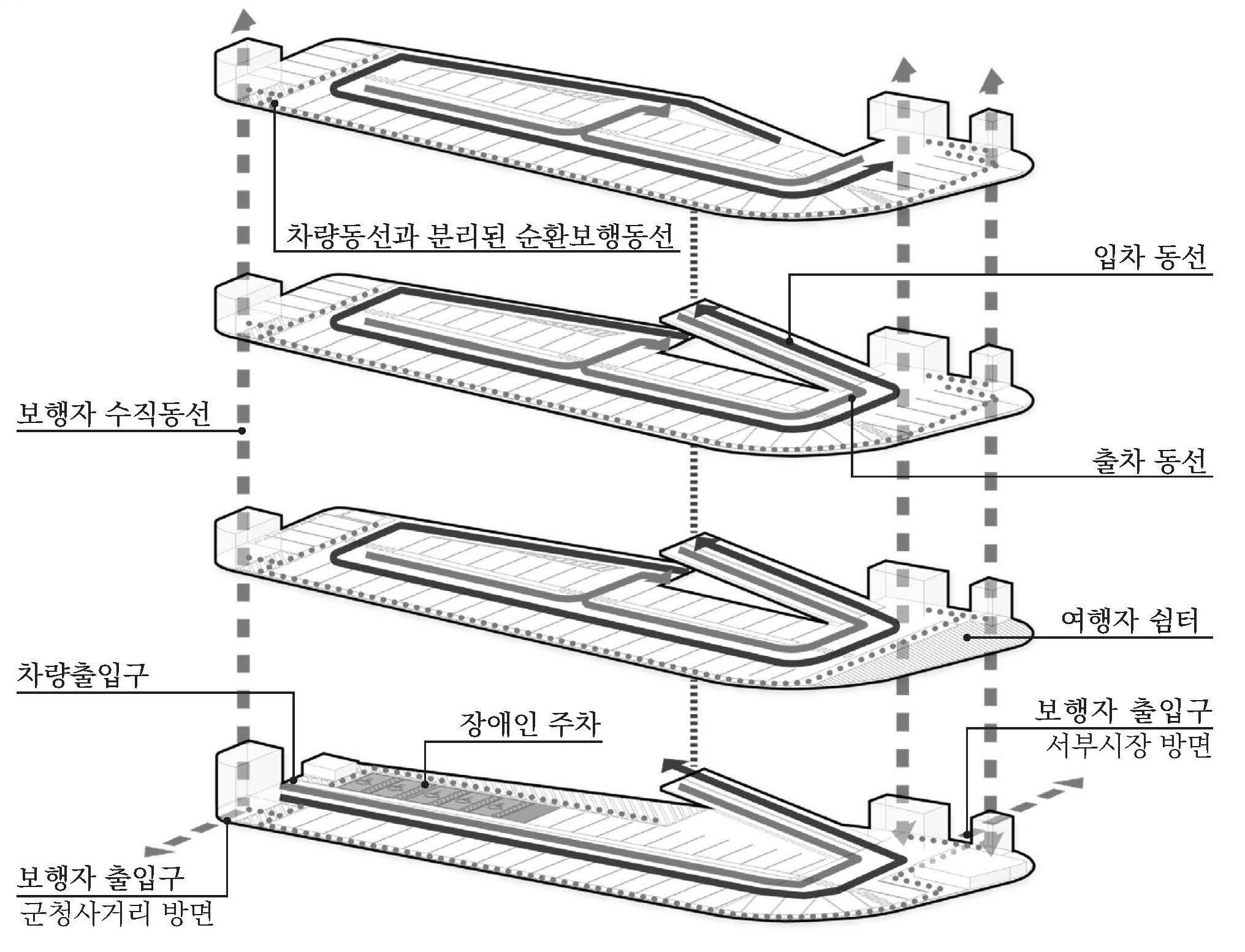 본 계획은 도심에 집중된 주차 수요와 다양한 이용 흐름을 합리적으로 수용하는 공공 주차시설의 확장된 역할을 목표로 한다. 주차로 인한 소음과 혼잡을 최소화할 수 있도록 배치와 동선을 체계적으로 정리하고, 보행과 체류가 가능한 공공 공간을 함께 구성하였다. 기능 중심의 주차시설을 넘어, 전통시장과 주변 도시를 유기적으로 연결하며 지역의 인상을 형성하는 생활형 거점이자 랜드마크로서의 역할을 수행하고자 한다.