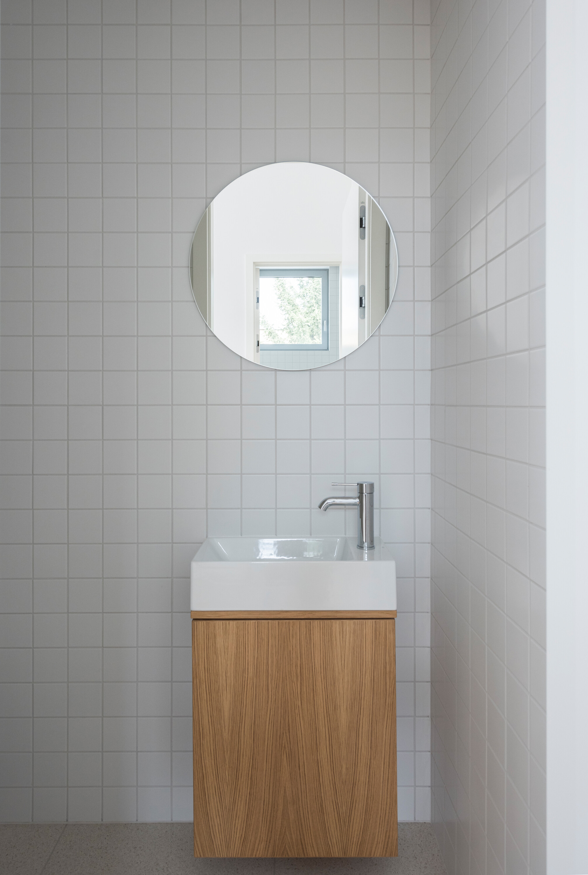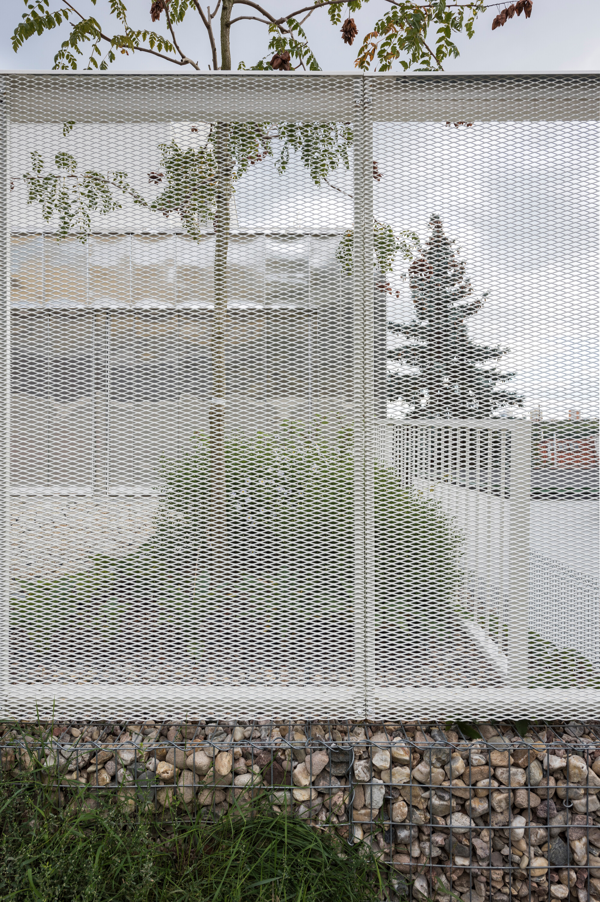 도로 레벨에서는 자연 알루미늄 시트로 마감된 수평적 차고 볼륨이 백색 매스를 가로지르며, 상부는 인접한 단독주택의 스케일과 건축선을 고려한 단층 구성과 경사지붕으로 계획되었다. 반면 남측으로 내려갈수록 건물은 점차 확장되며, 맞은편의 브루탈리즘 테라스형 아파트와 조응하는 입체적 구성을 드러낸다. 이와 같은 형태적 전략은 주변 건축 환경에 대한 직접적인 응답이자, 경관 속에서 과도하게 부각되지 않기 위한 절제된 태도이다.