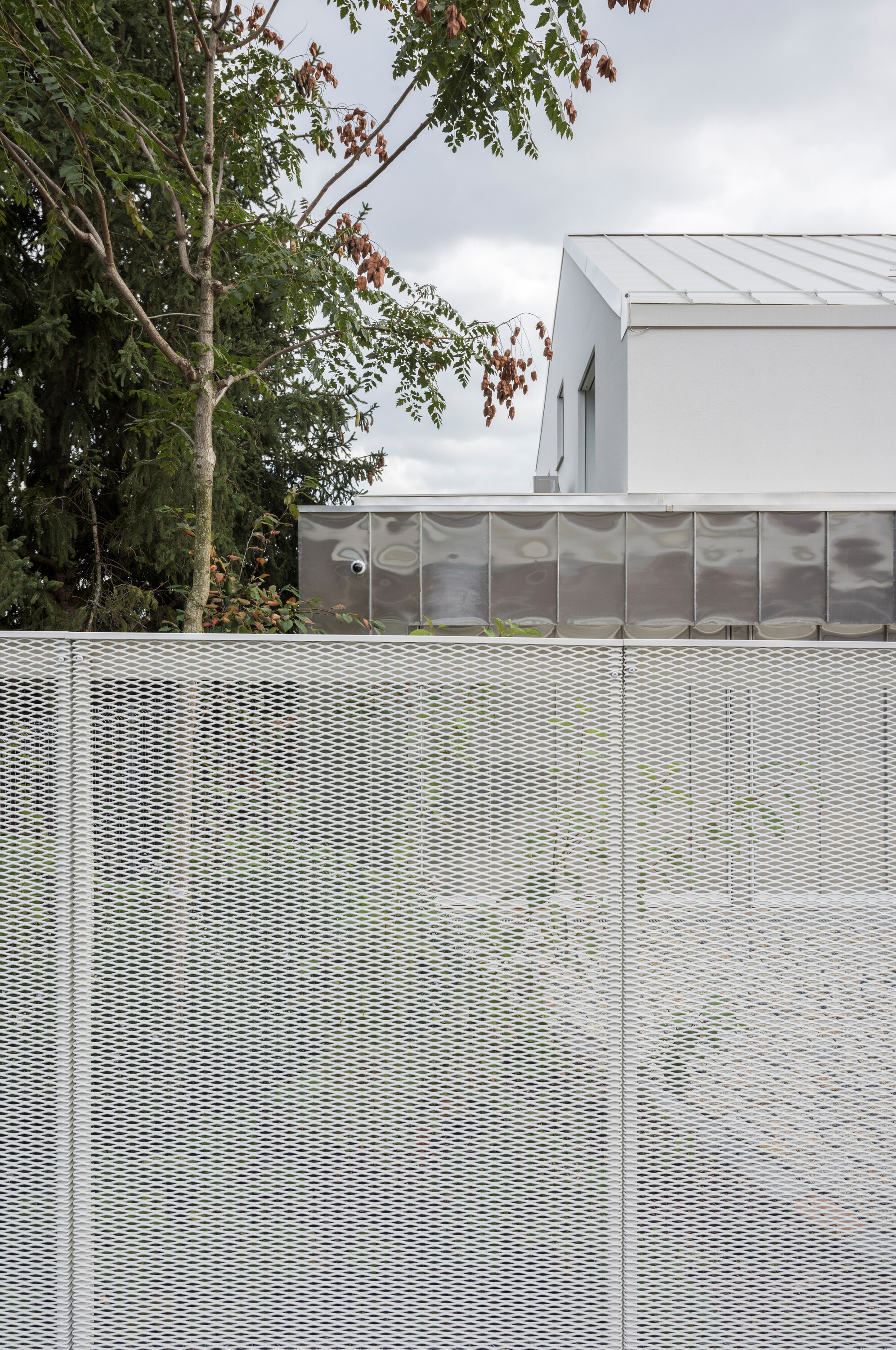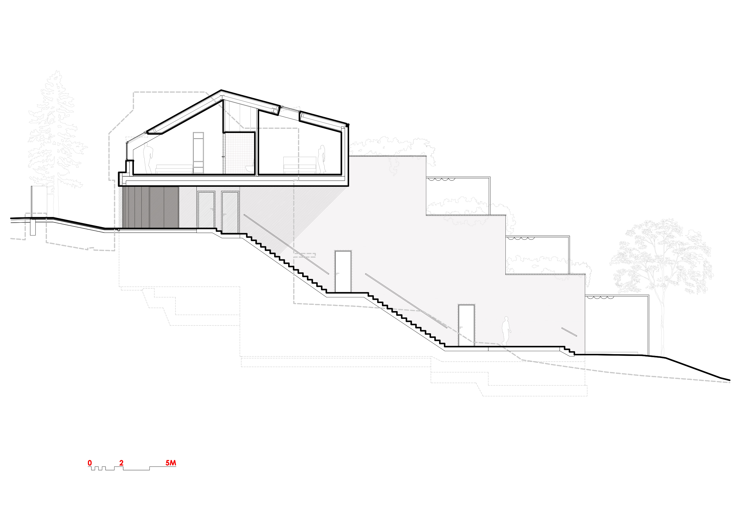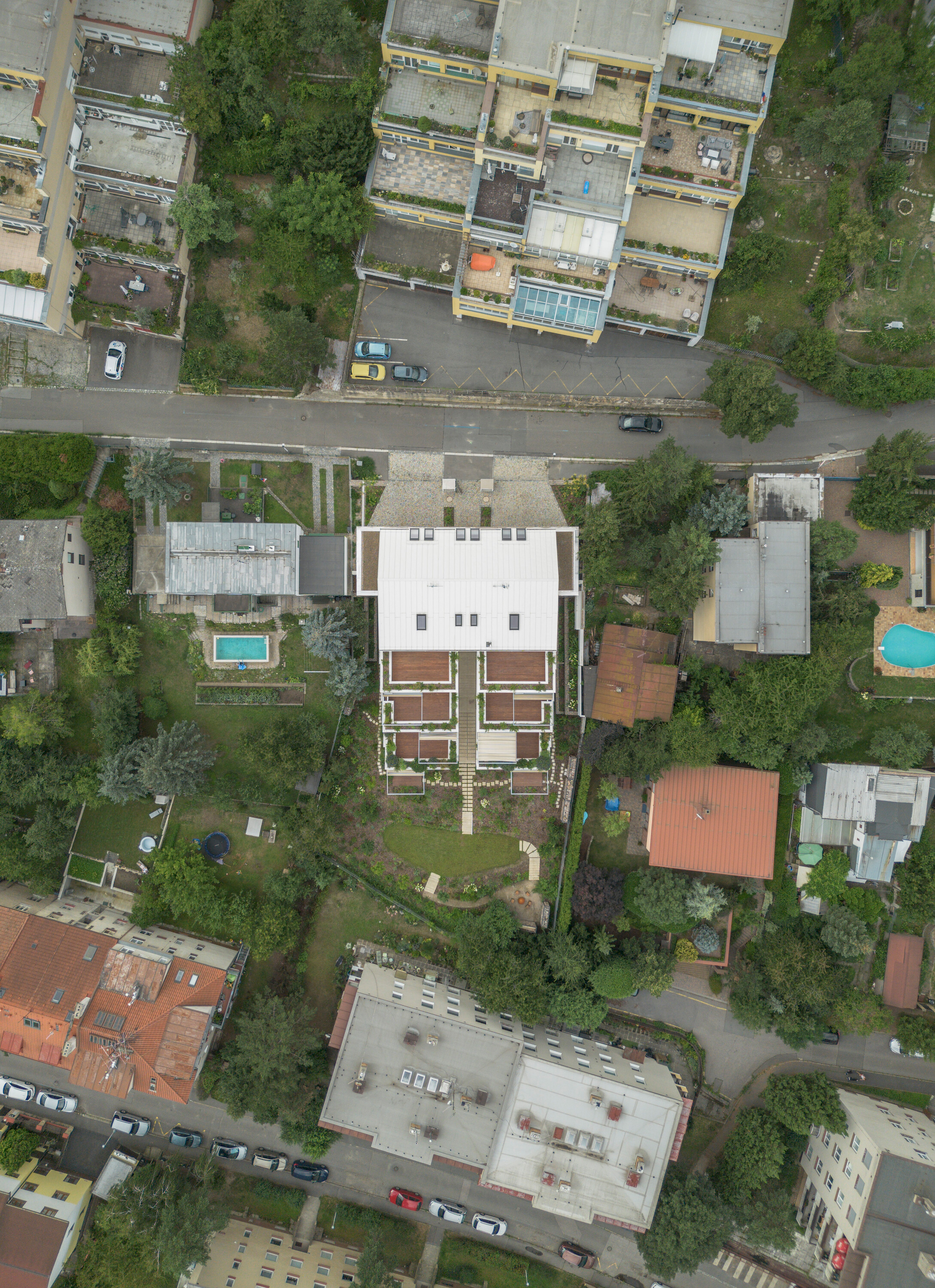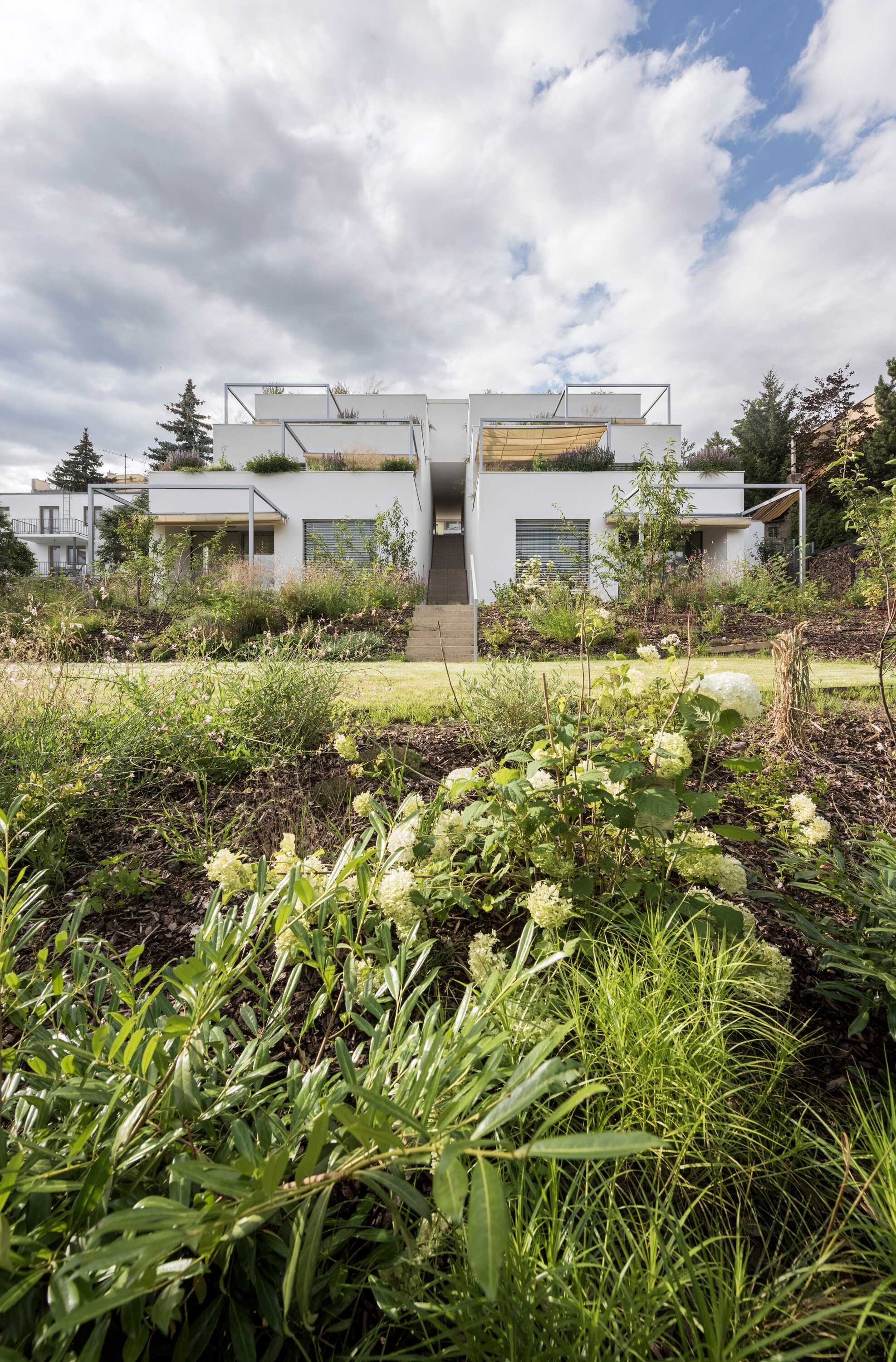 설계를 맡은 마르틴 체넥 아키텍처(martin cenek architecture)는 이러한 지형적·도시적 맥락을 적극적으로 읽어내며, 기존의 노후 단독주택을 대신해 두 개의 대칭적인 주거 유닛으로 구성된 테라스형 반연립 주택을 제안했다. 건물은 경사를 따라 단계적으로 후퇴하는 백색 매스로 구성되며, 남측으로는 숲이 우거진 경관을 향해 열리고, 북측 도로를 향해서는 절제된 도시적 표정을 갖는다. 이로써 건물은 도시를 향한 얼굴과 녹지를 향한 얼굴, 두 가지 성격을 동시에 지닌다.