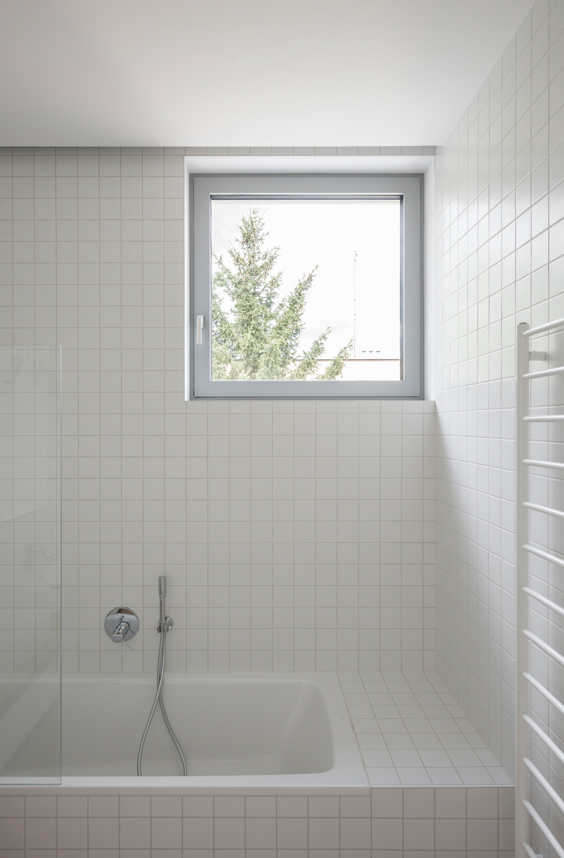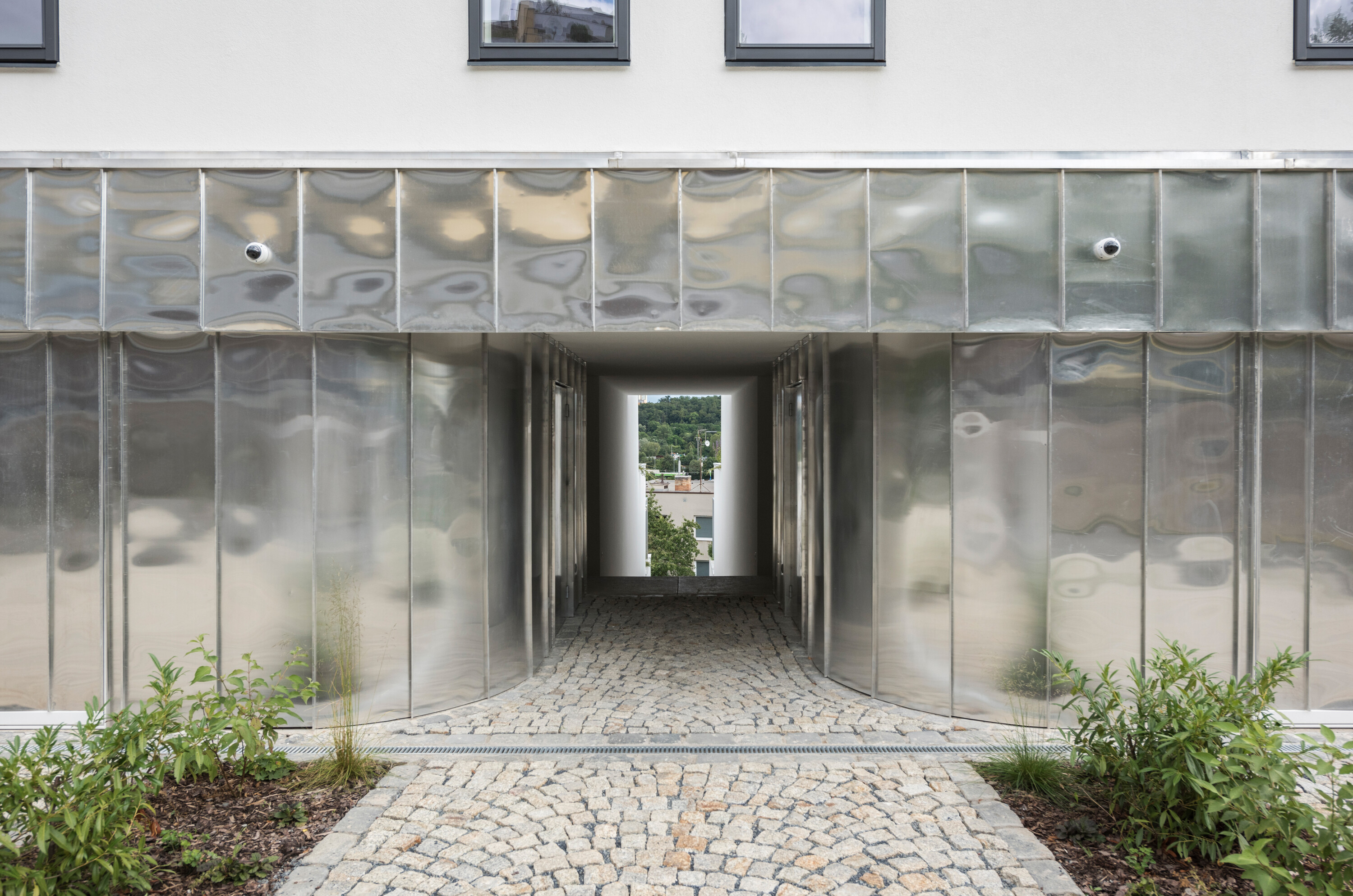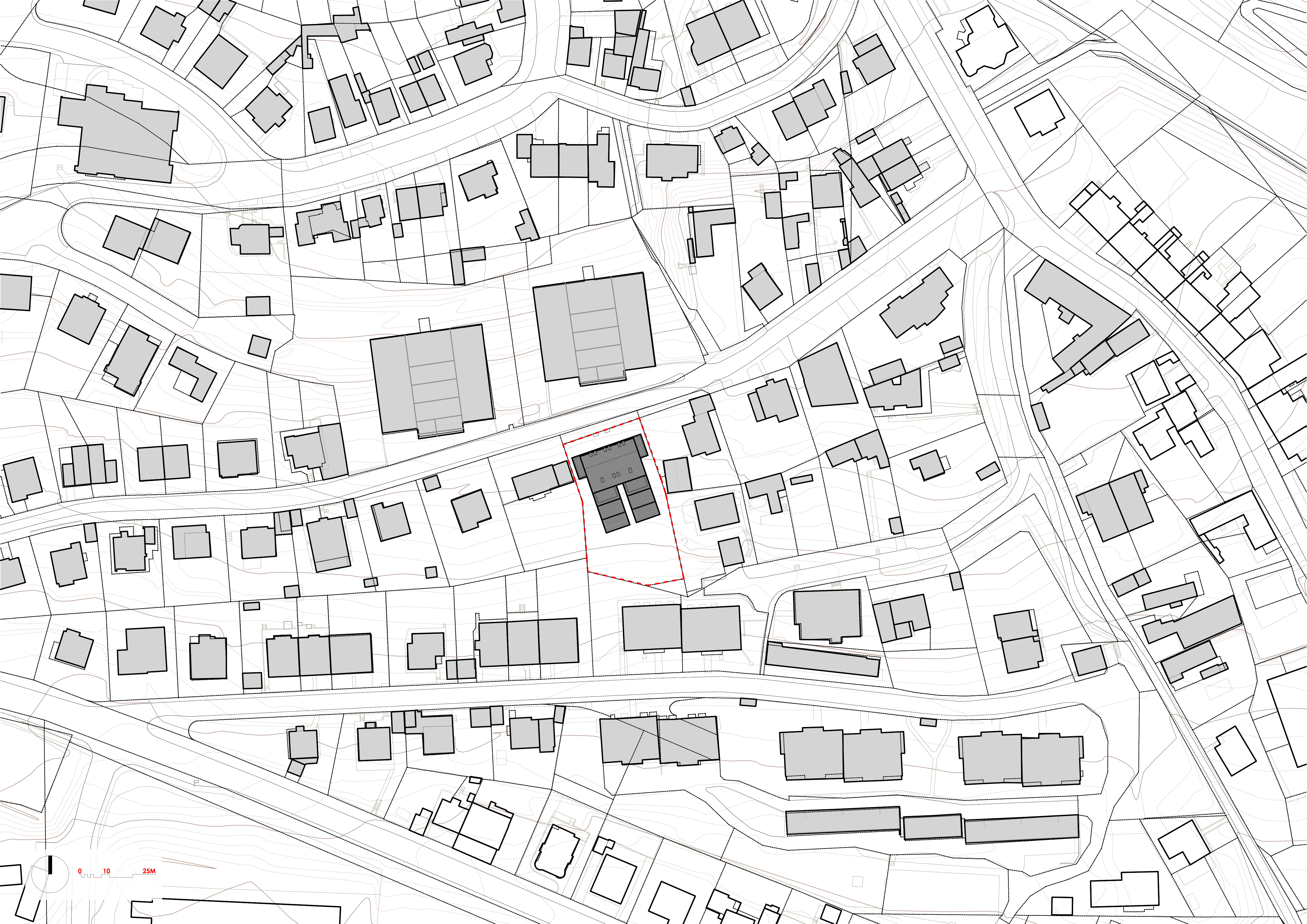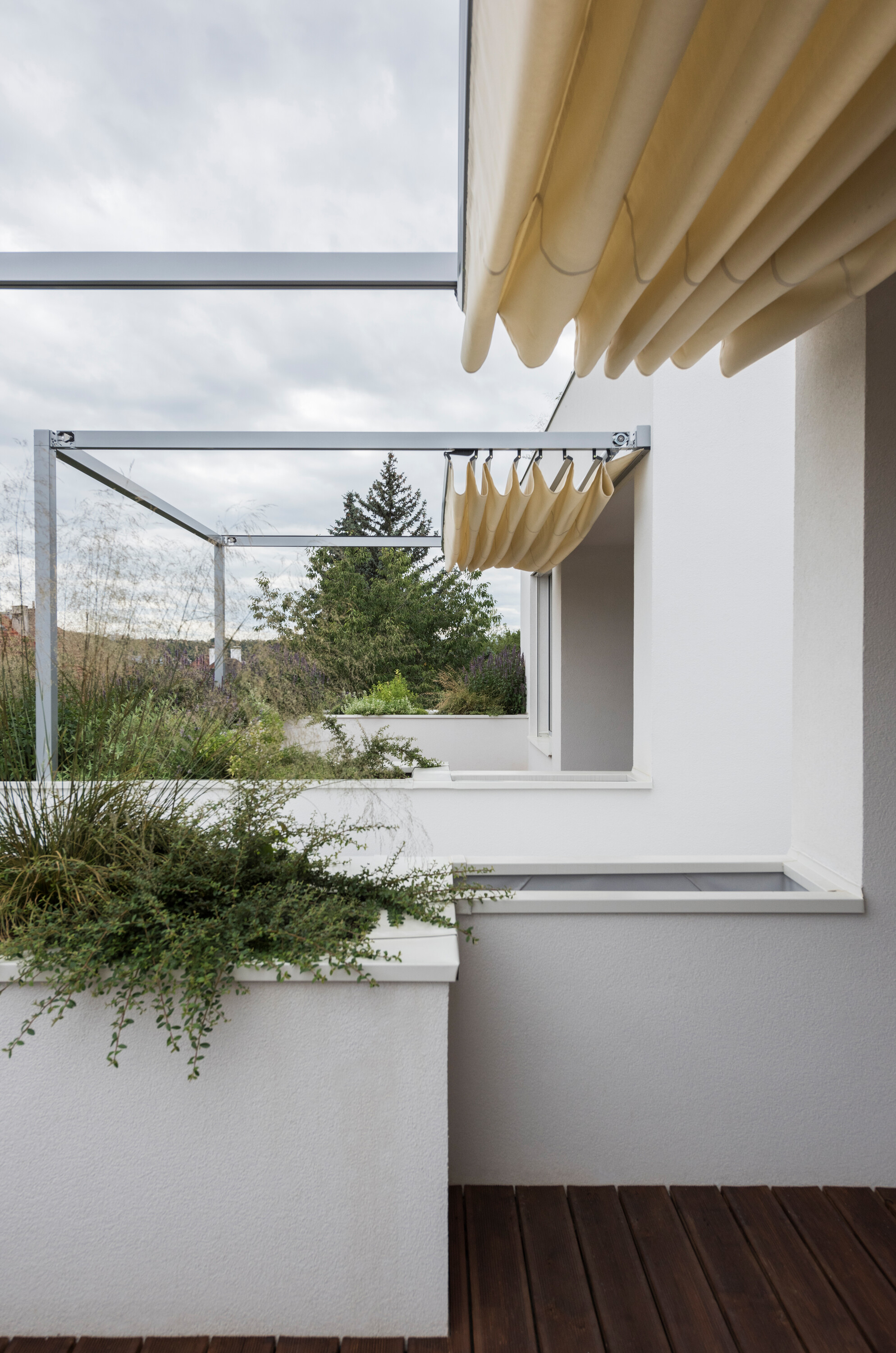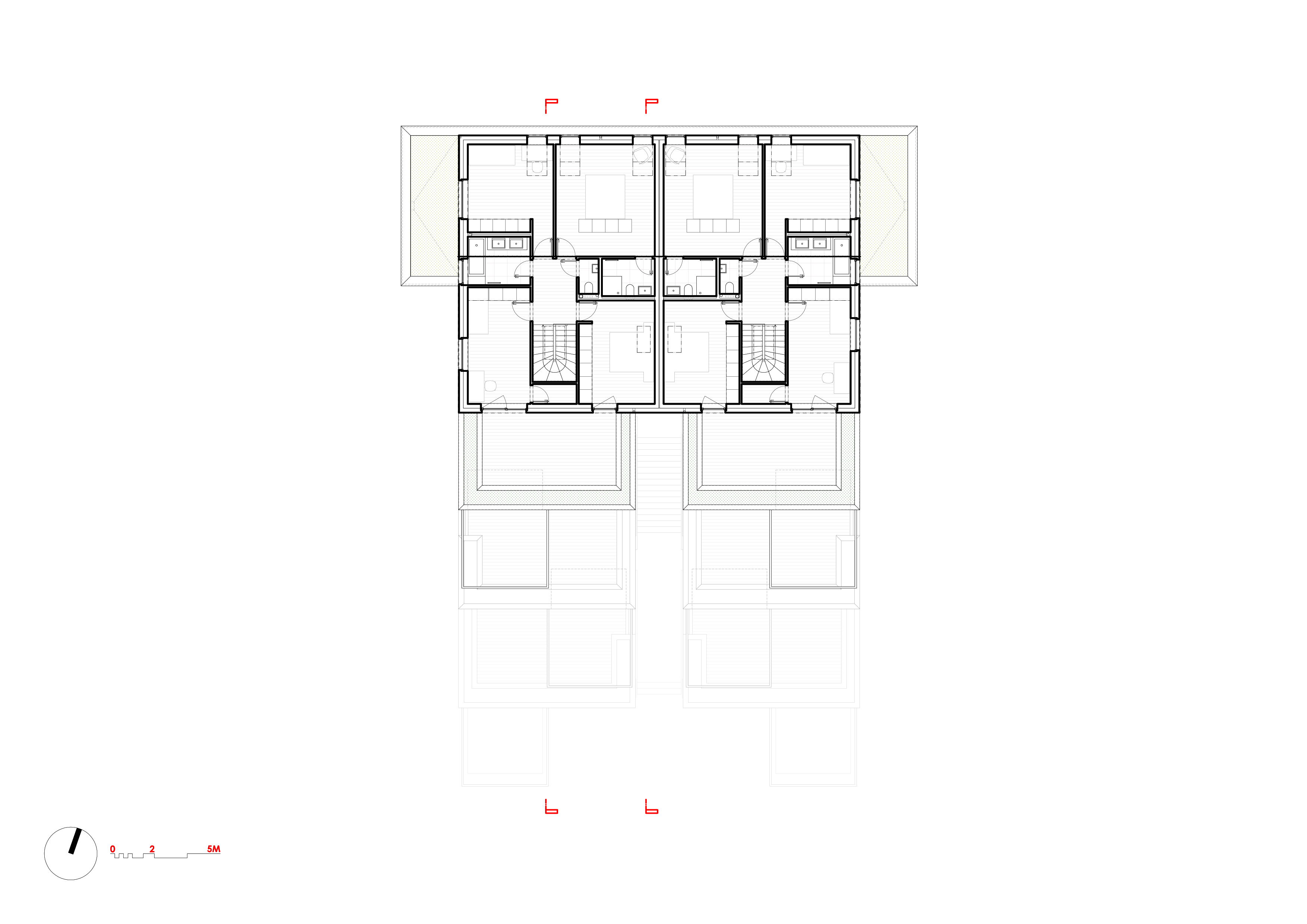 설계를 맡은 마르틴 체넥 아키텍처(martin cenek architecture)는 이러한 지형적·도시적 맥락을 적극적으로 읽어내며, 기존의 노후 단독주택을 대신해 두 개의 대칭적인 주거 유닛으로 구성된 테라스형 반연립 주택을 제안했다. 건물은 경사를 따라 단계적으로 후퇴하는 백색 매스로 구성되며, 남측으로는 숲이 우거진 경관을 향해 열리고, 북측 도로를 향해서는 절제된 도시적 표정을 갖는다. 이로써 건물은 도시를 향한 얼굴과 녹지를 향한 얼굴, 두 가지 성격을 동시에 지닌다.