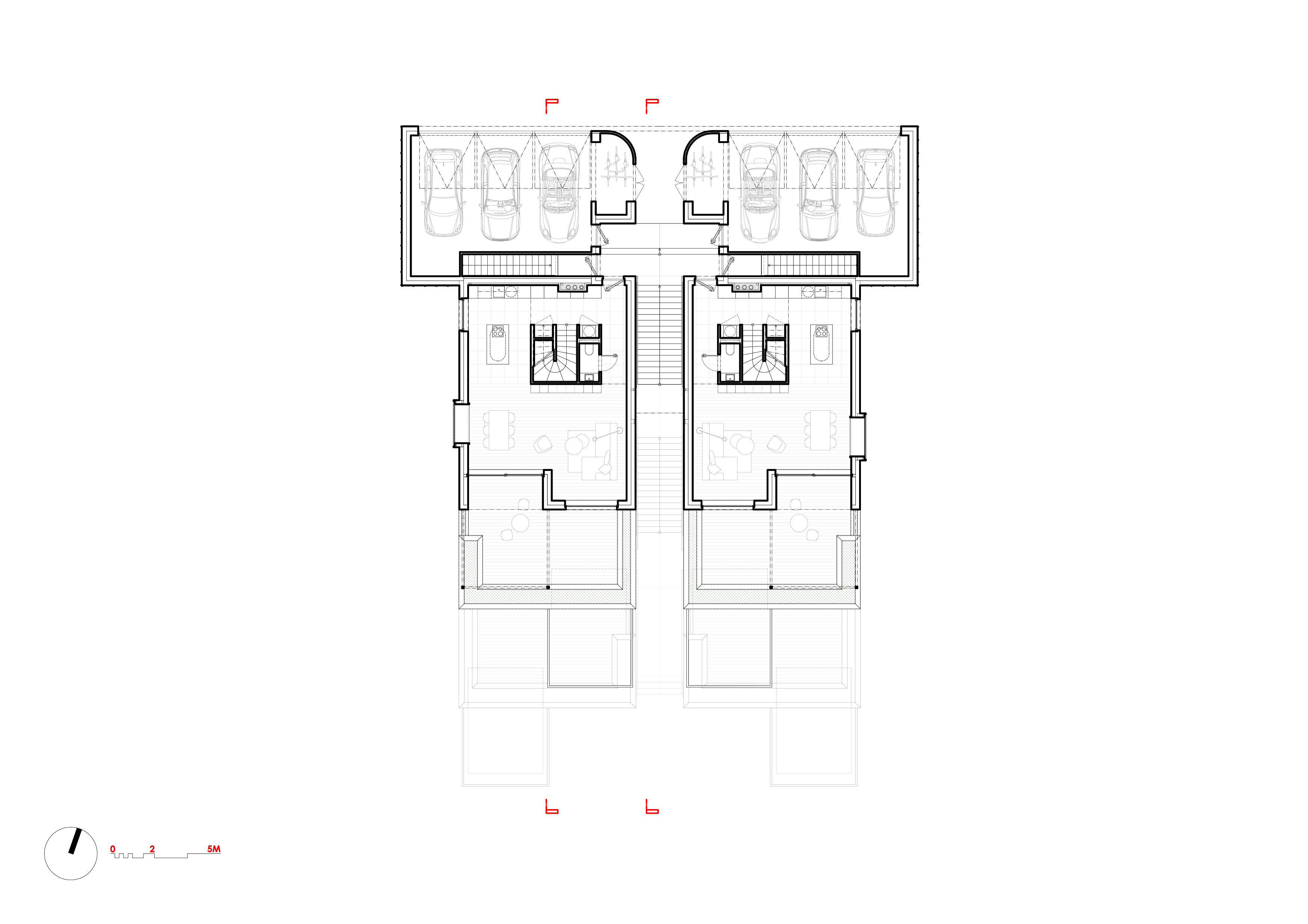 출입은 두 유닛 사이를 관통하는 외부 계단을 통해 이루어진다. 이 계단은 거리와 약 8미터 아래에 위치한 정원을 연결하는 수직 동선으로, 건물의 중심을 가로지르는 명확한 절개선이 된다. 내부 구성은 고전적인 아파트 빌라 유형에서 착안해, 각 세대가 독립된 출입구를 갖는 세 개의 주거 유닛으로 구성되었다. 지하에는 공용 창고와 자전거 보관소, 차고가 배치되고, 남측의 정원과 벽난로 공간은 모든 거주자가 공유한다.