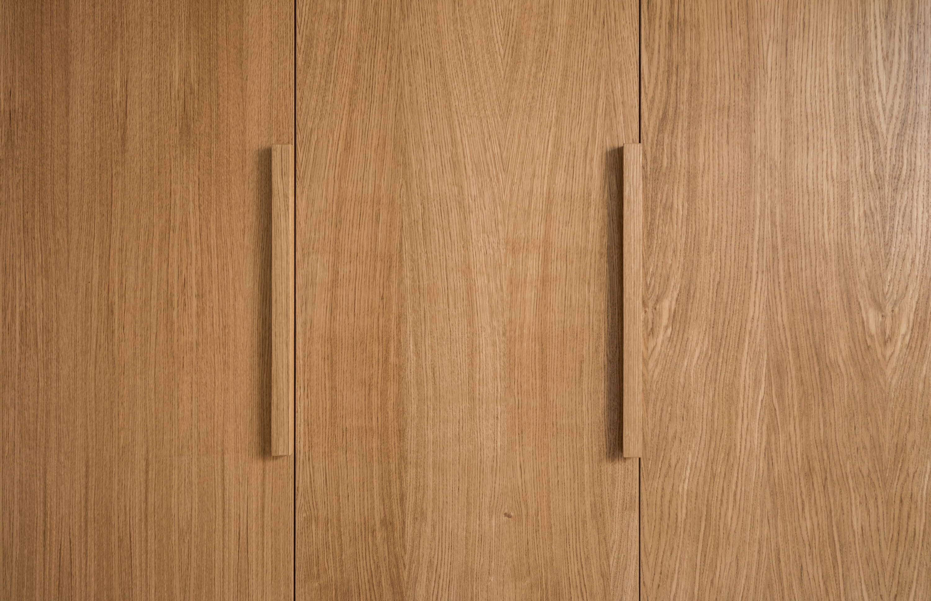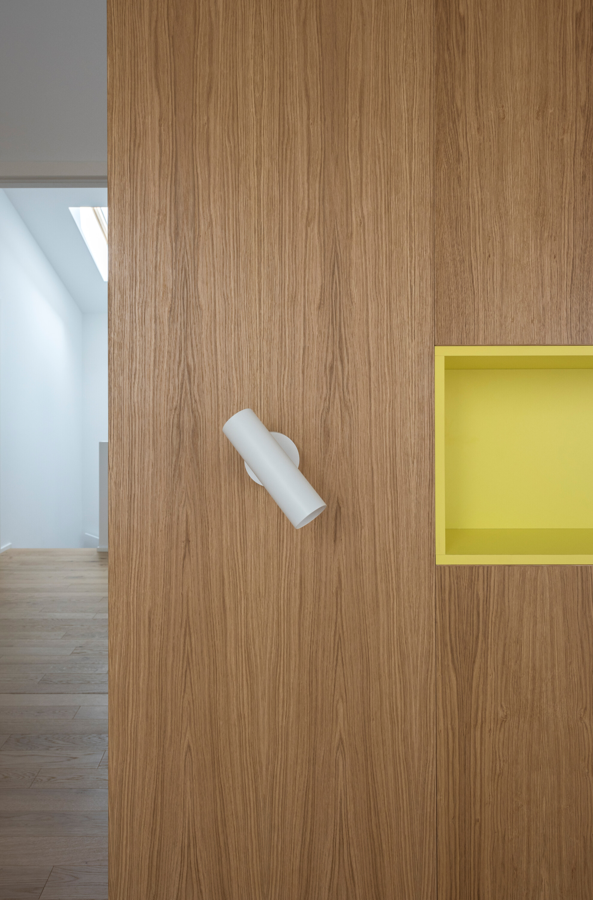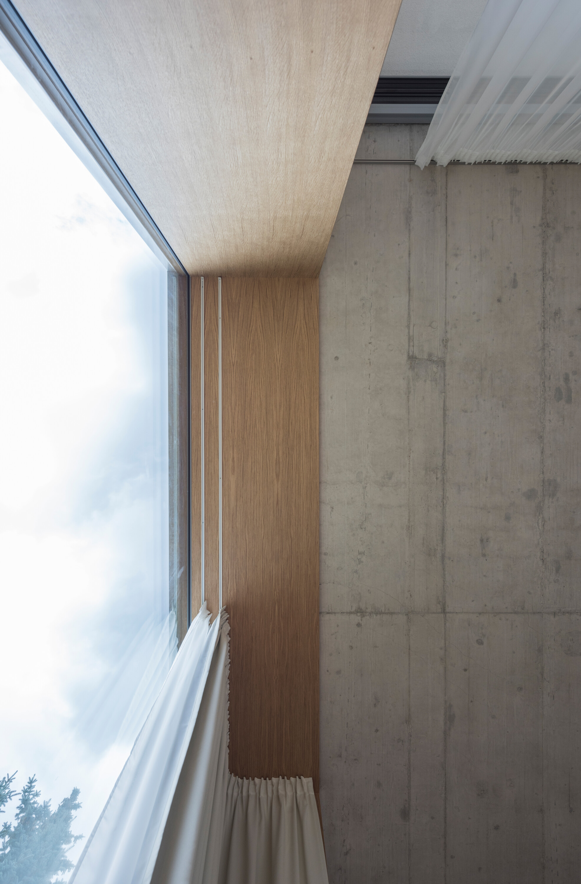 실내에서는 외부의 단색적 인상과 대비되는 색채가 적극적으로 사용된다. 오크 베니어에 컬러 래커 마감이 더해진 맞춤 가구는 공간에 리듬을 부여하며, 테라스의 노란 캐노피 퍼골라는 외부 공간에 명확한 성격을 더한다. 거실에는 프레임 없는 깊은 창이 설치되어, 개구부 자체가 하나의 공간 요소로 작동한다. 일부 생활 공간에서는 철근콘크리트 슬래브가 노출되어 구조적 질감이 그대로 드러난다.
