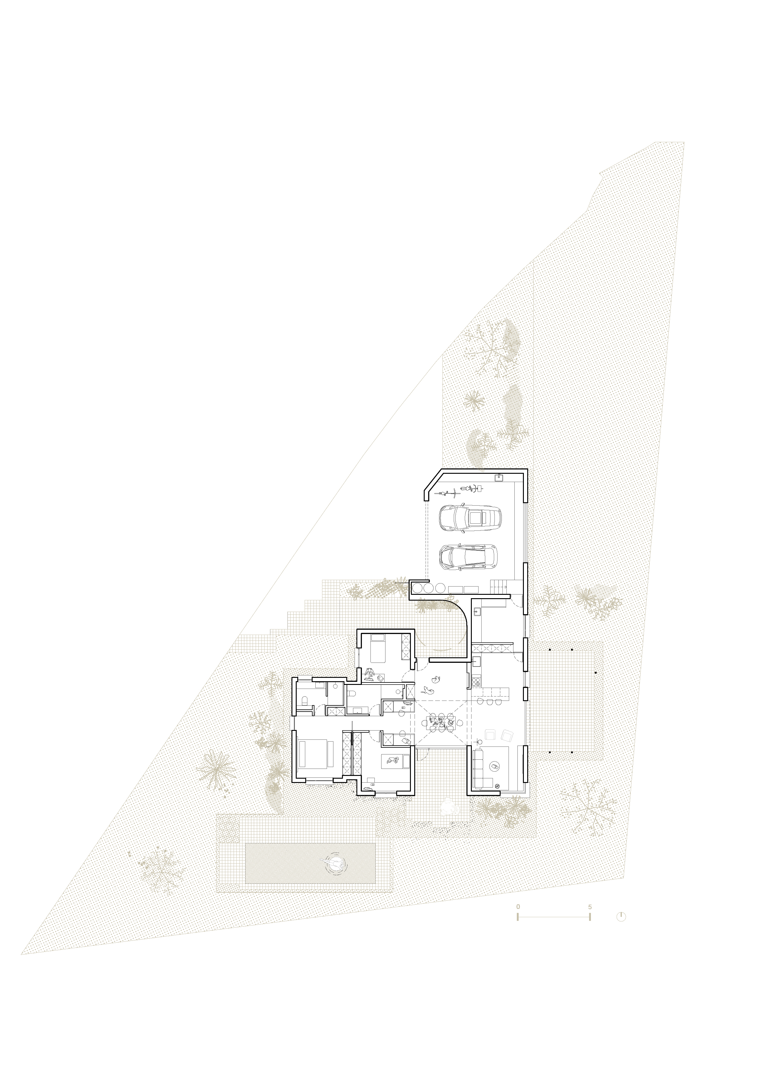 대지는 마을에서 가장 낮은 지점에 위치해 있어 빗물이 자연스럽게 모이는 곳이다. 이에 따라 주택은 지면에서 약 1.2미터 들어 올려 배치되었고, 지역 특유의 강한 트라몬타나 바람을 막기 위해 형태와 방향이 조정되었다. 계단식으로 배열된 매스는 삼각형 대지의 형상과 전통 농가의 분절된 배치를 반영하며, 주변 농촌 풍경 속에 자연스럽게 스며든다.