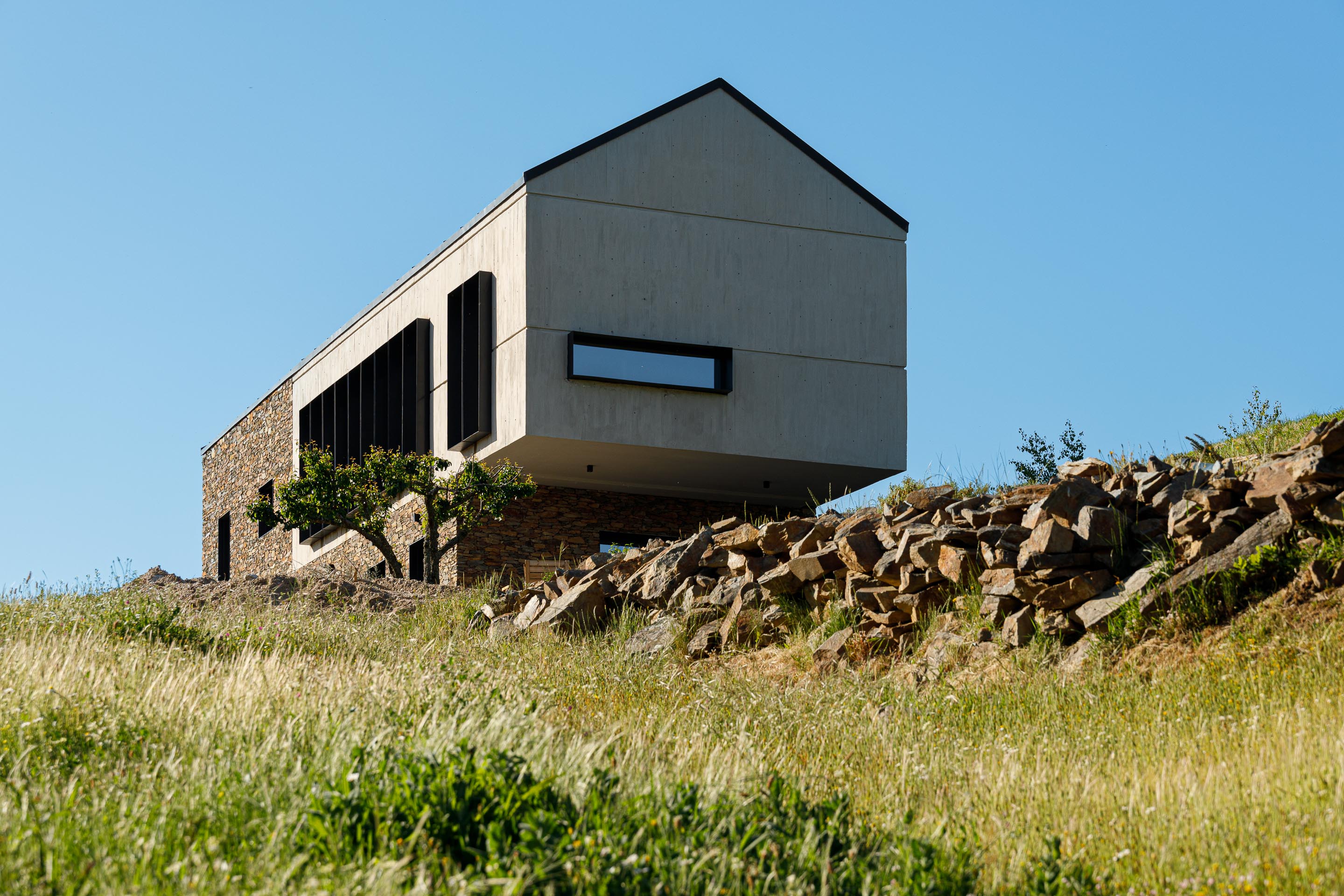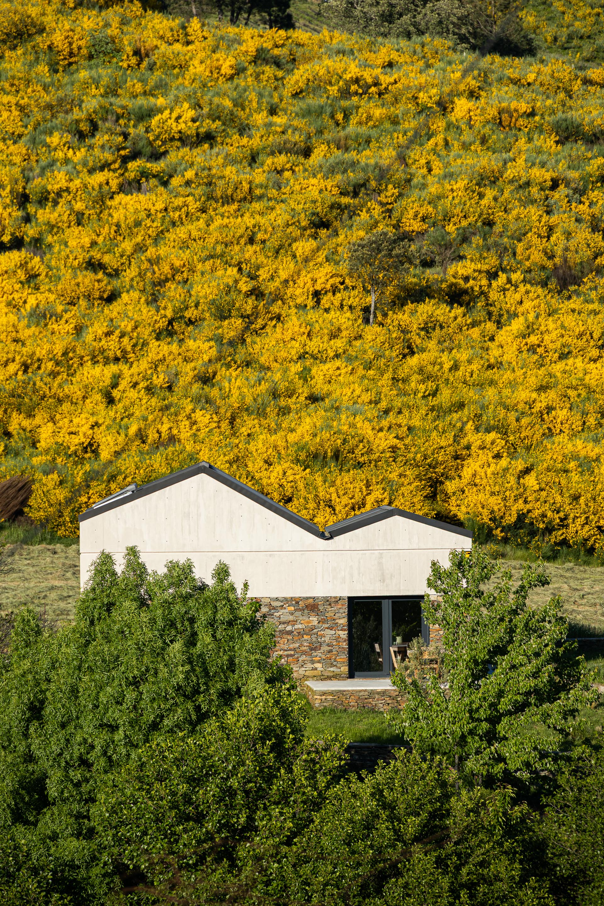자연 보호 구역이라는 엄격한 제약은 오히려 설계의 동력이 되었다. 건축은 전통적 편암 매스를 기반으로 하되, 노출 콘크리트로 이루어진 캔틸레버 볼륨을 통해 현재성을 드러낸다. 이 부유하는 듯한 구조는 풍경을 향해 과감하게 열리며, 산의 윤곽을 프레임처럼 끌어들인다. 빛과 공기, 냄새와 소리가 실내 깊숙이 스며들며, 건축과 자연의 경계는 느슨해진다.