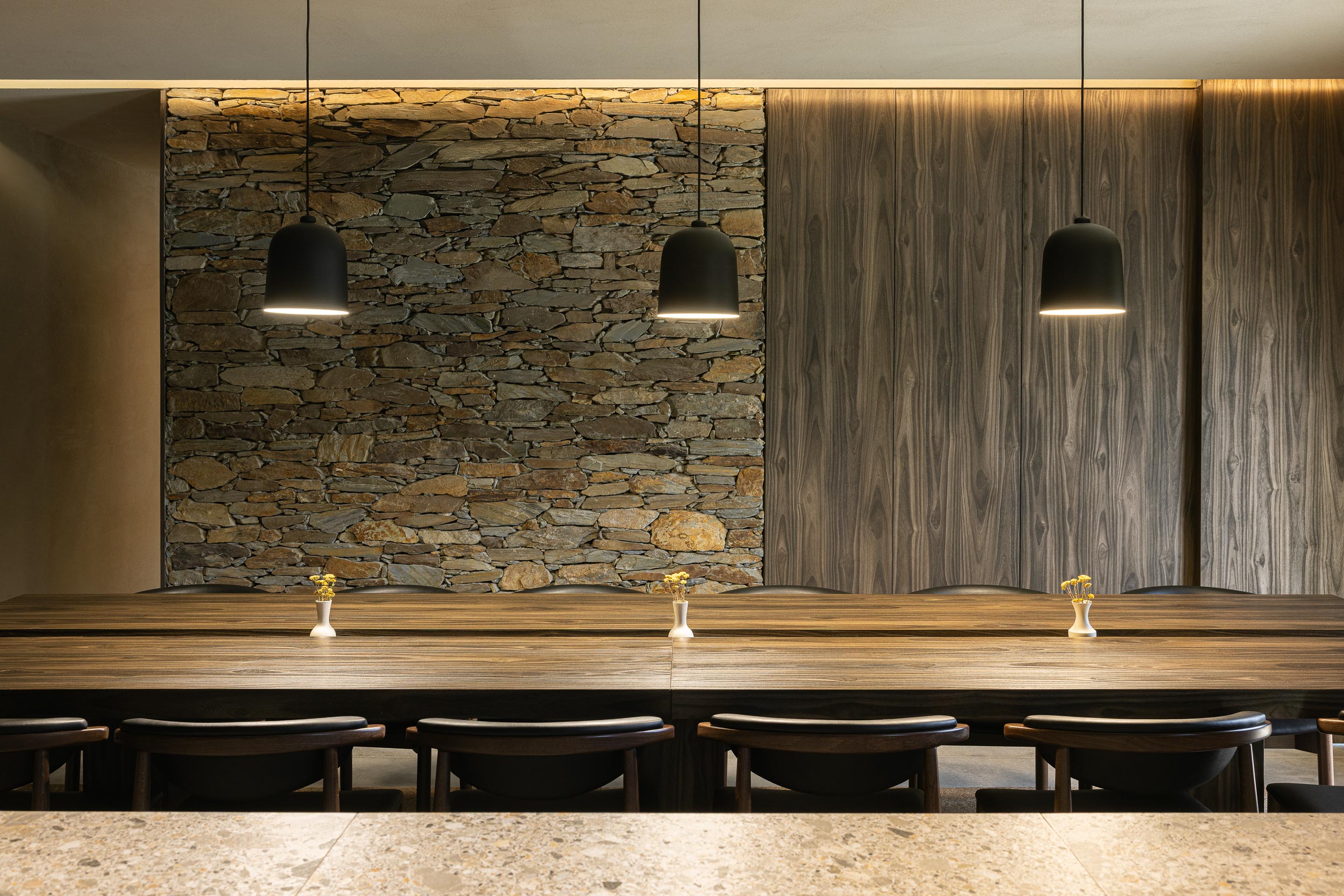 자연 보호 구역이라는 엄격한 제약은 오히려 설계의 동력이 되었다. 건축은 전통적 편암 매스를 기반으로 하되, 노출 콘크리트로 이루어진 캔틸레버 볼륨을 통해 현재성을 드러낸다. 이 부유하는 듯한 구조는 풍경을 향해 과감하게 열리며, 산의 윤곽을 프레임처럼 끌어들인다. 빛과 공기, 냄새와 소리가 실내 깊숙이 스며들며, 건축과 자연의 경계는 느슨해진다.