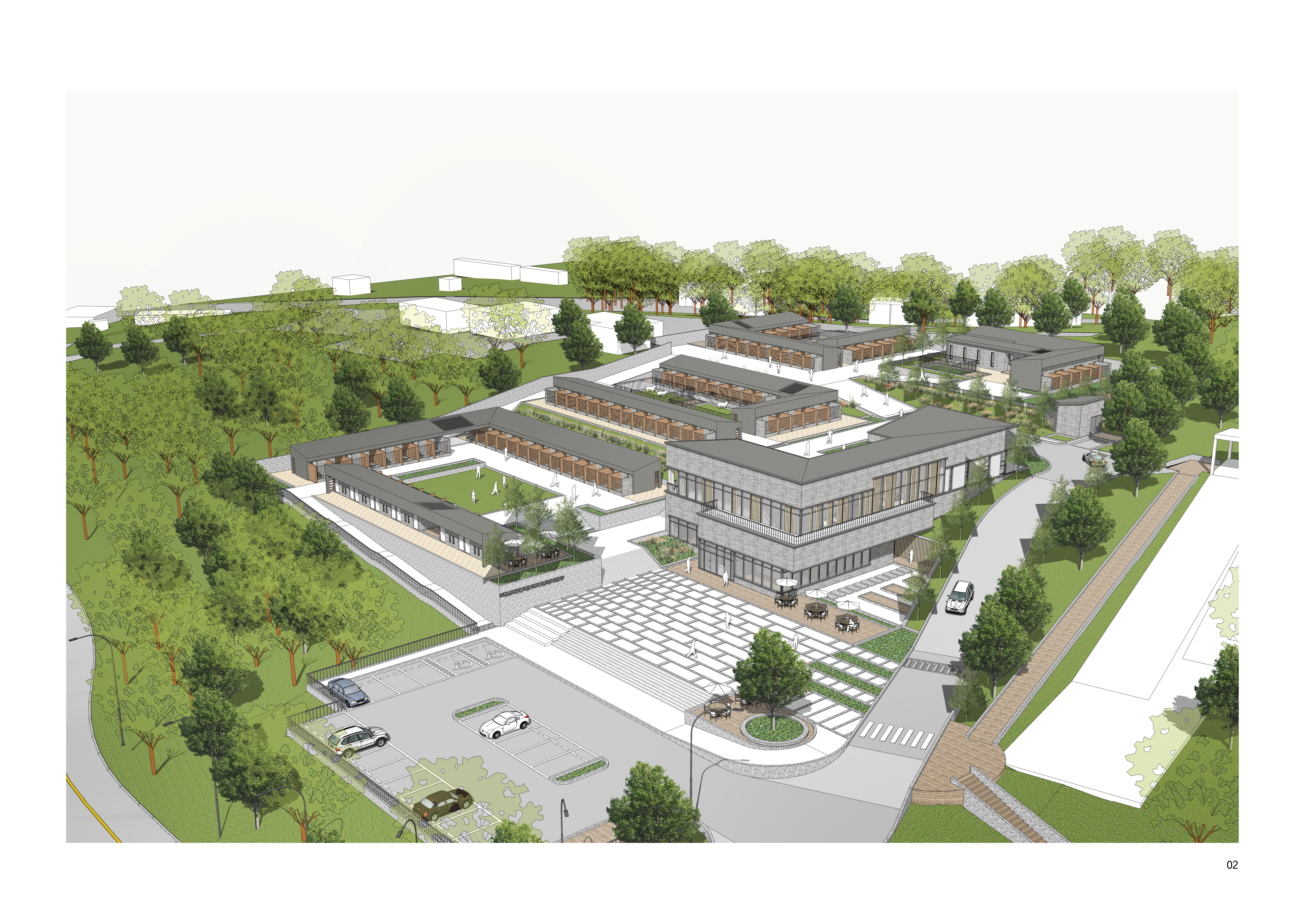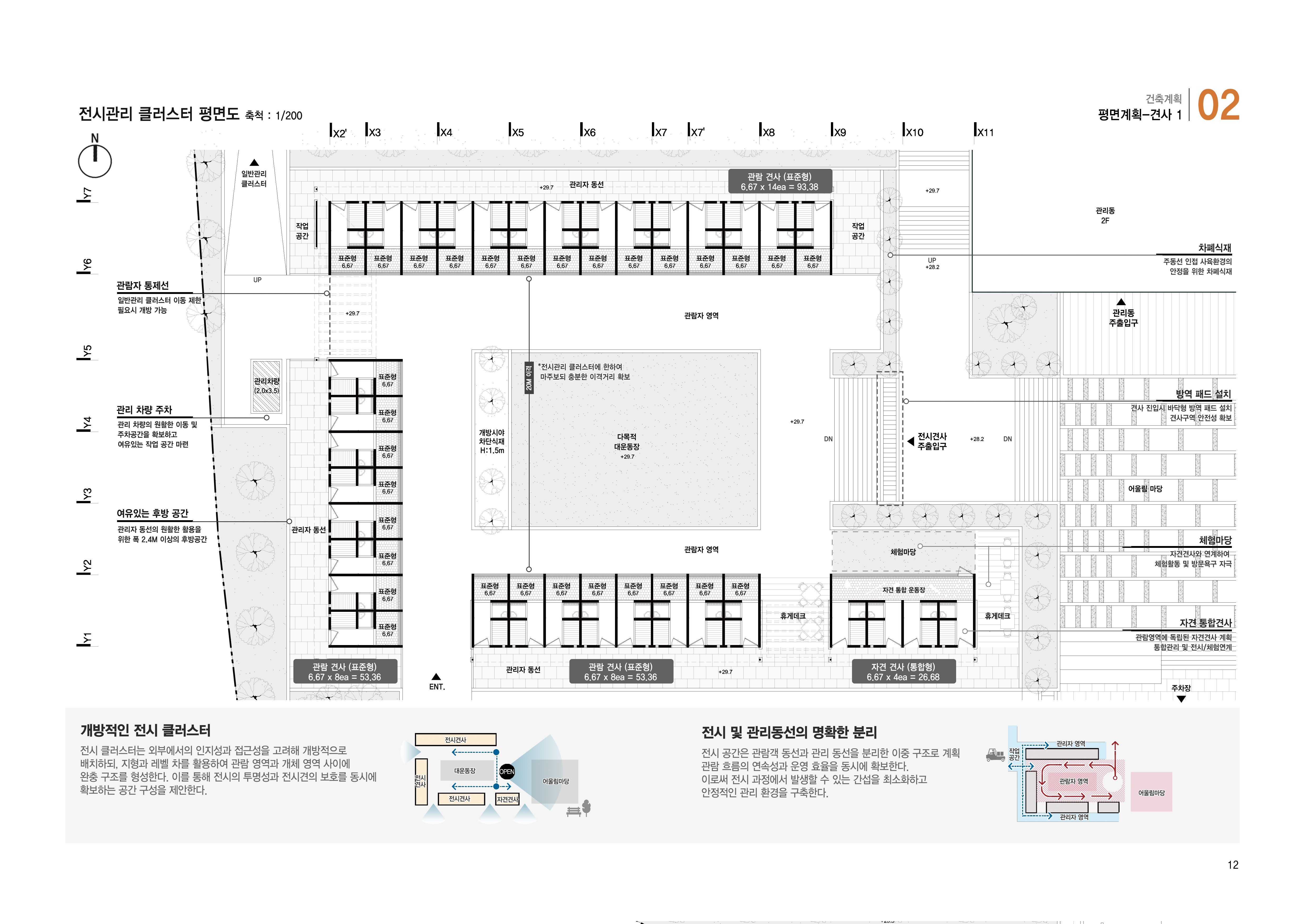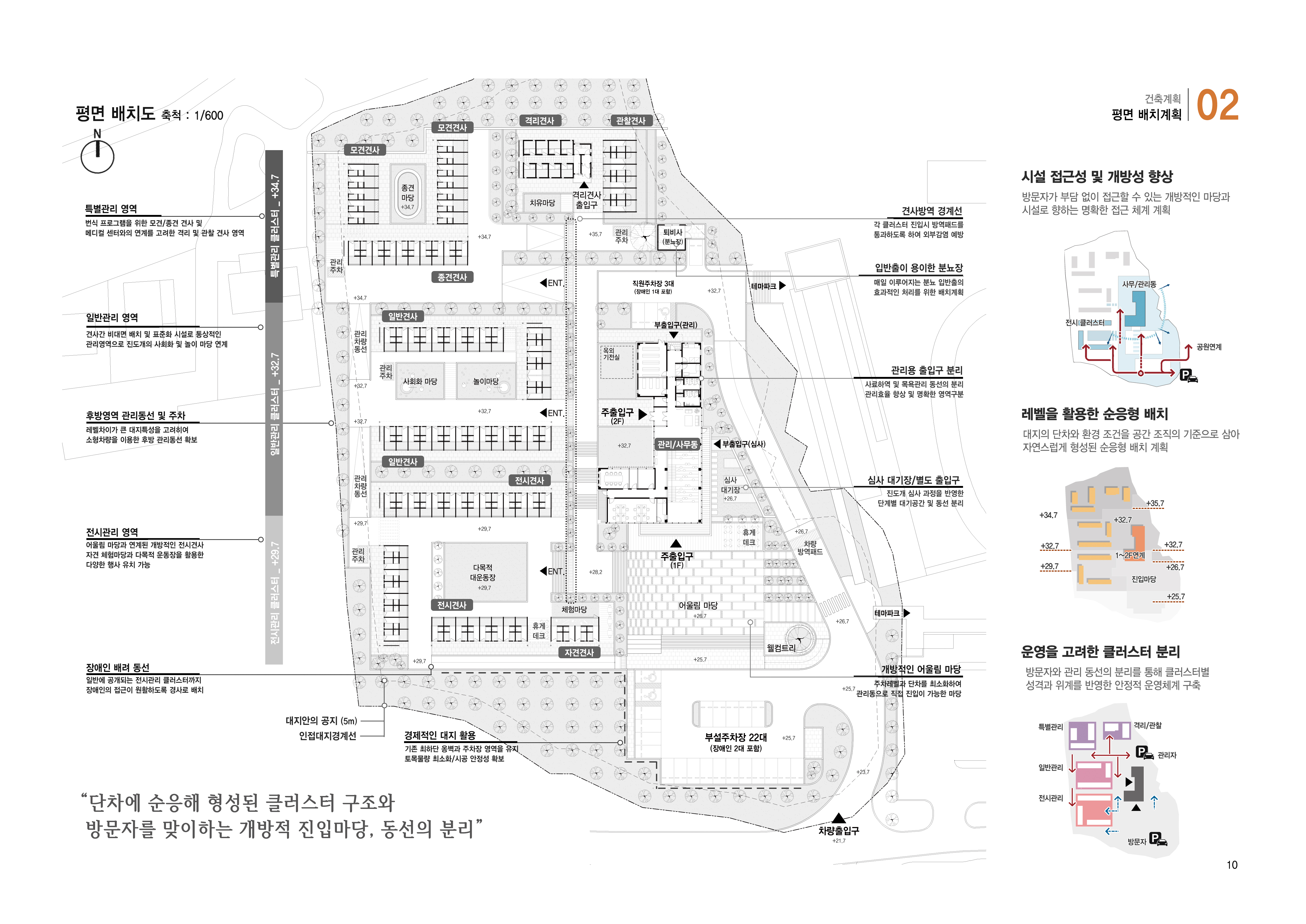 대지의 단차를 활용해 기능별 클러스터를 레벨별로 배치함. 높이 차이를 통해 영역간 간섭을 줄이고, 각 클러스터가 독립적으로 운영되면서도 전체 시설의 관리·이동 체계와 유기적으로 연결되도록 계획