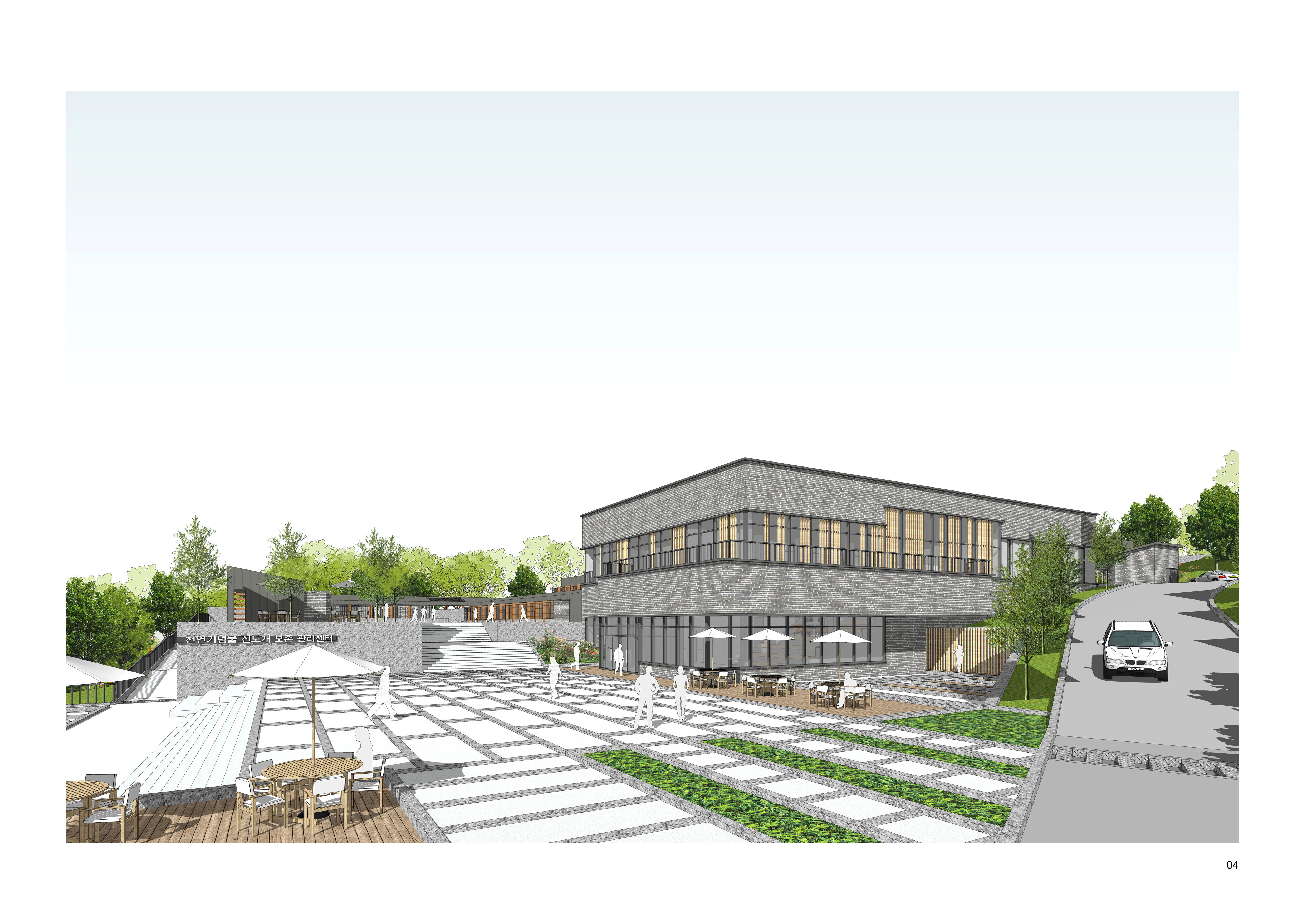전면 광장을 보존센터의 주요 진입 결절점으로 설정해 외부 동선과 시설 내부를 명확히 연결함. 광장은 집결·대기·분산 기능을 수행하며, 전시 동선과 직접 연계되어 방문 흐름을 단계적으로 내부 프로그램으로 유도