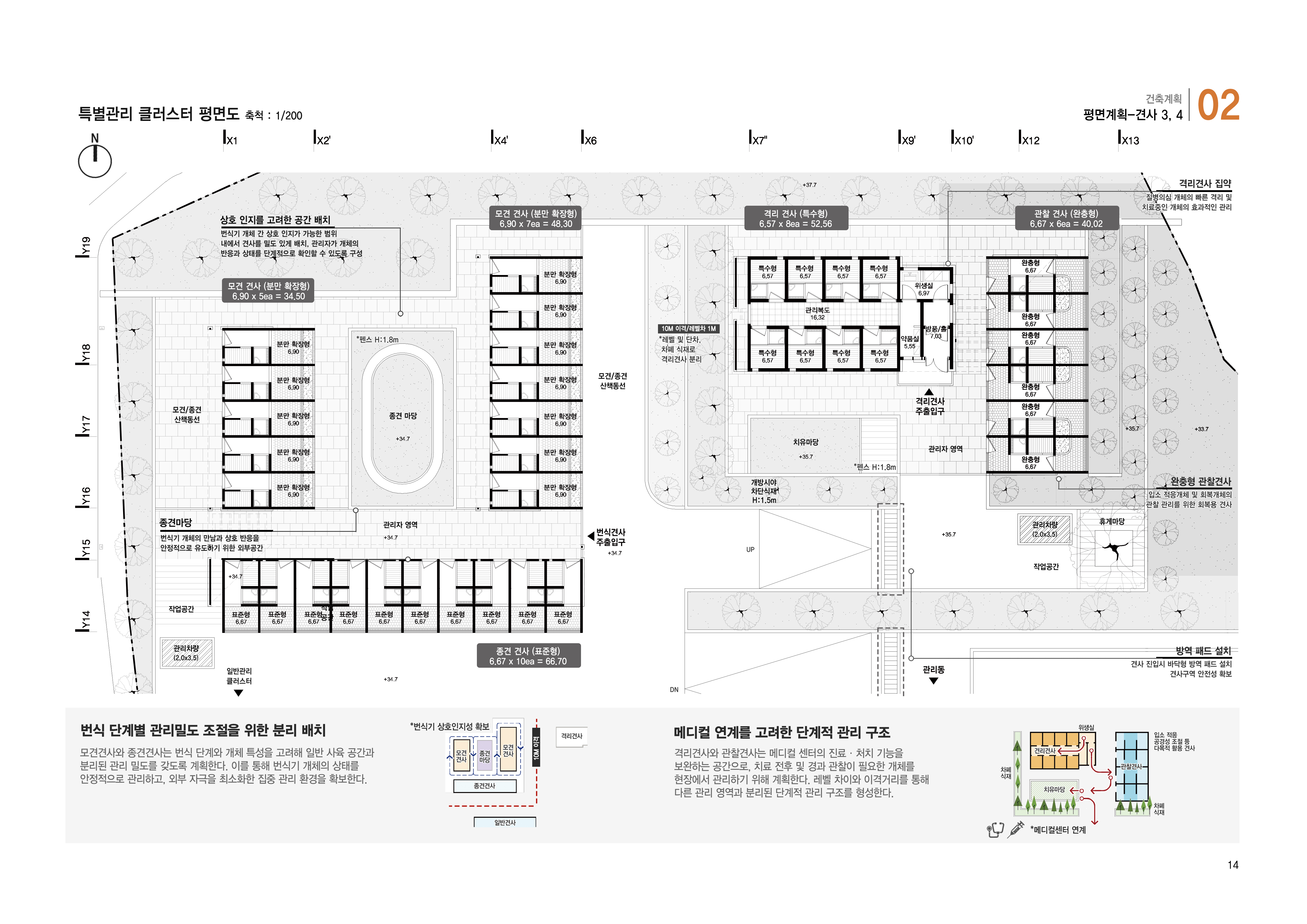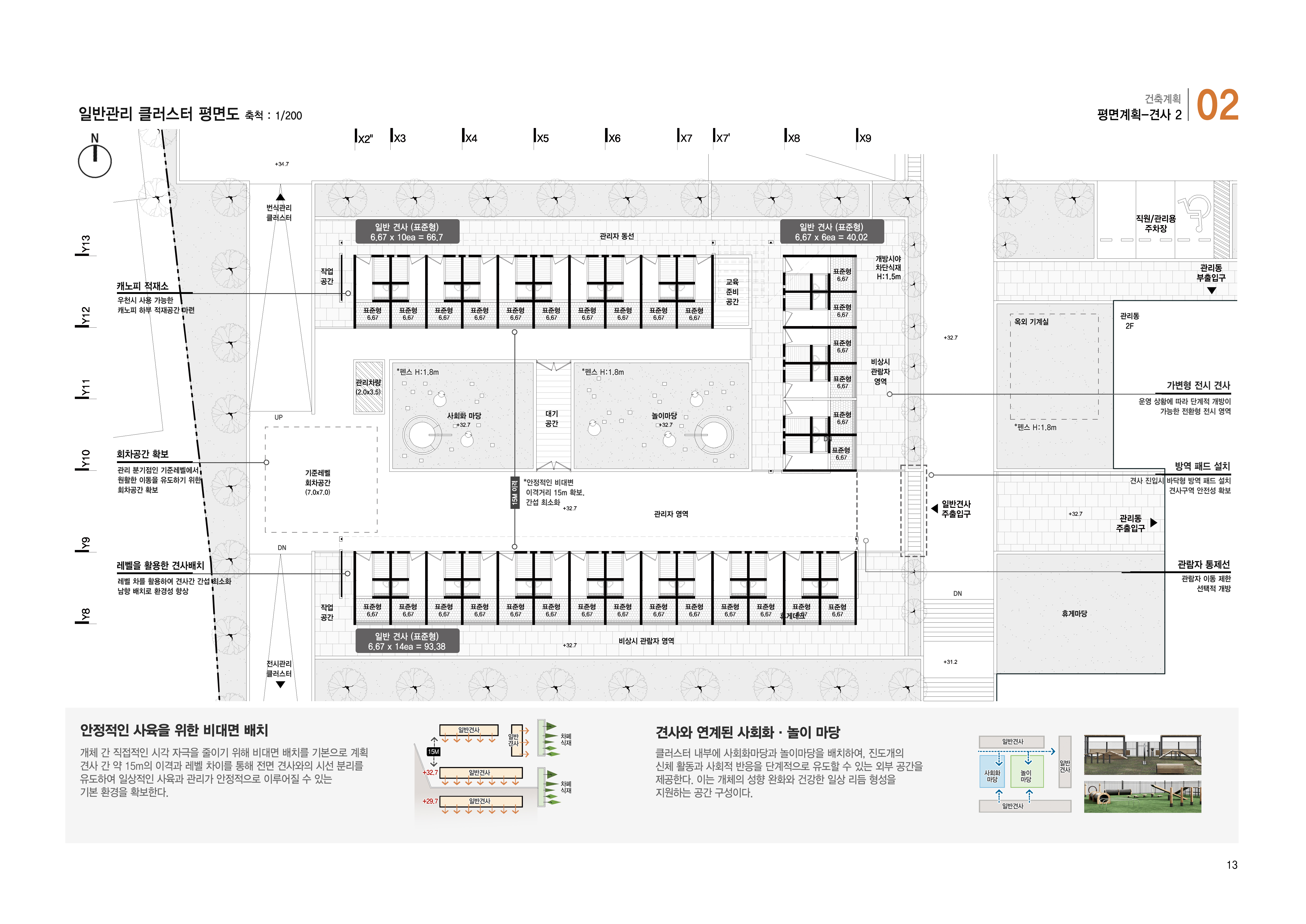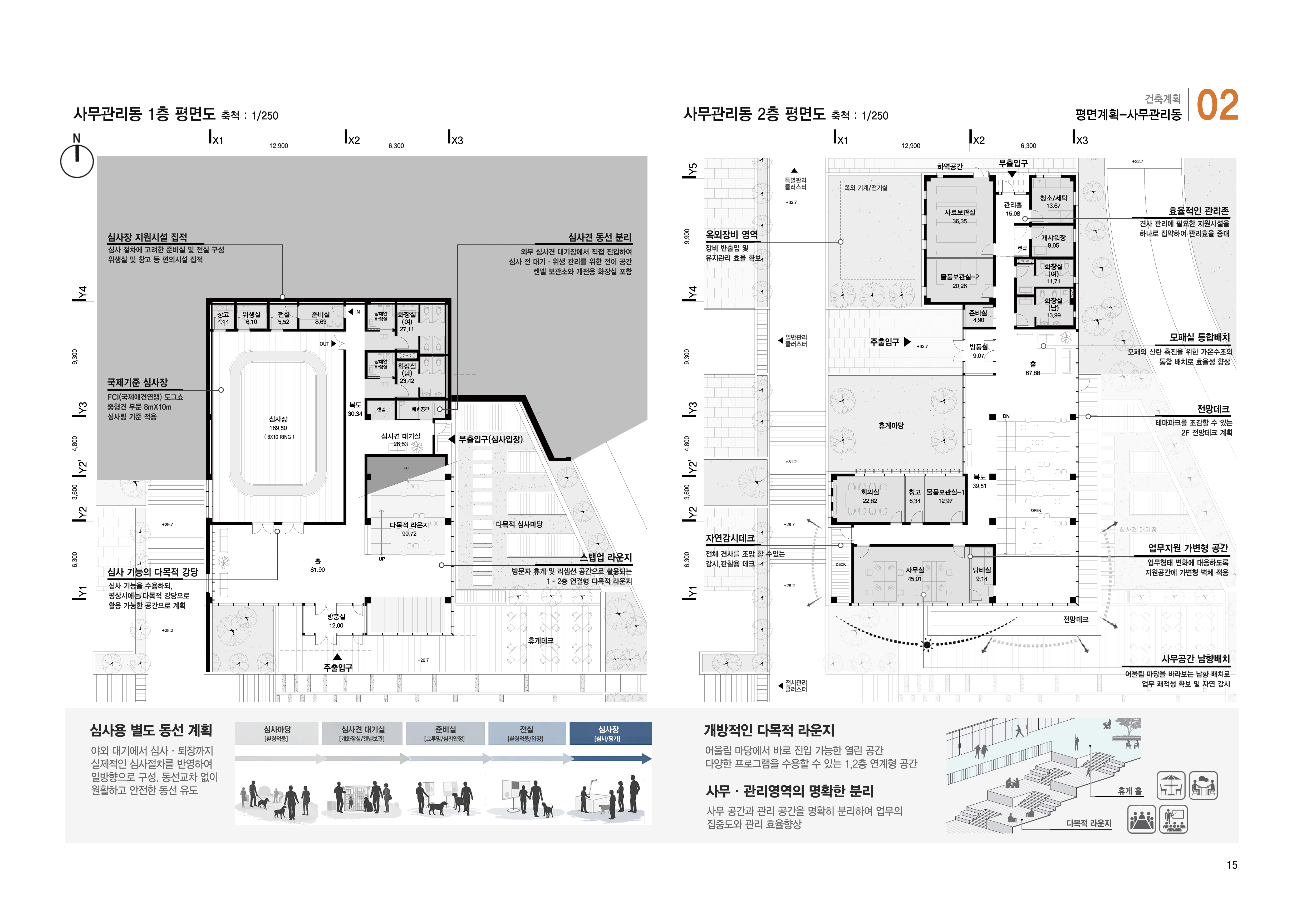 관람·관리·사육·번식·회복 영역을 기능별로 명확히 분리해 동선의 교차를 최소화함. 접근 단계에 따른 조닝과 통제 체계를 통해 운영 효율을 확보하고, 진도개와 방문자 모두의 안전을 구조적으로 확보