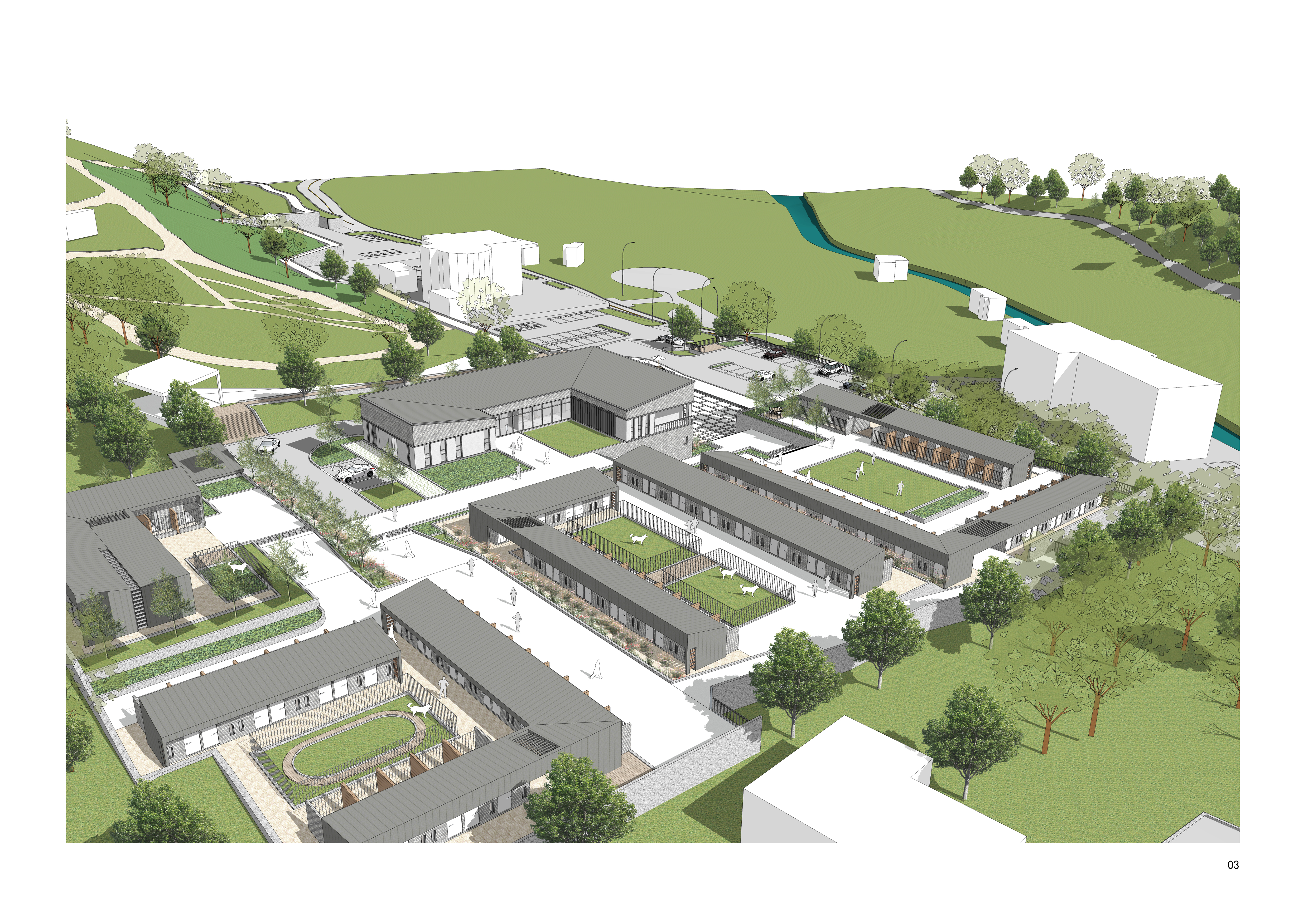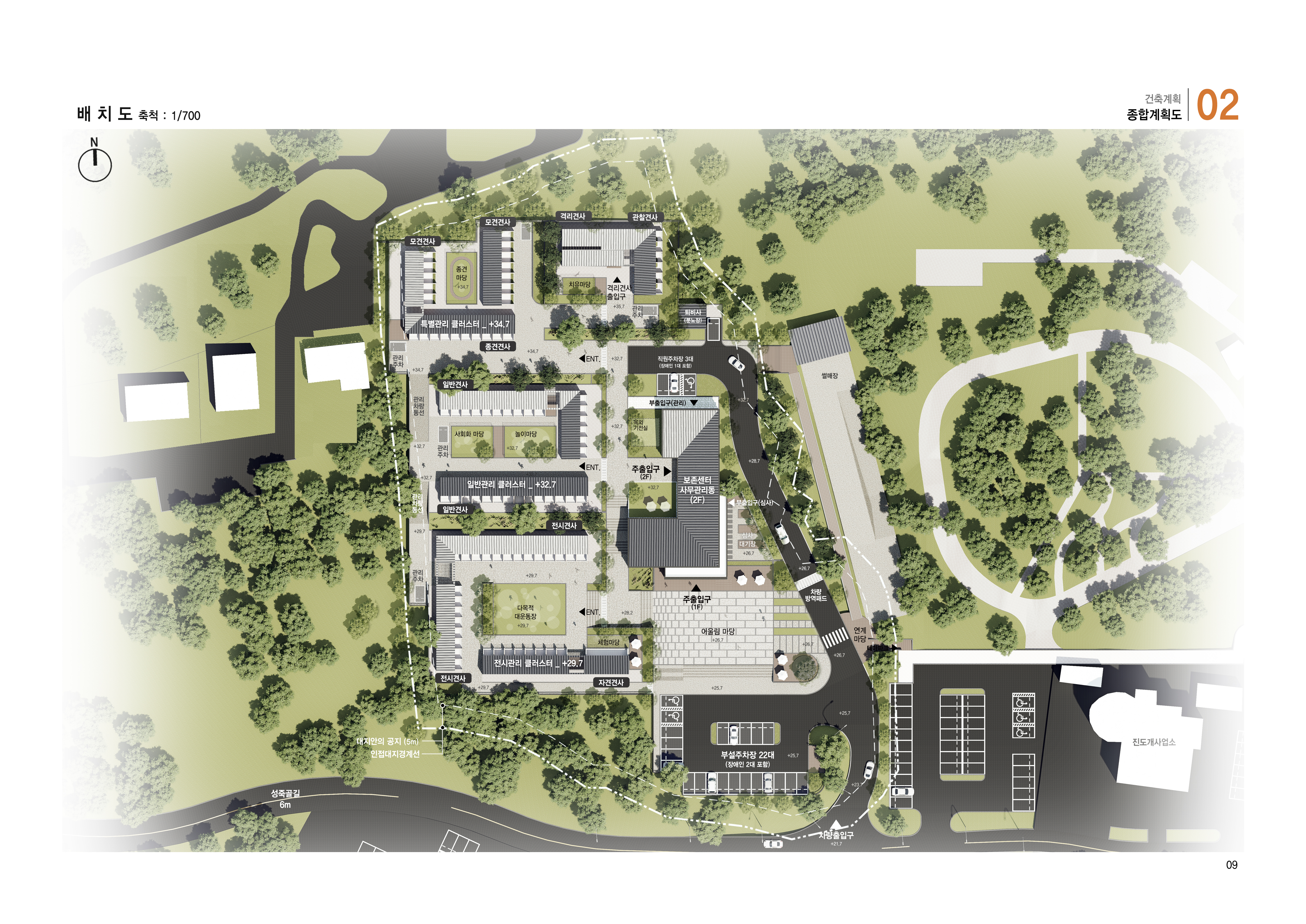 본 계획은 진도개를 보호의 대상이 아닌, 생활의 영역과 리듬을 가진 존재로 인식하는 데서 출발한다. 사육·번식·회복·관람·관리 기능을 단일 시설이 아닌 마을의 구성 요소로 재편해, 진도개의 성향과 생애주기에 대응하는 공간 체계를 구축한다. 대지의 단차와 레벨 차이를 활용해 클러스터 간 간섭을 줄이고, 명확한 조닝과 동선 분리를 통해 안전하고 효율적인 운영 환경을 형성한다. 이를 통해 본 시설이 하나의 관리센터가 아닌, 진도개의 삶이 지속되는 마을로 작동되길 기대한다.
