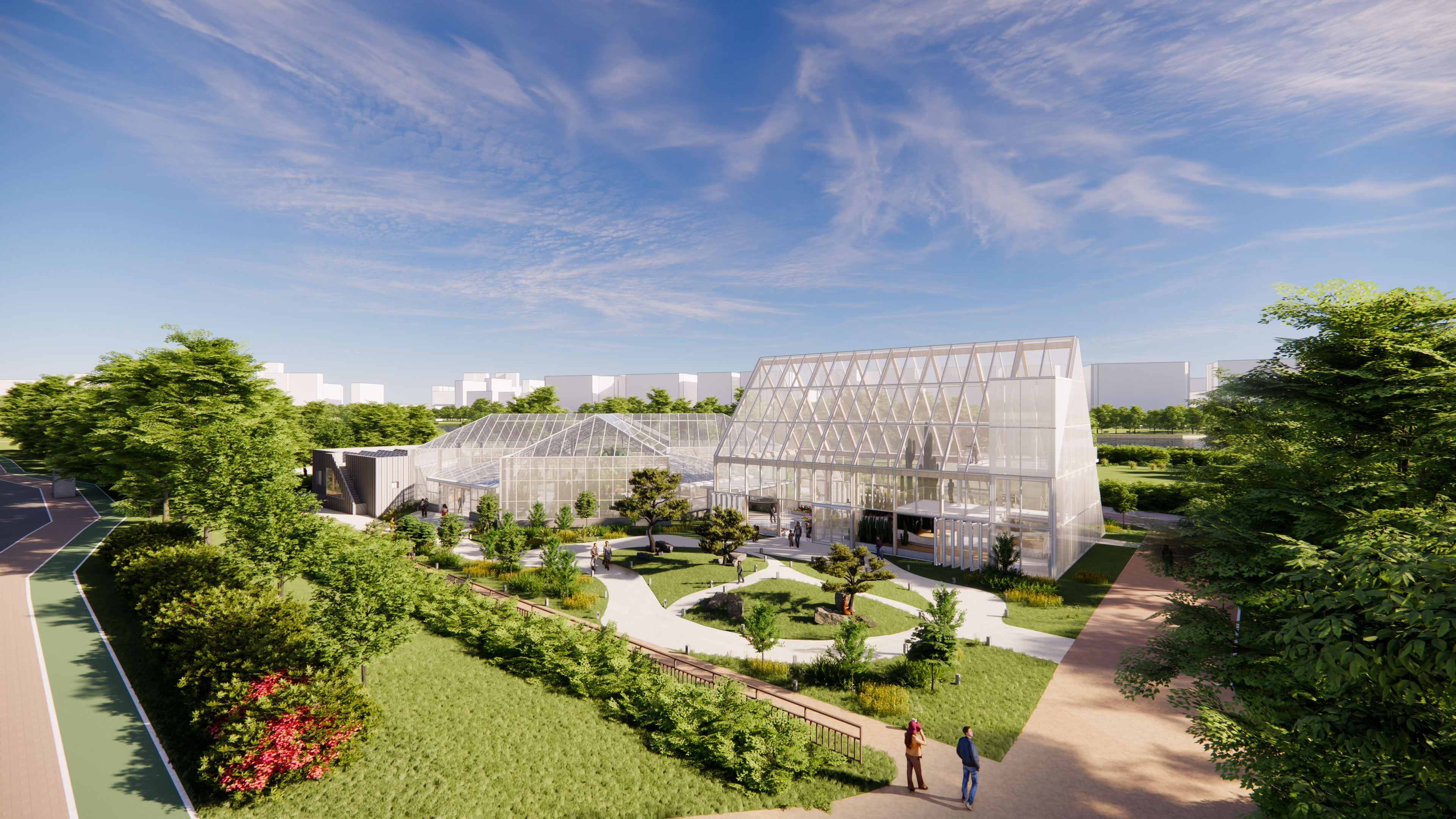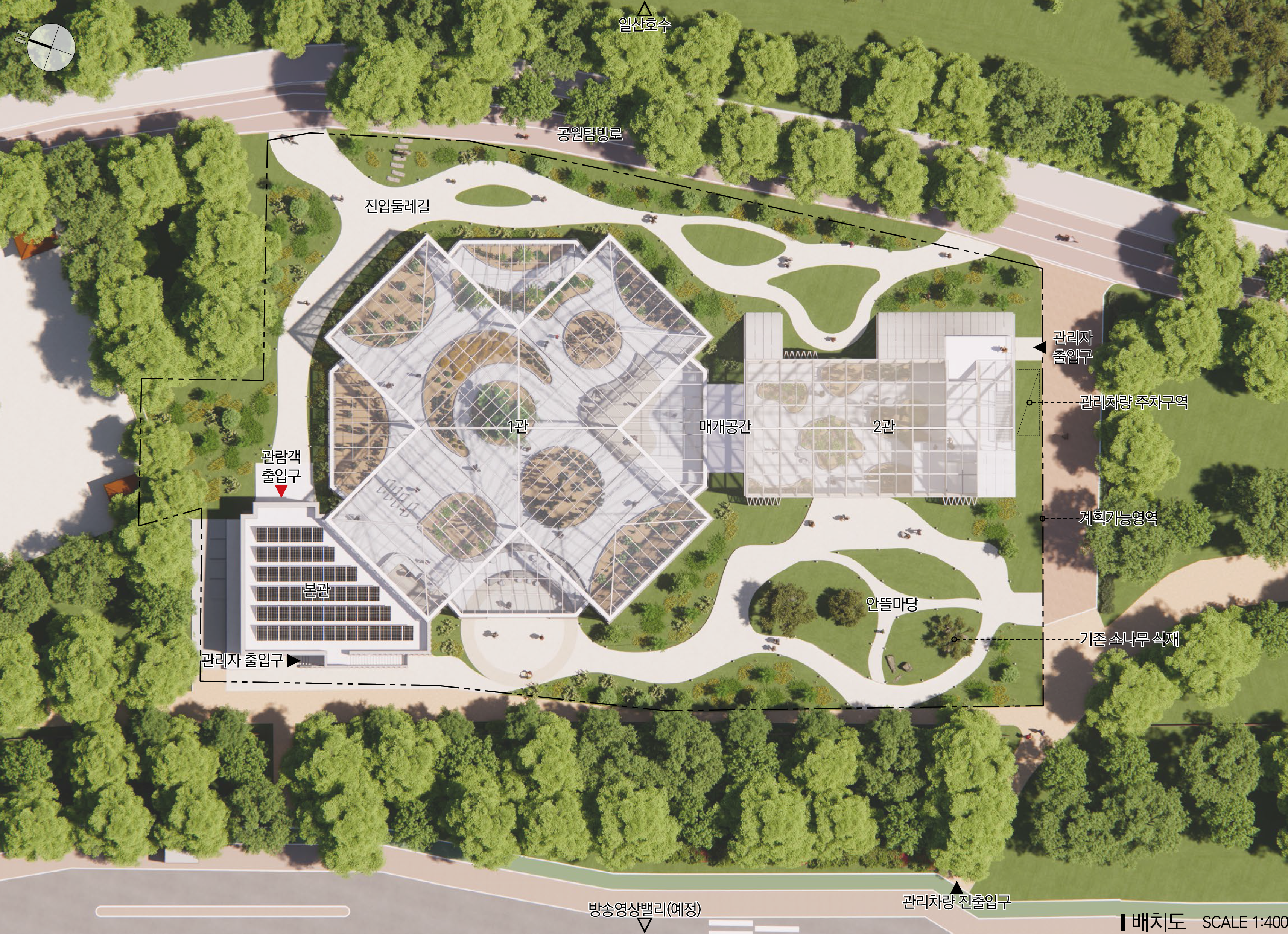 전면의 외부공간은 공원탐방로와 접한 진입둘레길로 조성하여 다수의 방향성을 갖는 진입공간으로 사용 되게한다. 배면의 외부공간은 전시온실과 연결되는 야외조경전시 공간으로 조성해 식물원 관람의 확장을 고려한다.