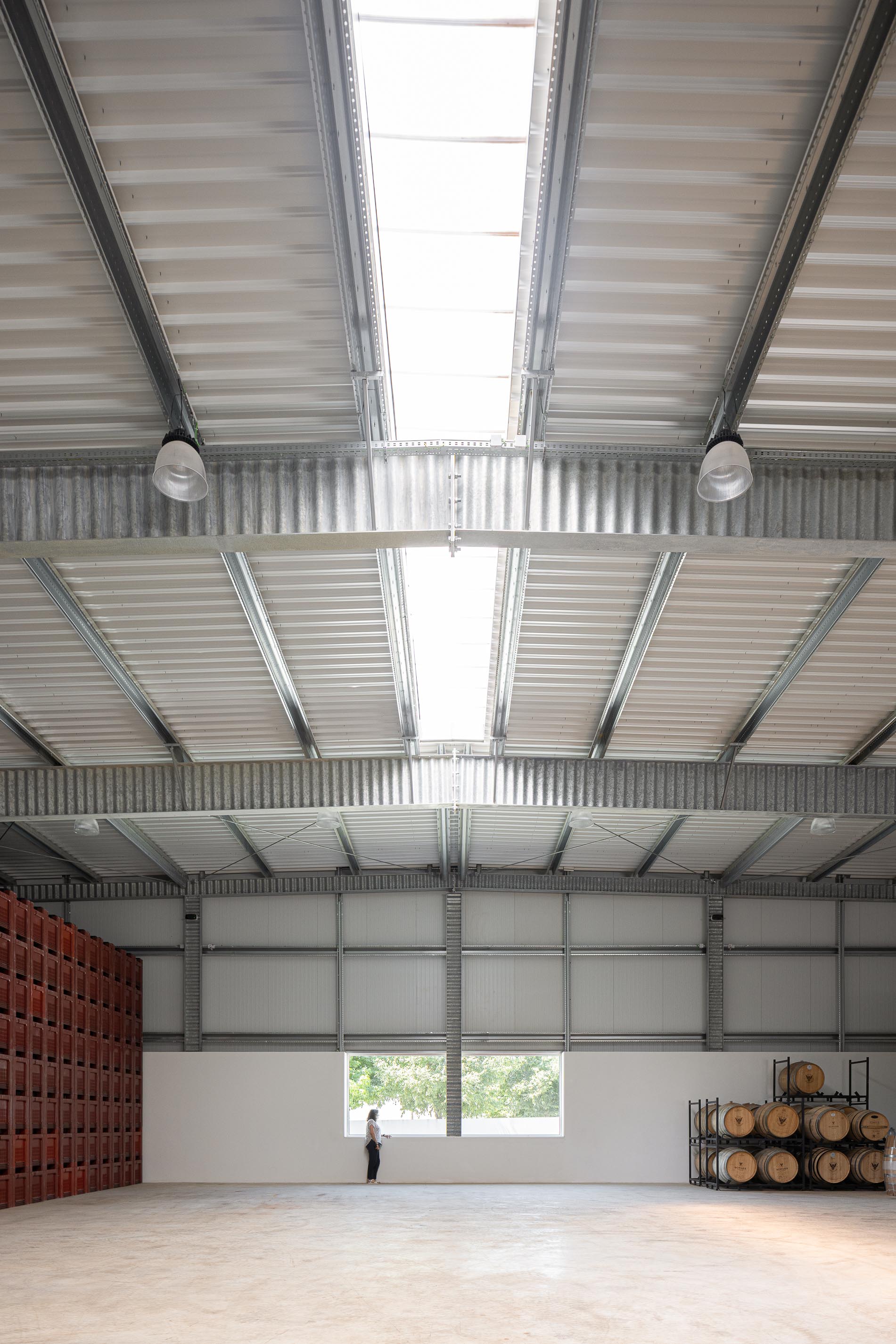 내부는 생산 공정의 흐름에 따라 구성된다. 중앙에는 대형 스테인리스 스틸 발효 탱크가 배치되어 와이너리의 핵심 공간을 형성한다. 이를 둘러싼 유지관리용 보행 데크는 기술적 정밀성과 동시에 조형적 스케일을 드러낸다. 양측과 메자닌에는 행정 및 사회 공간이 자리하며, 산업적 기능과 사용자 경험이 균형을 이룬다.