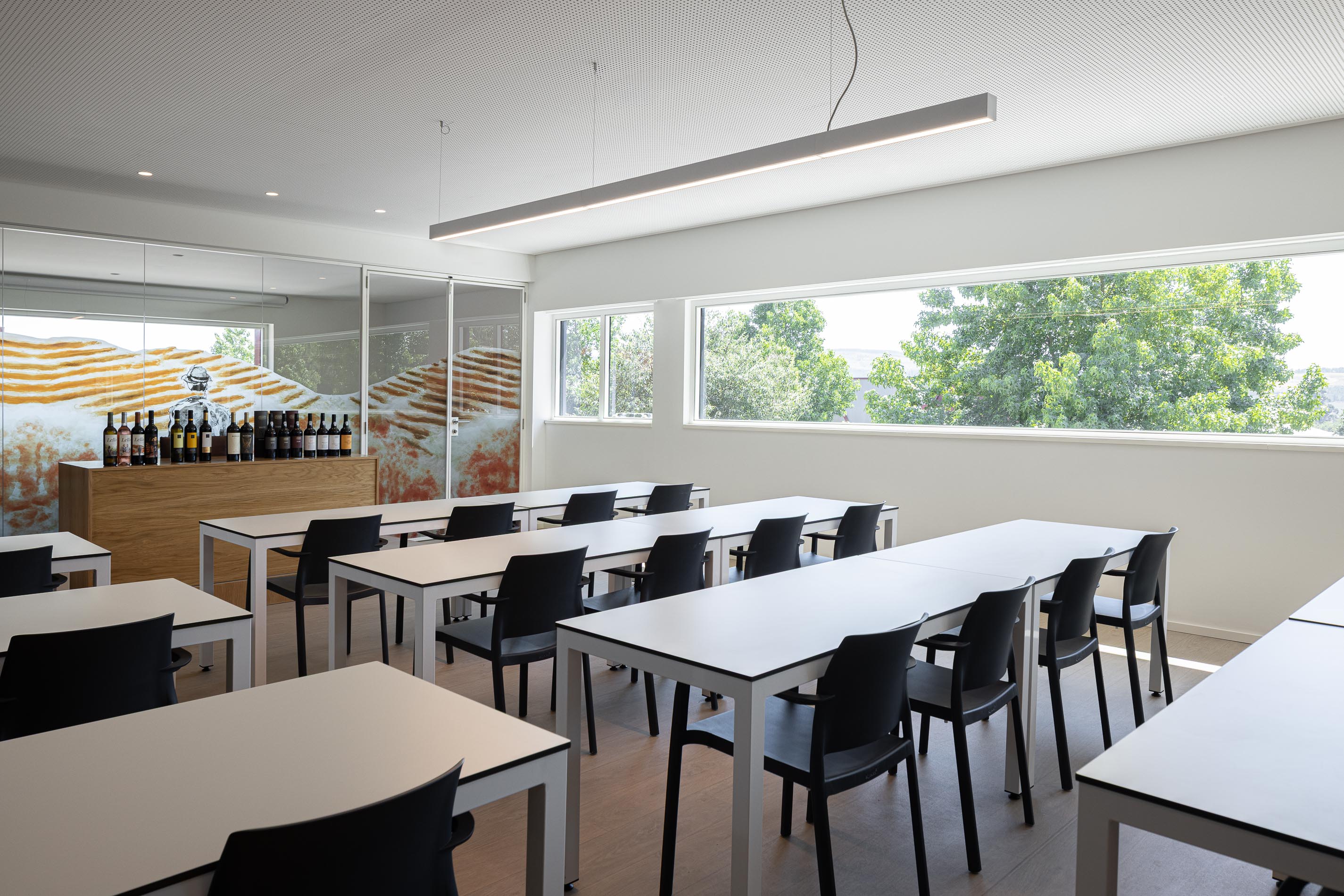 재료는 이 프로젝트의 첫 번째 건축적 제스처이다. 지역에서 채취한 편암은 건물 일부를 감싸며 도루의 계단식 포도밭을 연상시키고, 금속 패널은 와인의 깊은 색조를 닮은 톤으로 마감되어 풍경의 빛을 반사한다. 대형 유리면은 건물을 외부로 개방하며, 내부 생산 공간과 계곡의 풍경이 시각적으로 교차하도록 한다. 건물은 닫힌 산업 시설이 아니라, 풍경과 대화하는 존재로 작동한다.