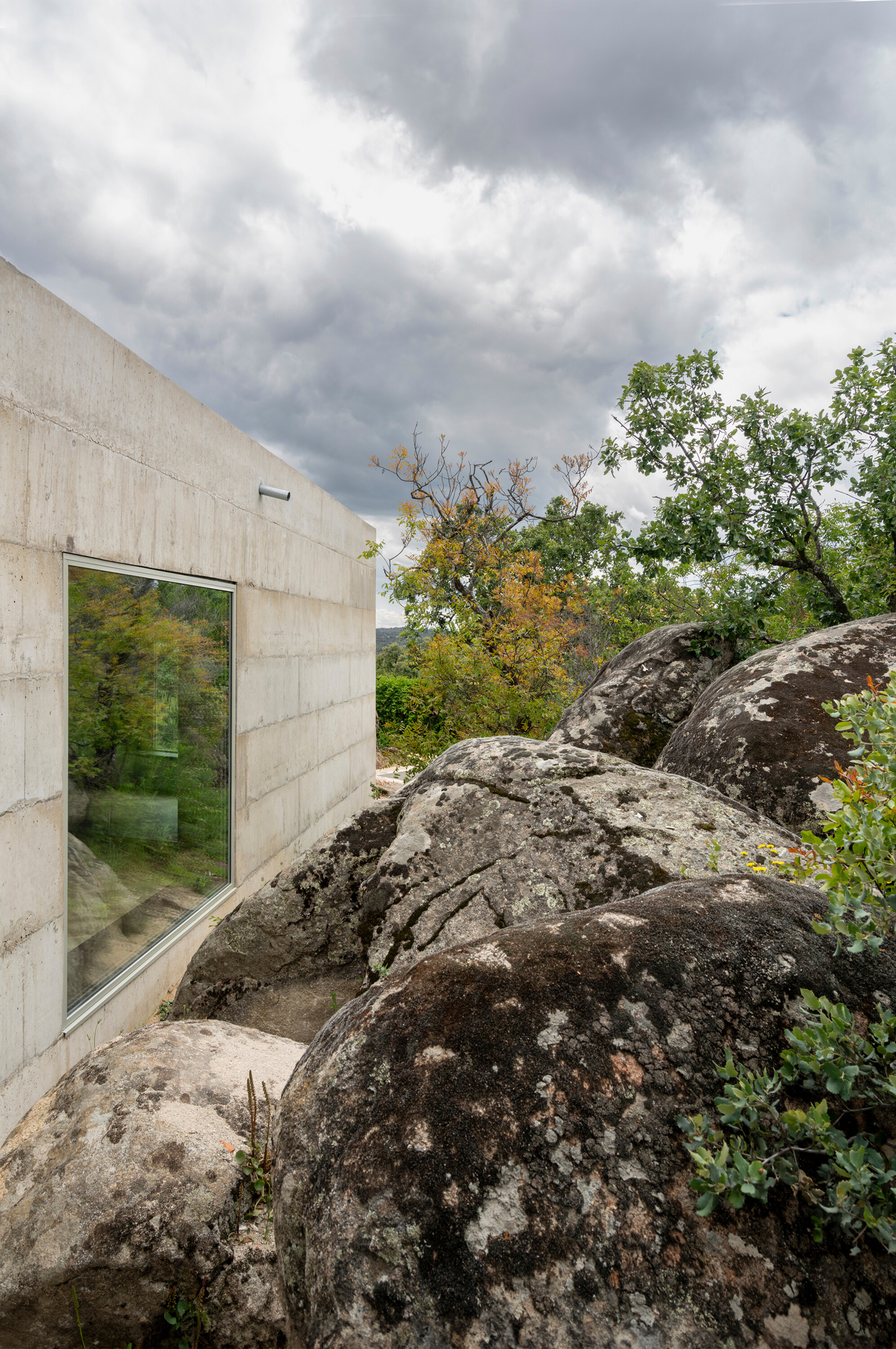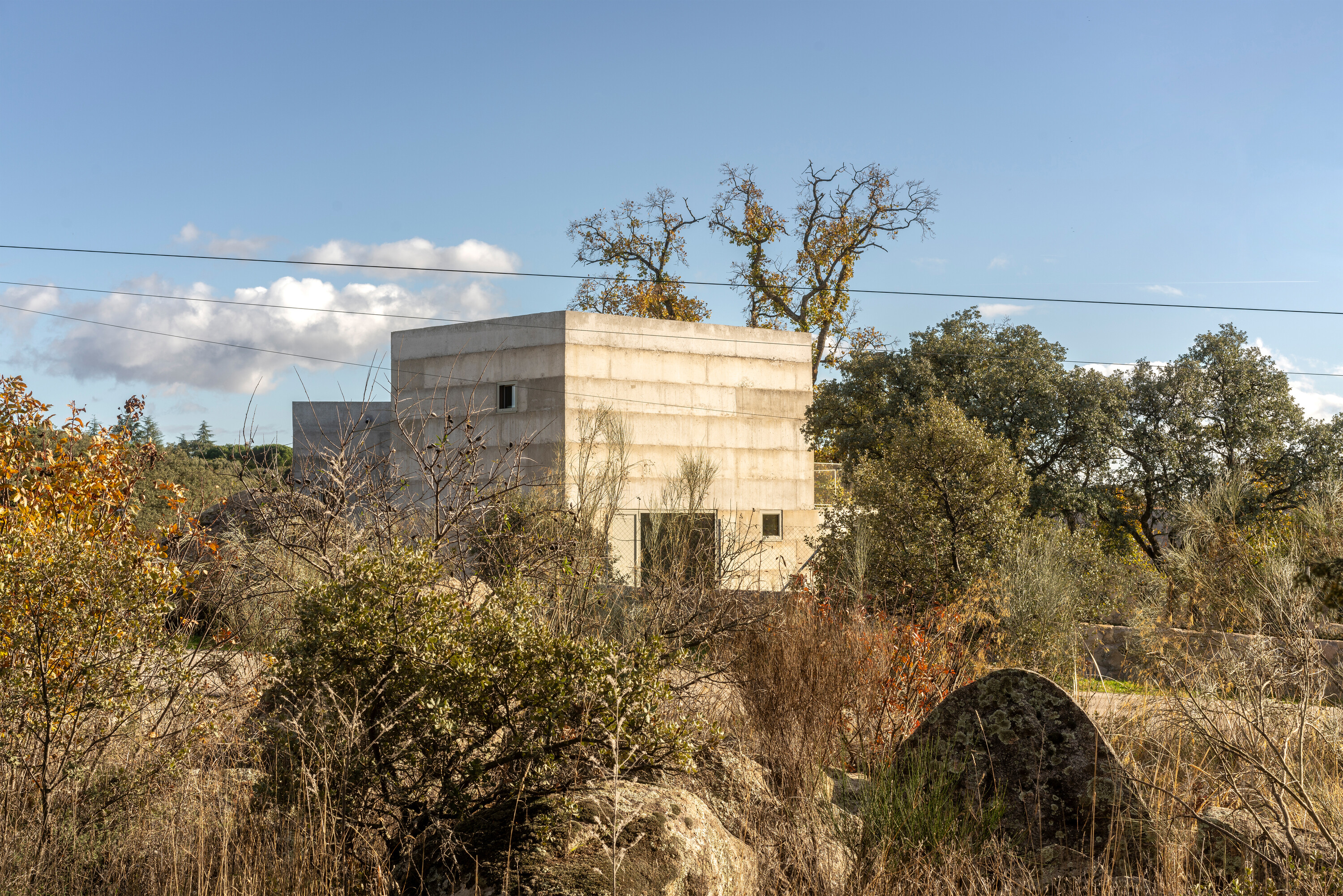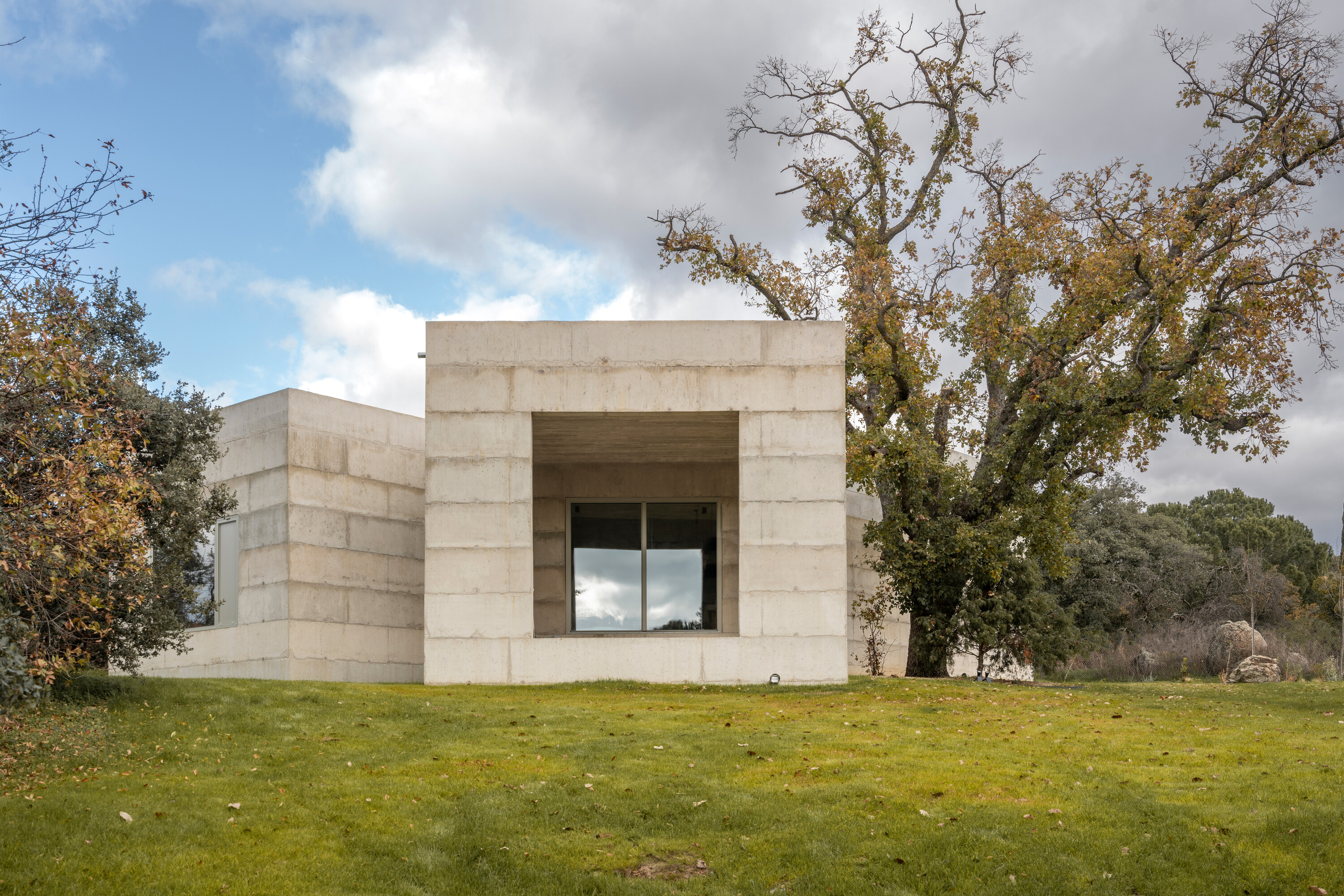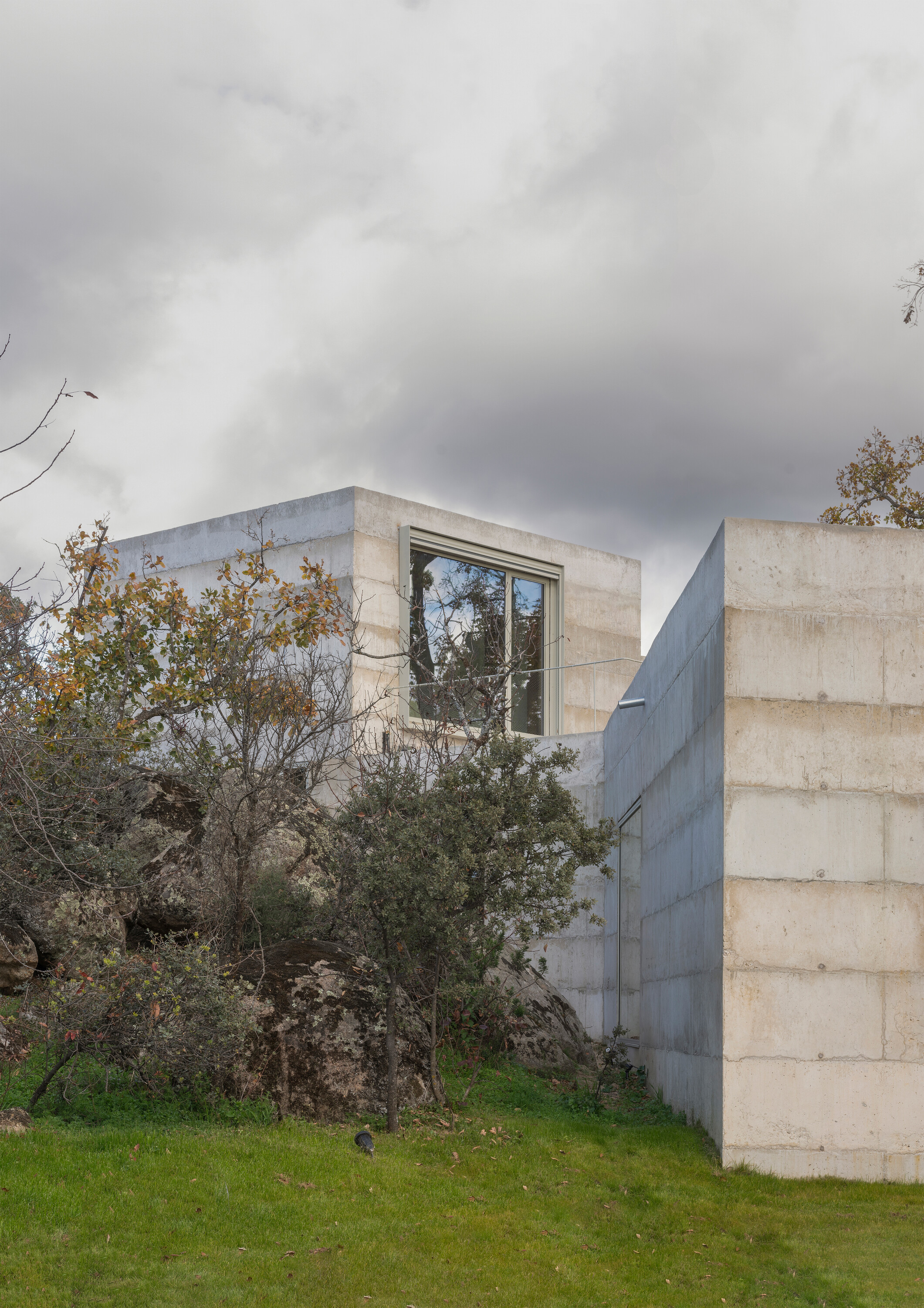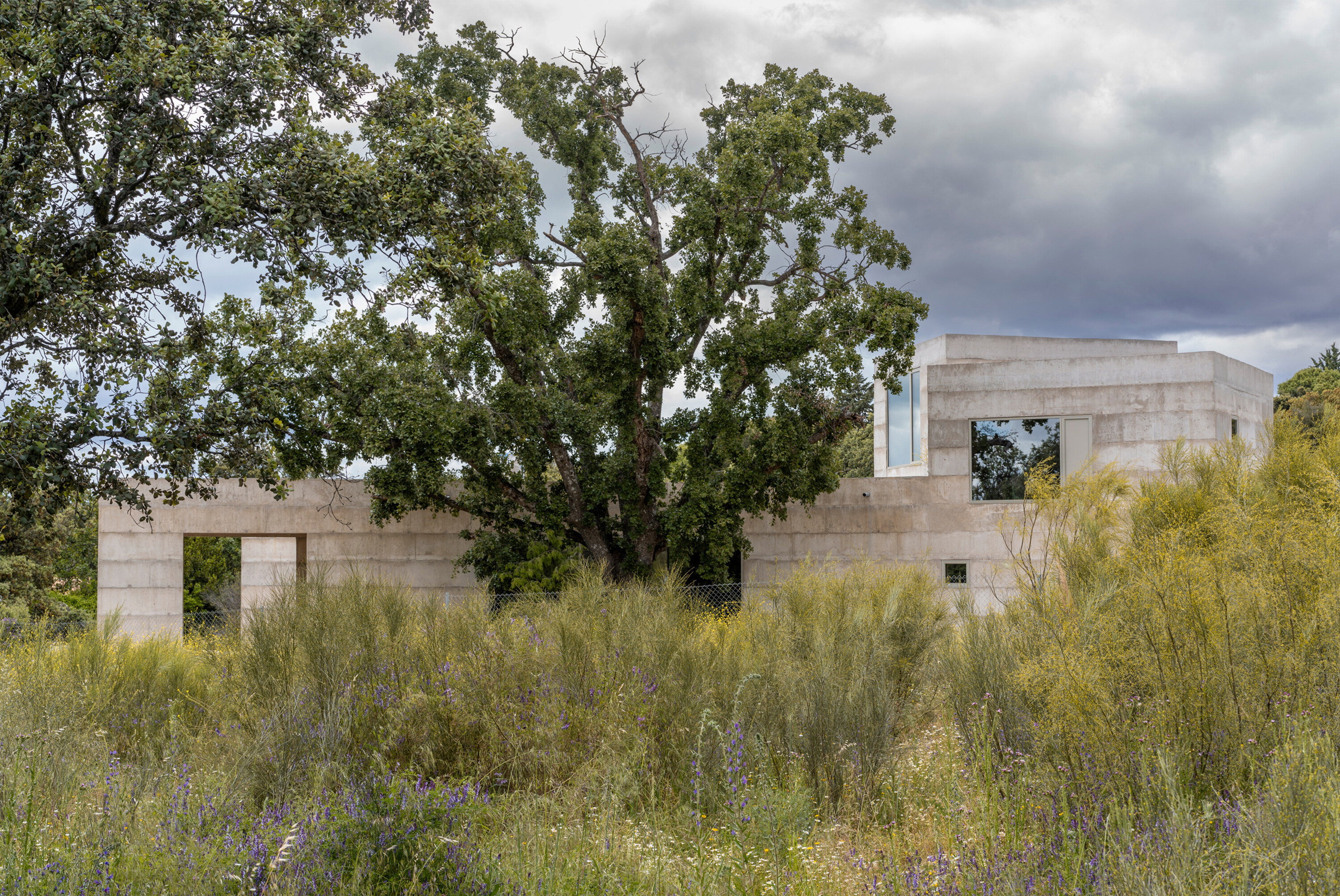 대지는 완만한 경사를 이루는 암반 지형 위에 자리한다. 수백 년 된 참나무 한 그루가 중심을 이루고, 그 주변으로 홀름오크와 케르메스오크가 자생하며 거대한 화강암 바위들이 흩어져 있다. 설계는 이러한 자연 요소와의 긴장 속에서 출발했다. 카스티야 고원의 고대 요새와 포르투갈 몬산투의 주택에서 영감을 받아, 주택은 주변 암석과 수목 사이에 자리 잡는 X자형 평면으로 계획되었다. 이 평면은 거친 지형에 스며들 듯 배치되며, 내부에서 자연을 다양한 각도로 프레이밍한다.