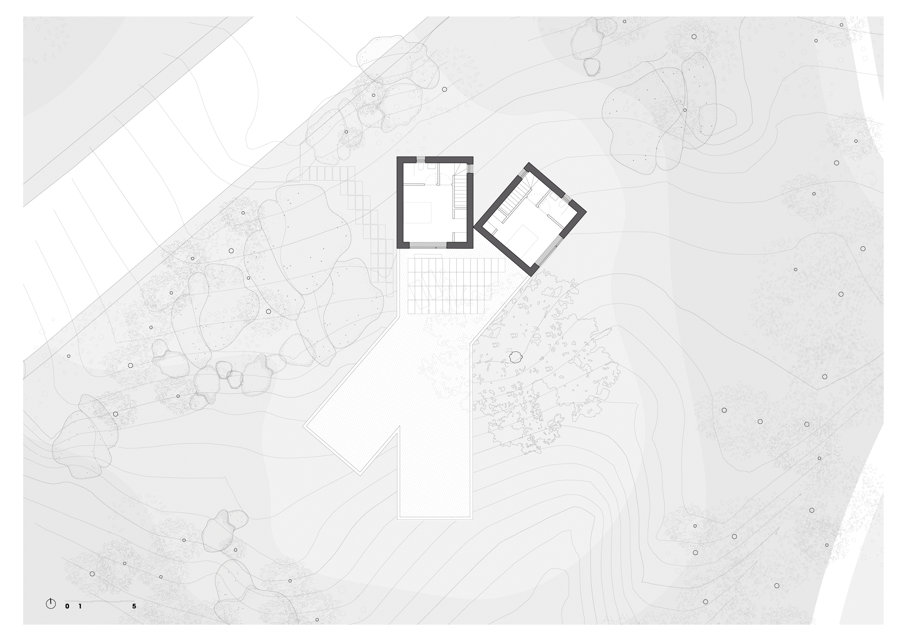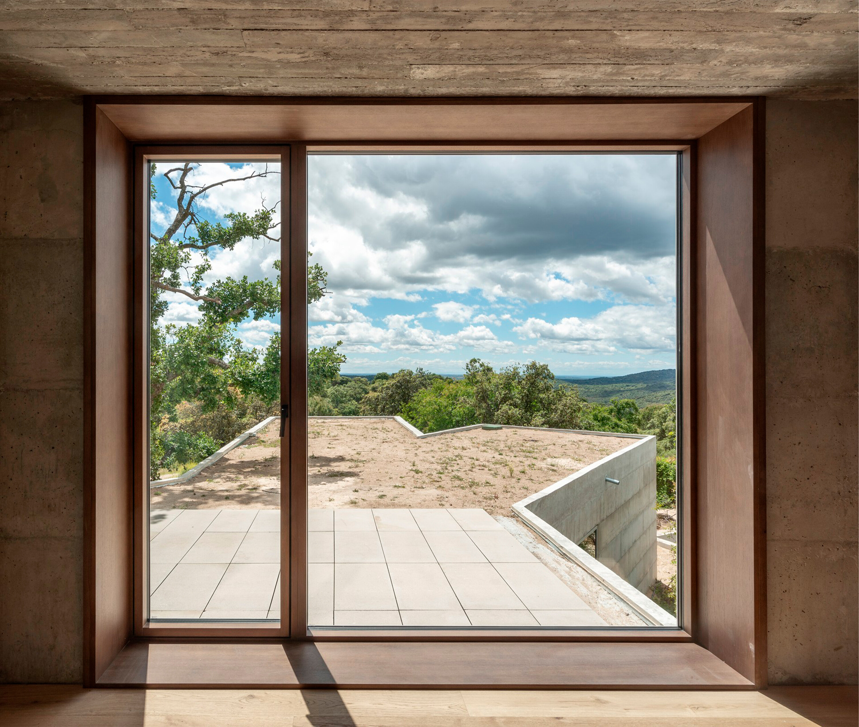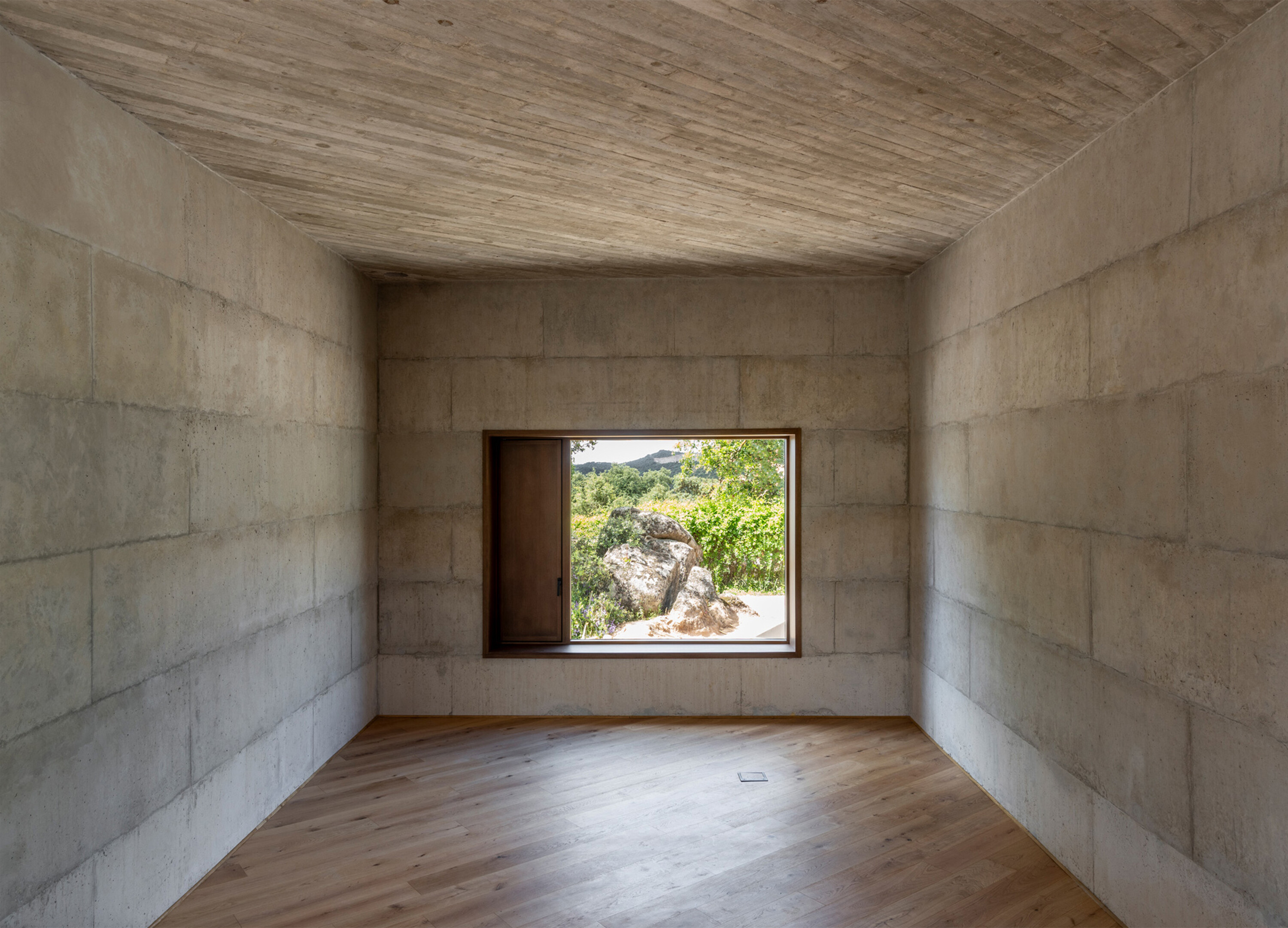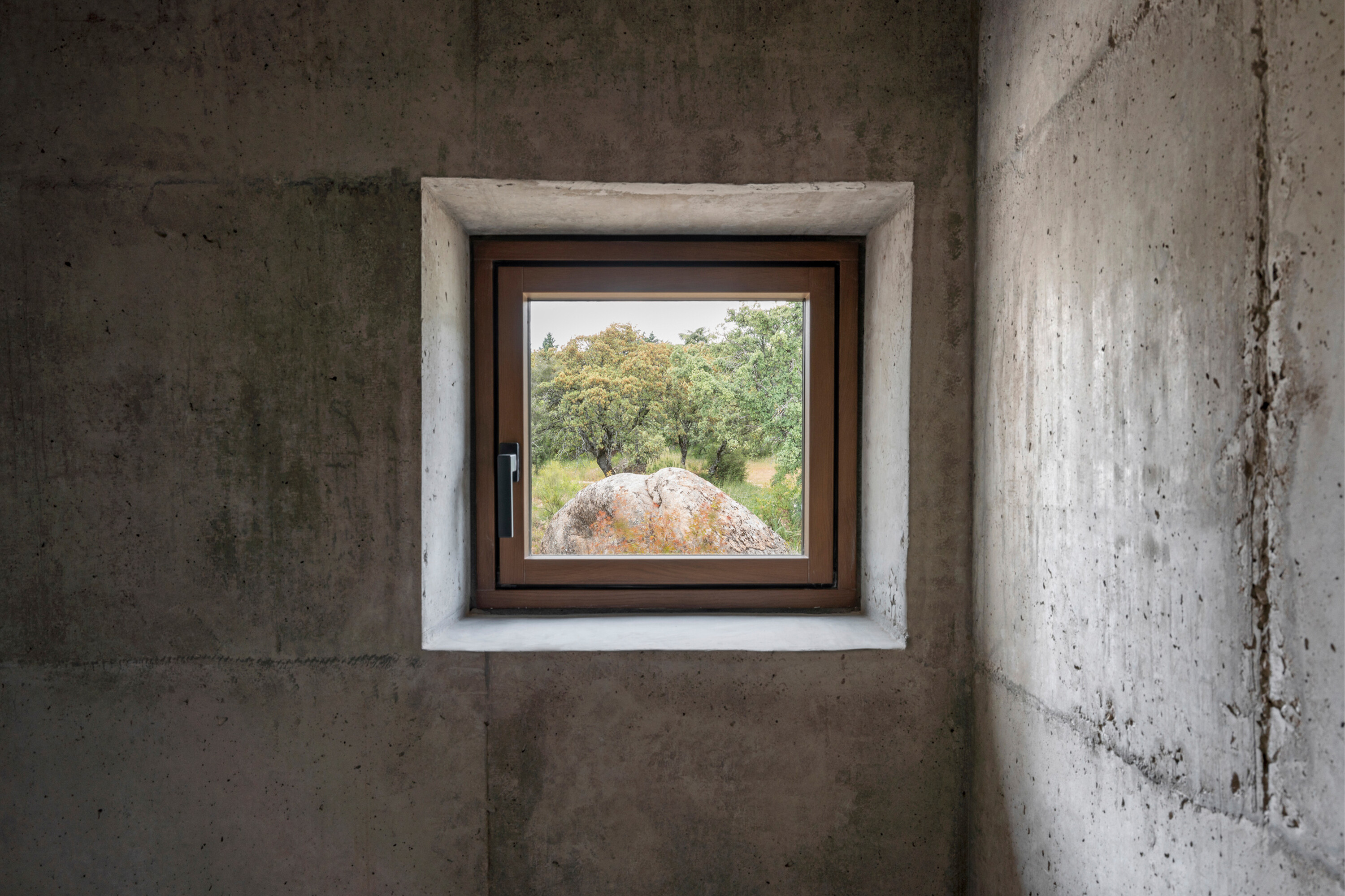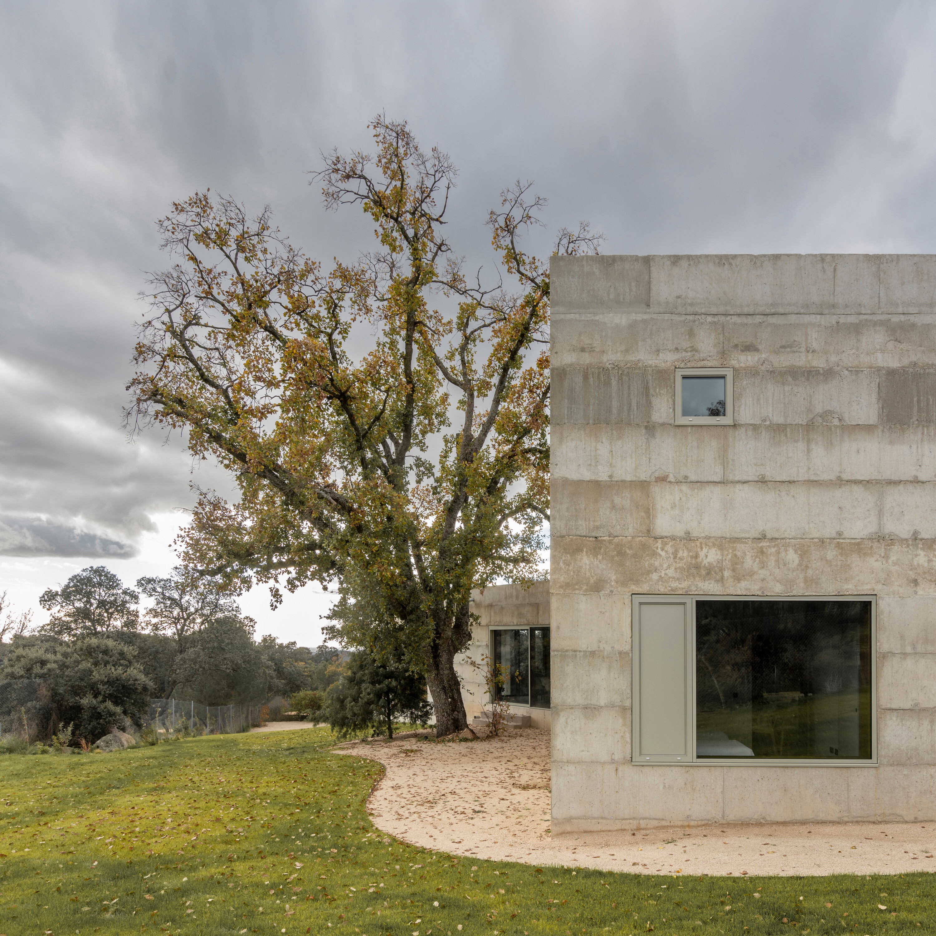 대지는 완만한 경사를 이루는 암반 지형 위에 자리한다. 수백 년 된 참나무 한 그루가 중심을 이루고, 그 주변으로 홀름오크와 케르메스오크가 자생하며 거대한 화강암 바위들이 흩어져 있다. 설계는 이러한 자연 요소와의 긴장 속에서 출발했다. 카스티야 고원의 고대 요새와 포르투갈 몬산투의 주택에서 영감을 받아, 주택은 주변 암석과 수목 사이에 자리 잡는 X자형 평면으로 계획되었다. 이 평면은 거친 지형에 스며들 듯 배치되며, 내부에서 자연을 다양한 각도로 프레이밍한다.