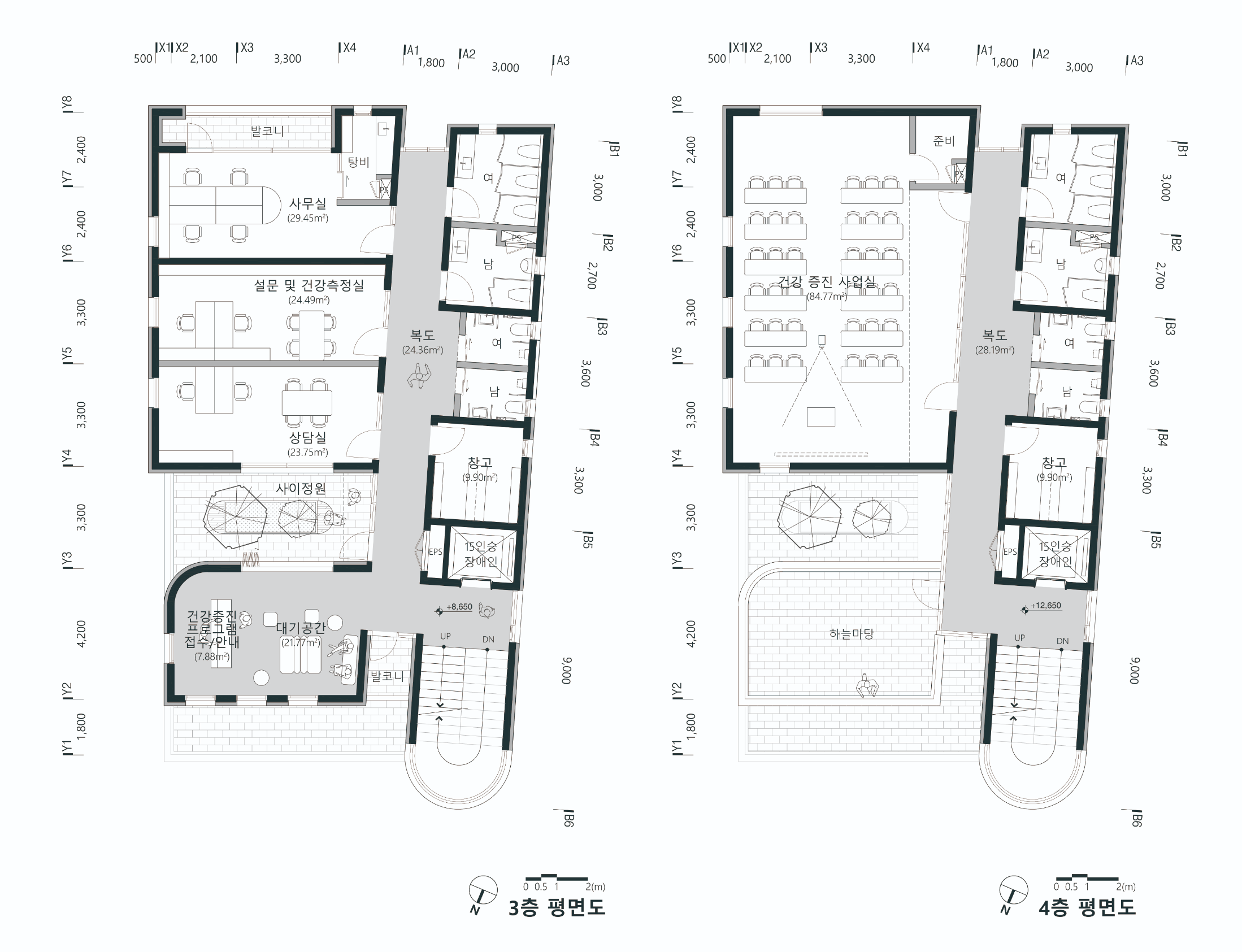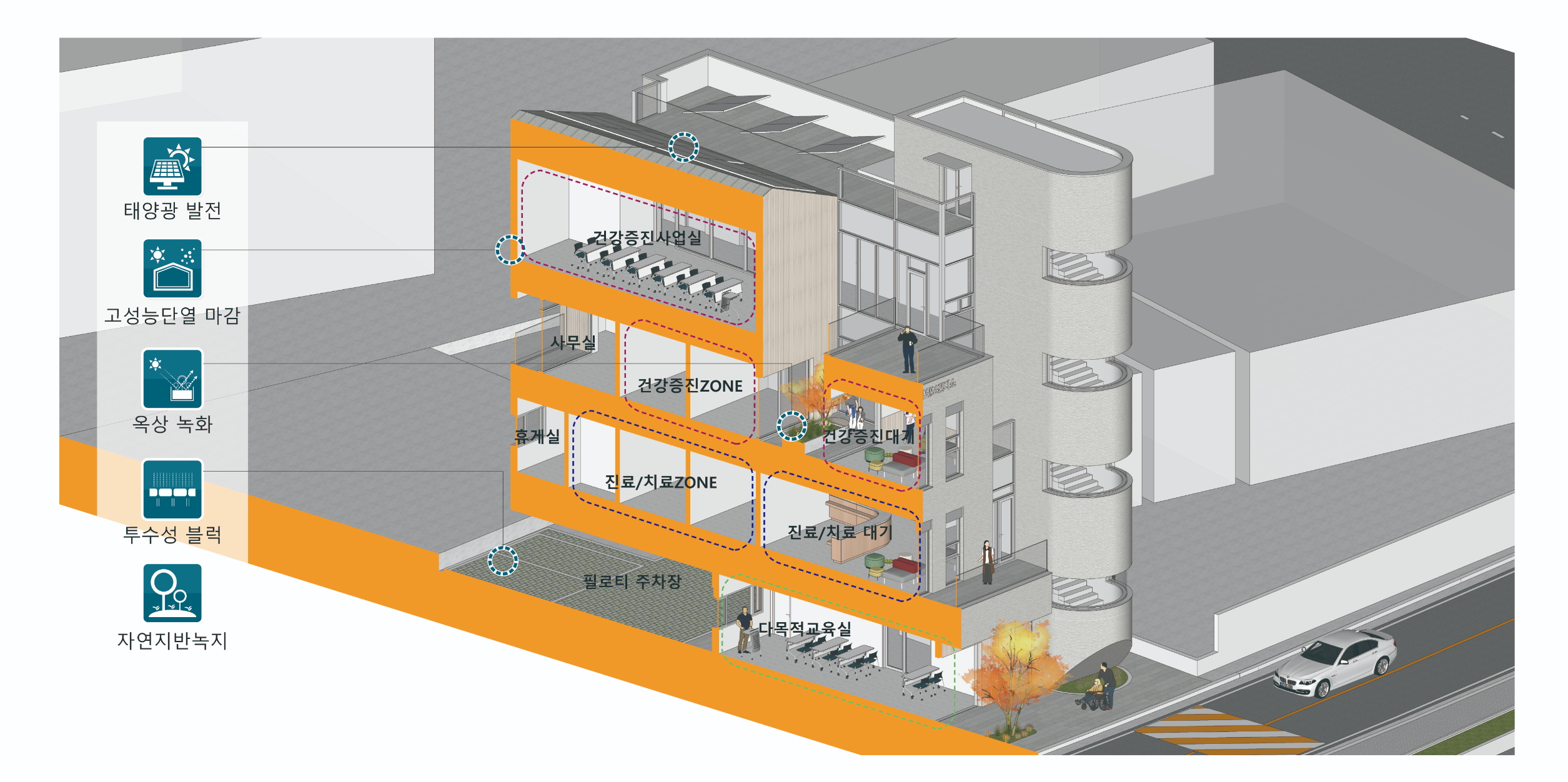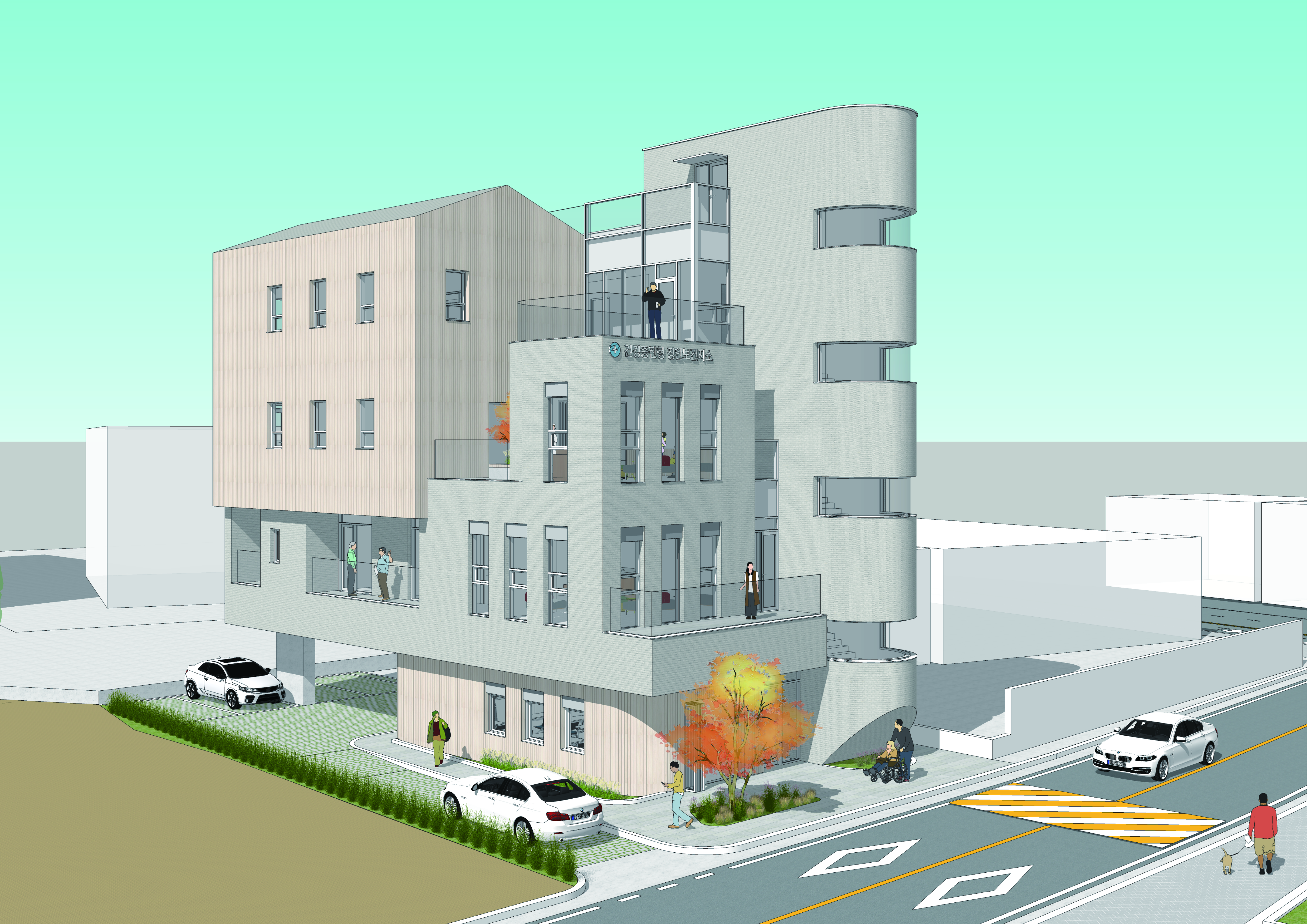 장안보건지소는 진료의 기능과 더불어 건강증진 기능을 아우르며 행복센터와 함께 행정, 복지, 보건의 통합 거점으로써 기능할 것이기 때문에 단독건물로 설계하는 것이 아니라 행복센터와 하나의 단지로 생각하고 접근한다. 그렇기 때문에 신축중인 행복센터의 반복되는 바코드 타입 입면구성은 단지 전체를 통일시킬 수 있는 디자인 언어라고 생각하여 건물의 상당부분은 내부 기능을 고려해 바코드 타입으로 풀어나갔고 계단실과 일부 모서리부분은 곡선으로 처리하여 시각적 변주를 주었다.