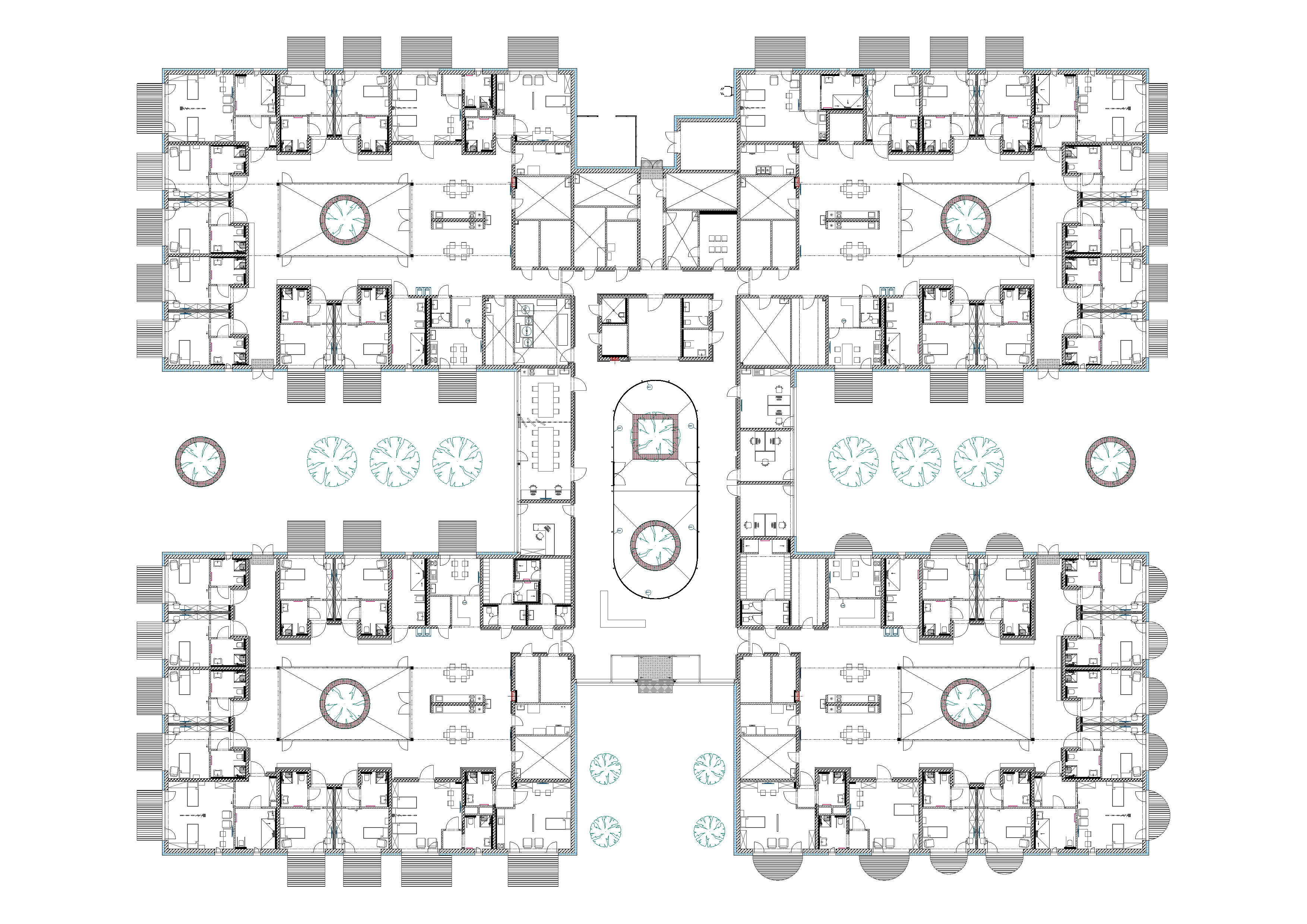 공간 구성의 핵심은 내부 아트리움이다. 각 하우스홀드는 중앙에 정원을 품고 있으며, 복도는 이 정원을 둘러싸듯 배치된다. 긴 직선 복도를 최소화하고, 내부 정원을 중심으로 컴팩트하게 구성함으로써 동선은 짧고 직관적으로 정리된다. 모든 객실은 전용 욕실과 현관, 작은 테라스를 갖추고 있어 외부와 직접 연결된다. 복도와 공용 공간에는 풍부한 자연광이 유입되고, 내부는 정원과 시각적으로 밀접하게 이어진다.