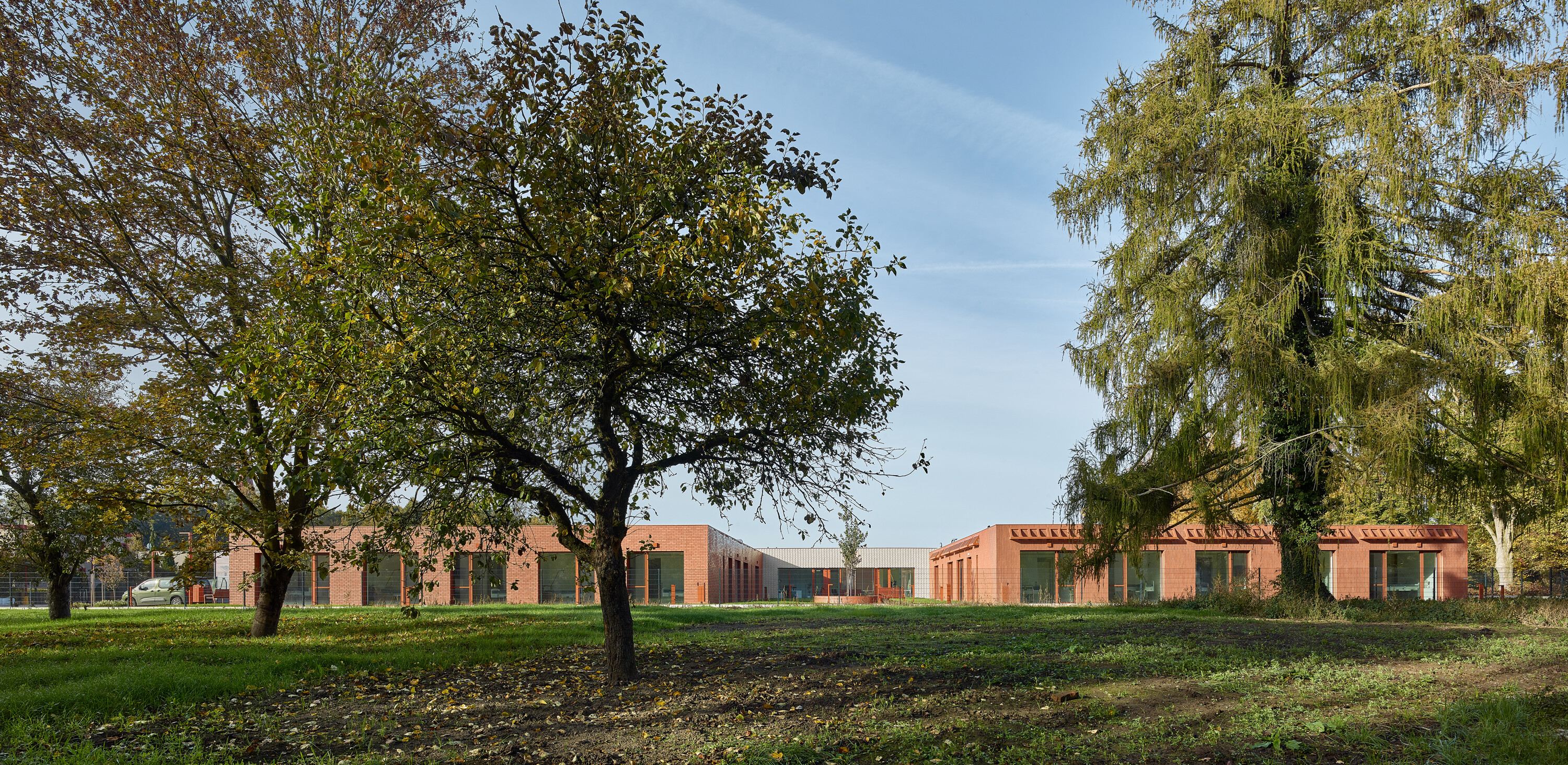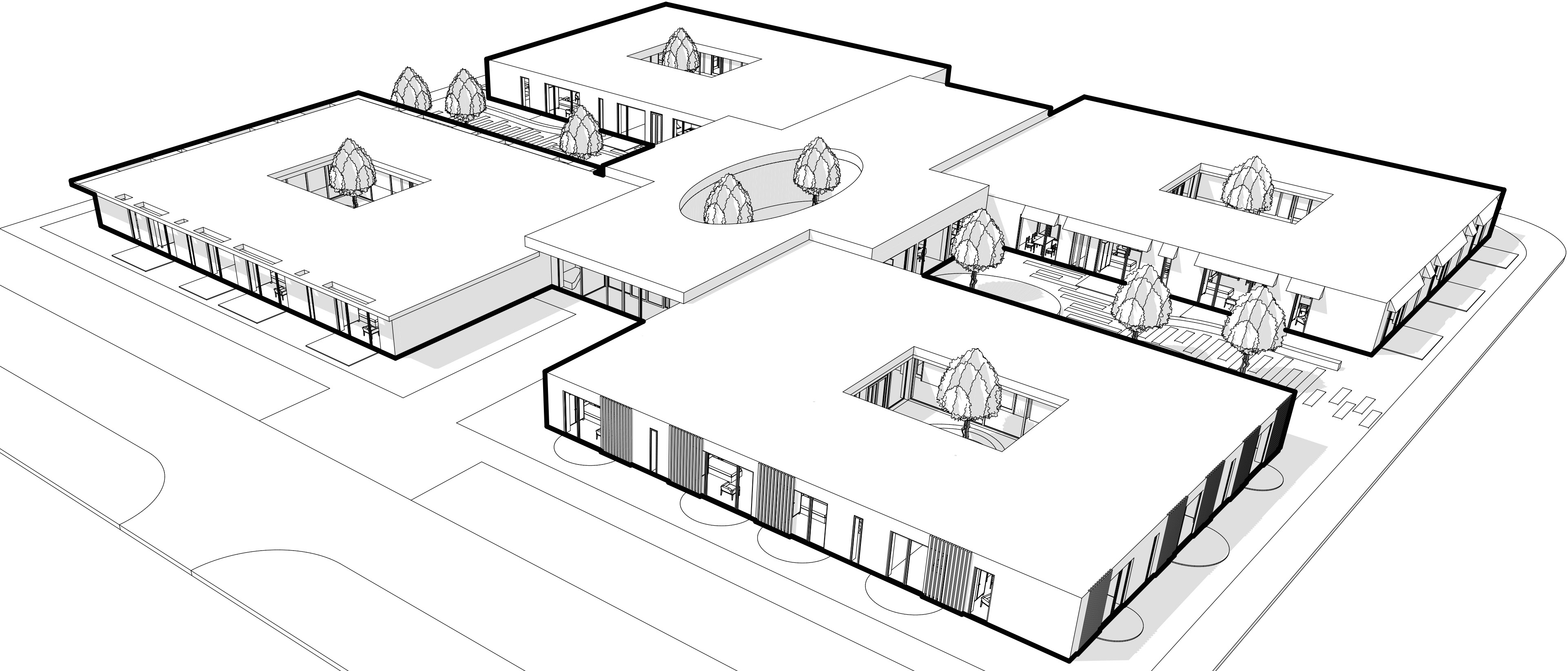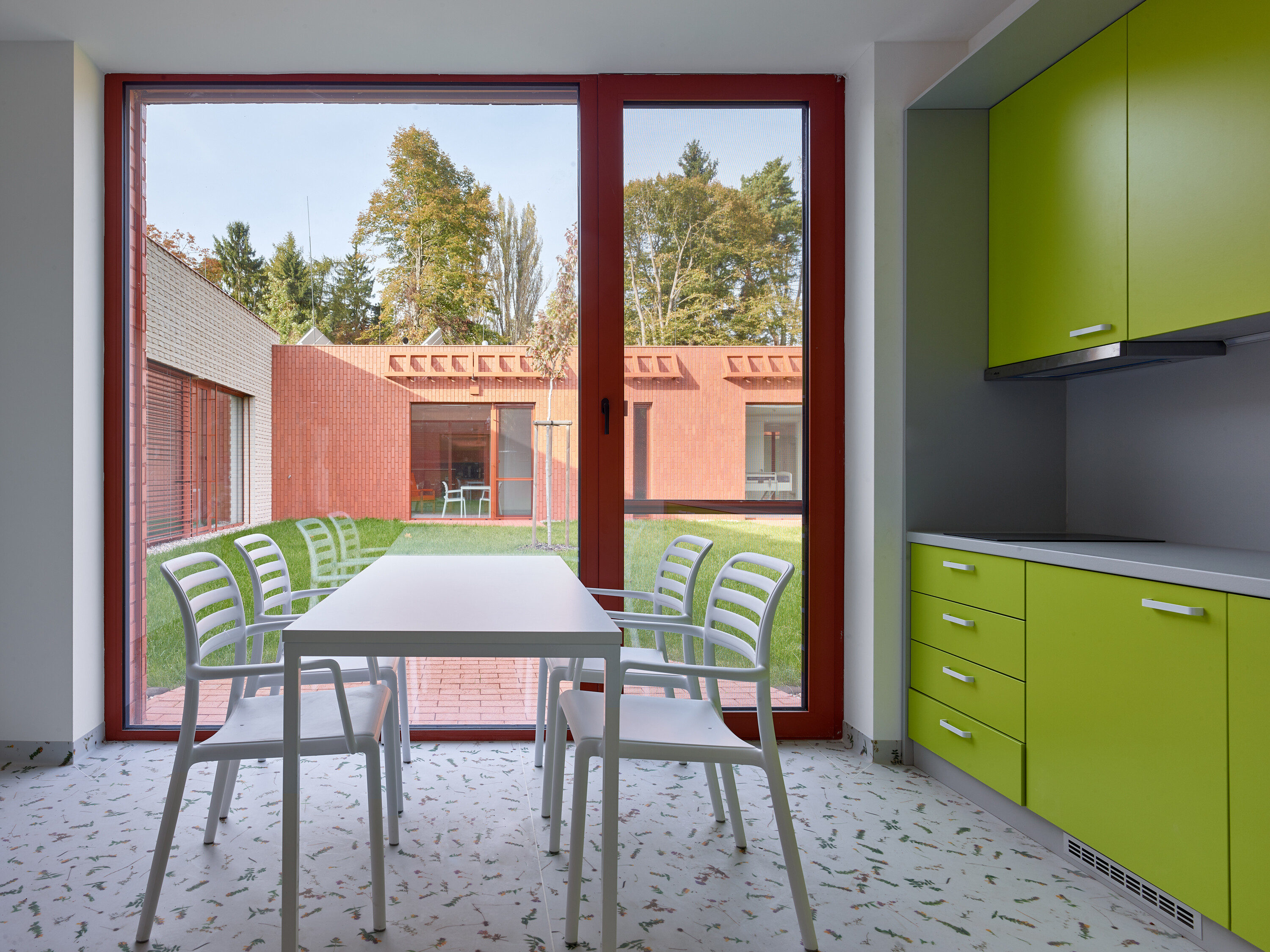 설계를 맡은 아르키텍투라(Architektura)는 약 60명의 입소자를 위한 시설을 네 개의 자립형 ‘하우스홀드’로 나누는 방식을 제안했다. 각각 15명 규모의 생활 단위는 독립적으로 운영되며, 기술실과 창고, 직원 공간을 자체적으로 갖춘다. 네 개의 하우스홀드는 중앙 코어를 통해 연결되고, 전체는 단층의 낮고 긴 매스로 구성된다. 녹지 위에 놓인 붉은 선과 같은 이 건물은 수평적으로 펼쳐지며, 주변의 평탄한 풍경과 조화를 이룬다.
