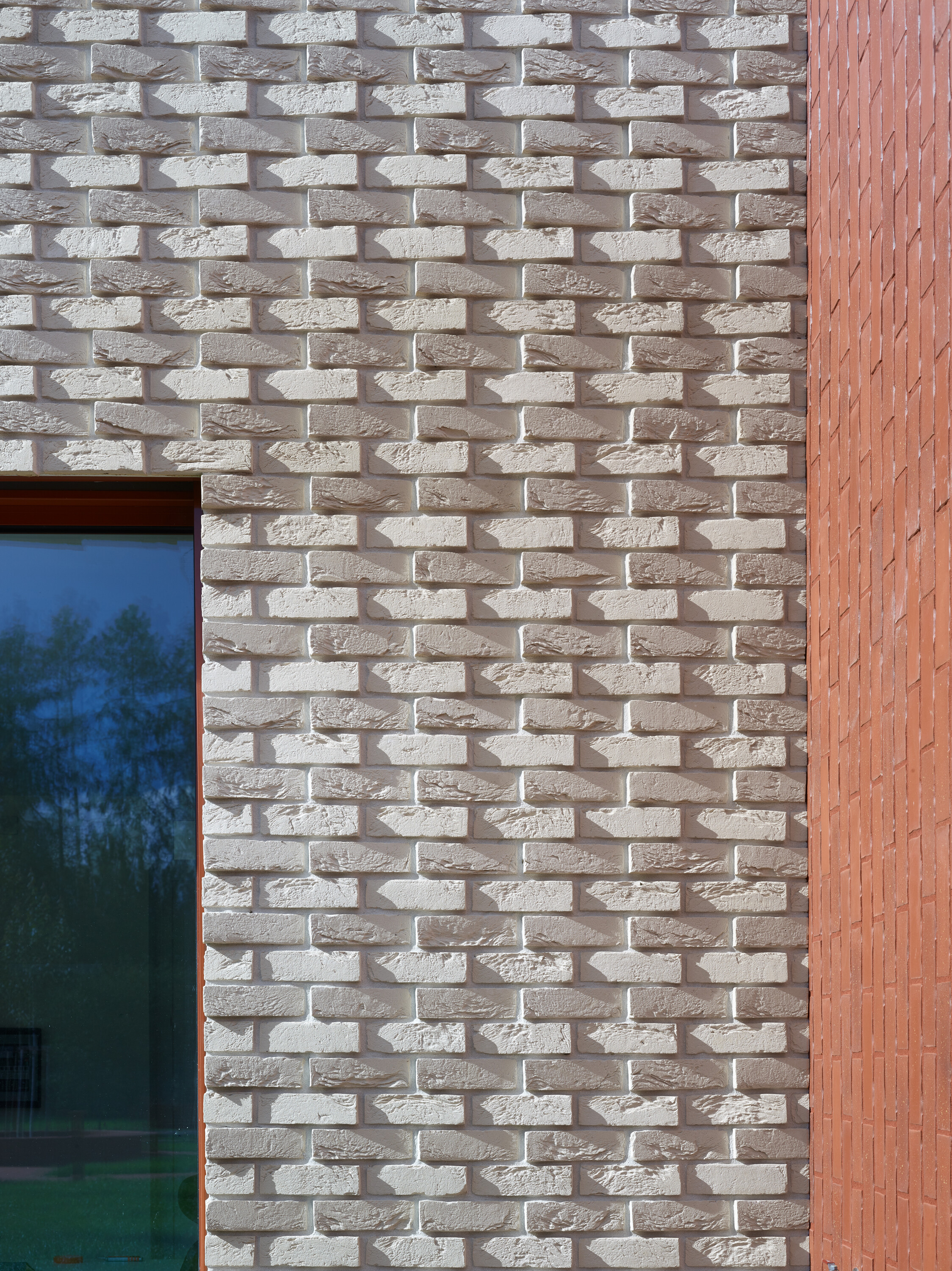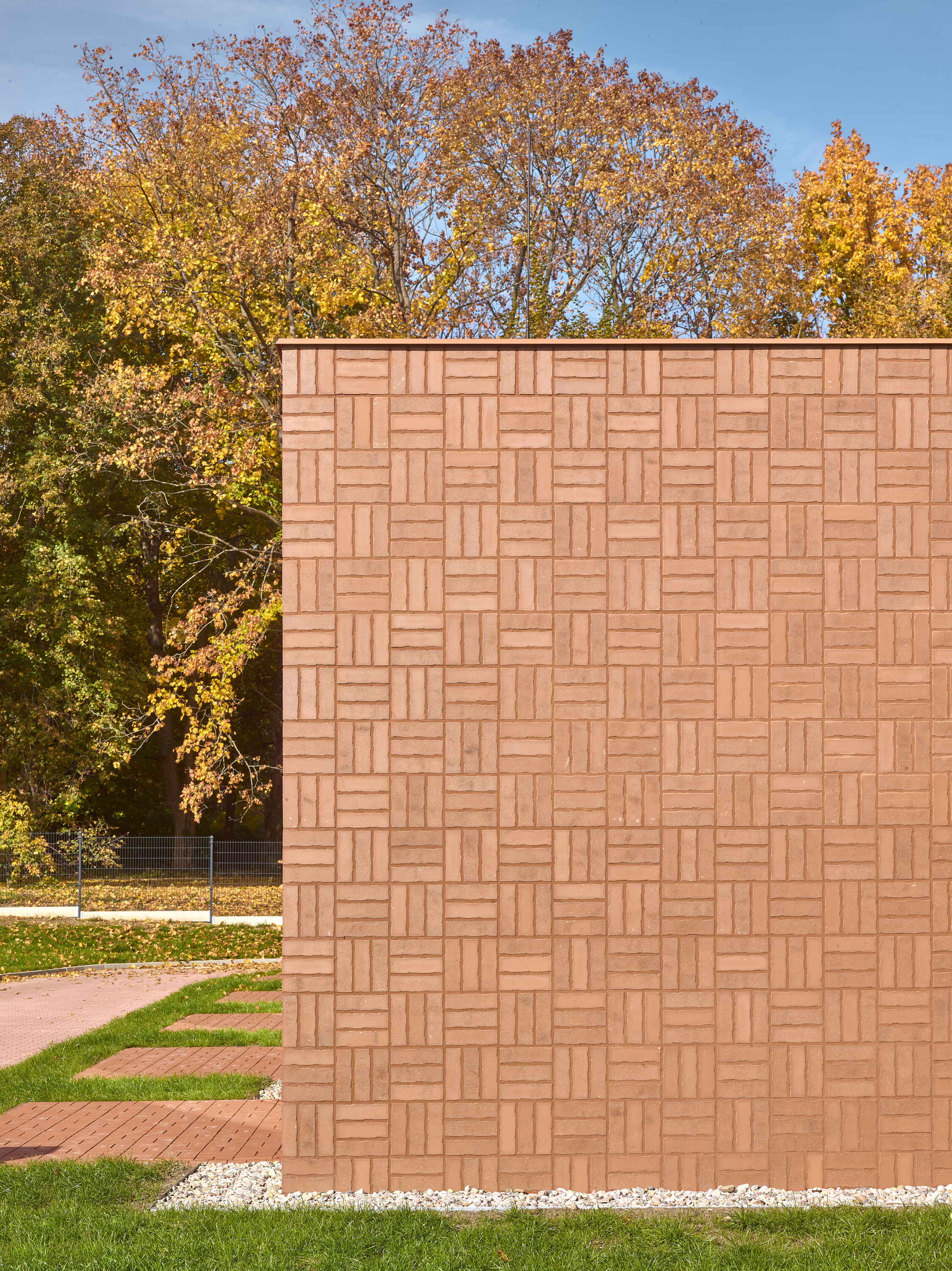 파사드는 묘지의 벽을 연상시키는 벽돌 마감으로 구성된다. 다섯 개의 큐브 형태는 모두 벽돌을 사용하지만, 줄눈 패턴과 디테일을 달리해 각각의 개성을 부여했다. 대형 프렌치 윈도우는 리듬을 형성하며 테라스로 직접 연결된다. 각 하우스홀드는 서로 다른 창 차양 구조를 통해 구분되며, 내부에서도 색과 마감으로 정체성을 강화한다.
