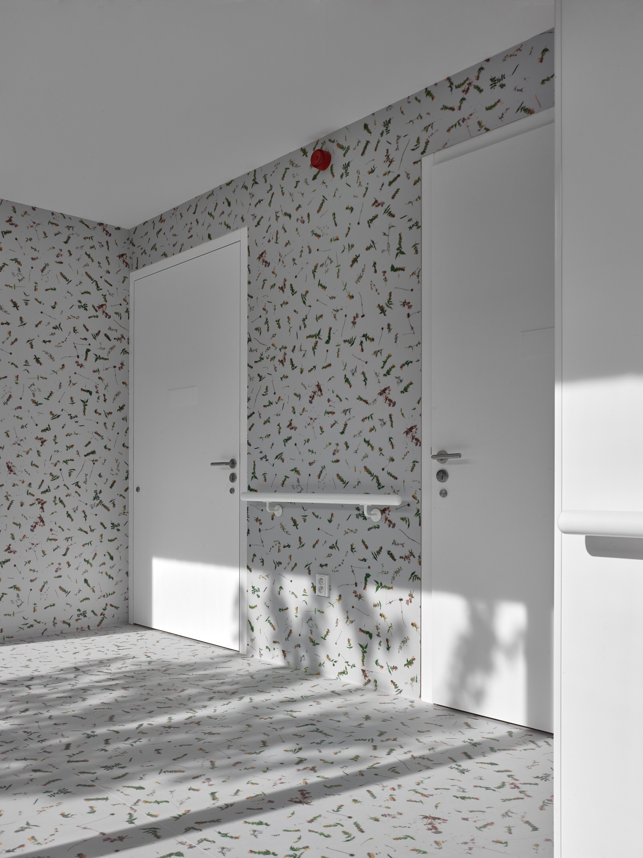 바닥은 이 프로젝트의 또 다른 특징이다. 지역의 꽃과 풀을 촬영한 이미지를 바닥재에 전사해, ‘트라비노바’, ‘헤르만코바’, ‘팜펠리슈코바’ 등 각 하우스홀드의 이름과 연결했다. 꽃과 식물의 패턴은 출입구까지 이어지며, 건물의 규모를 부드럽게 분절하는 장치가 된다.