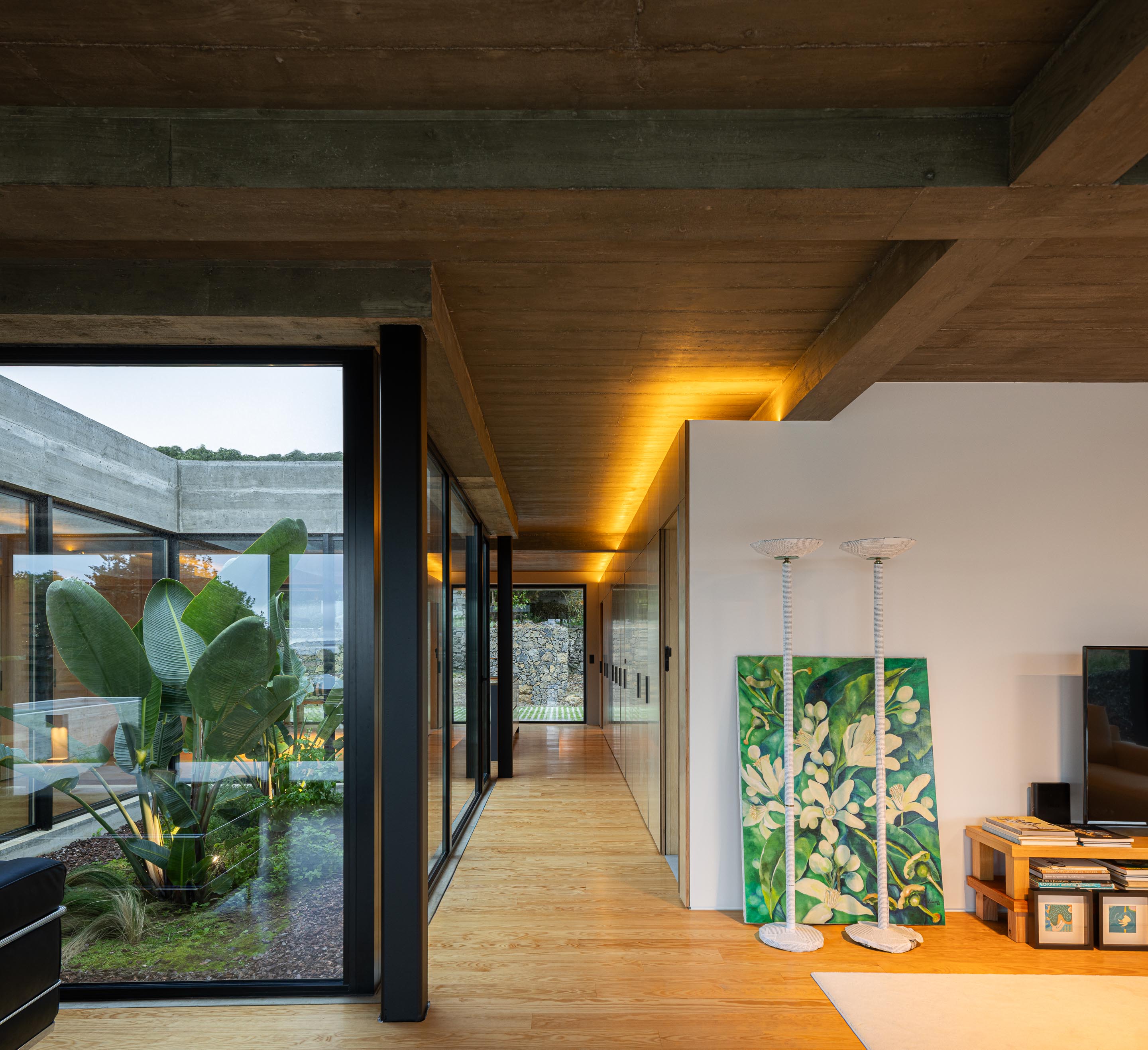 실내는 목재 마감으로 구성되어 따뜻한 분위기를 형성한다. 자연 요소는 단순히 외부 풍경에 머물지 않고, 내부 재료를 통해 일상의 일부가 된다. 공간은 명확하고 연속적이다. 어느 지점에서든 외부와 중정, 그리고 수평선이 시야에 들어온다. 시선은 막히지 않고 흐른다.